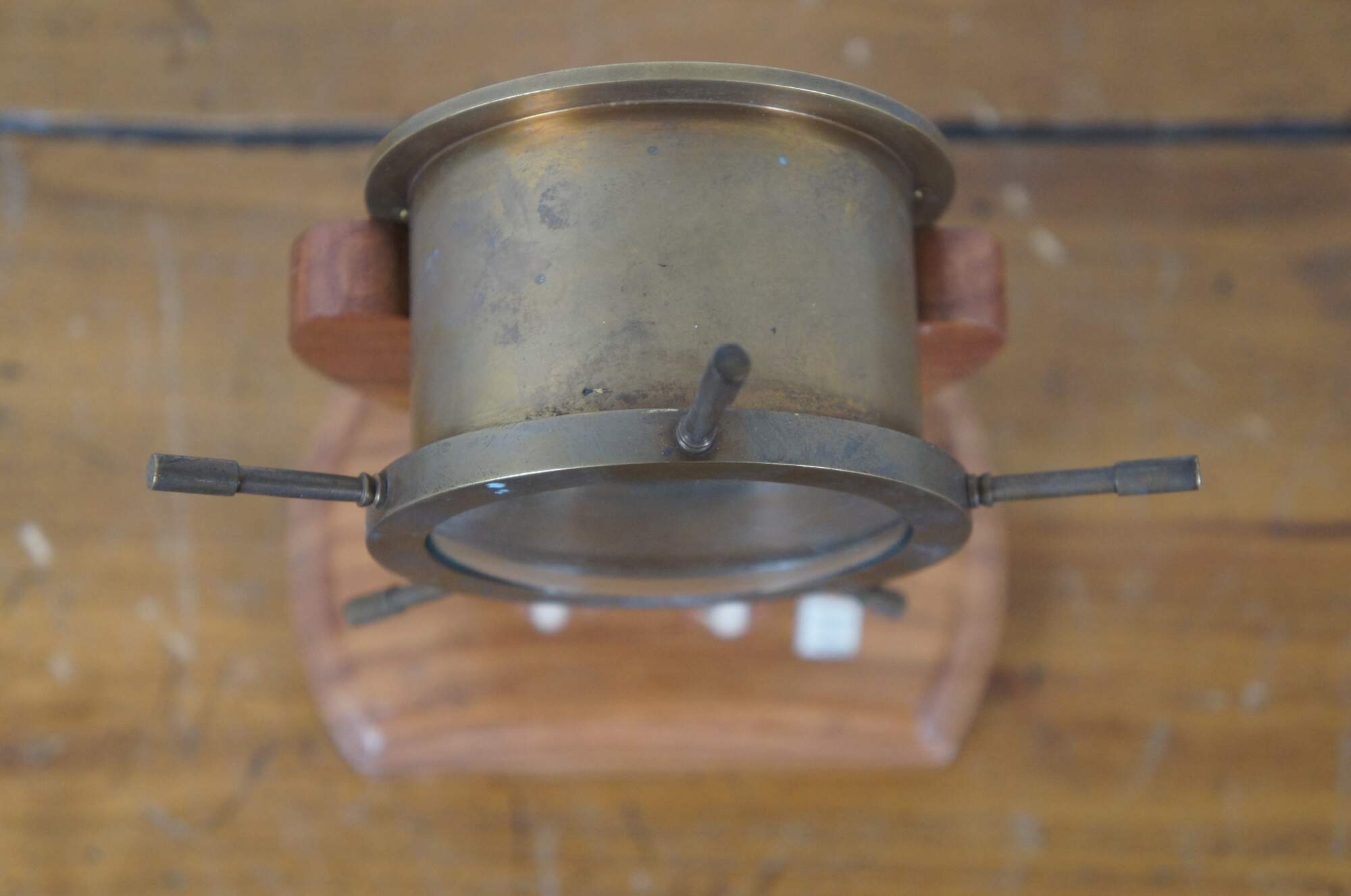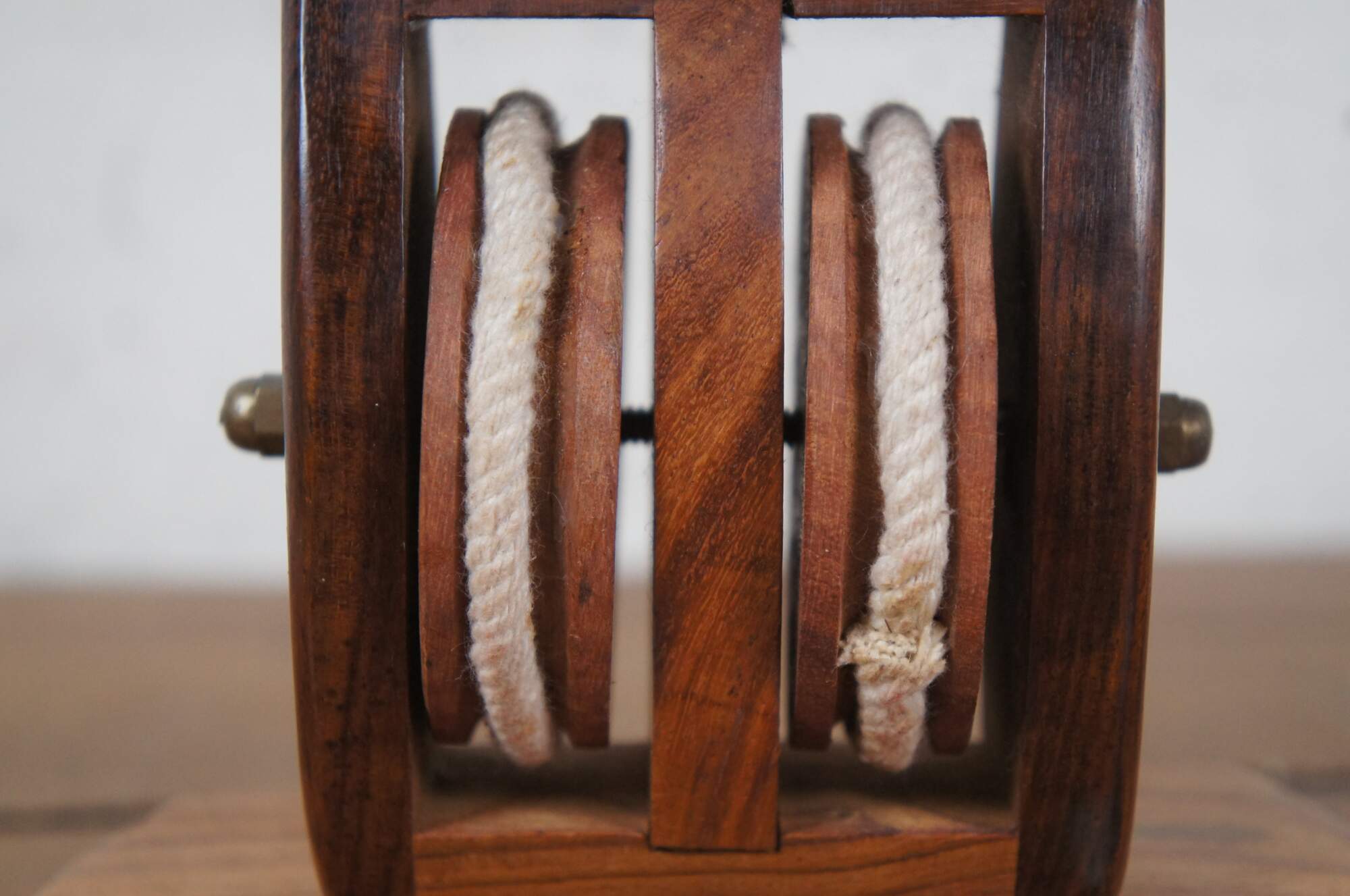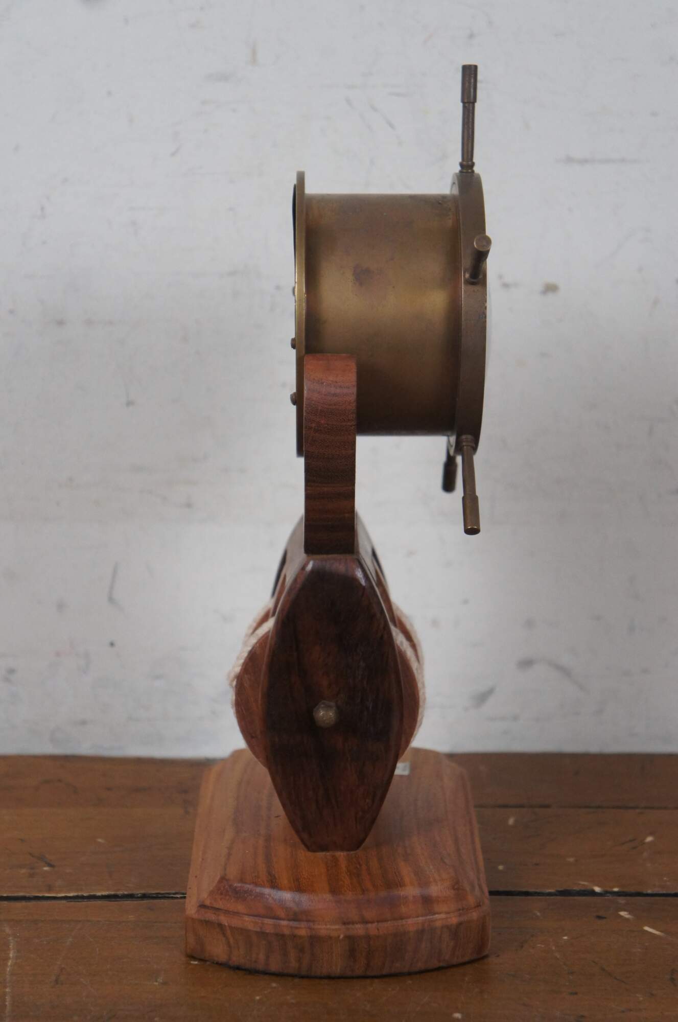 Late 20th century desk clock in the shape of a brass ship's wheel / helm, mounted on a wooden double pulley base. White face with Roman numerals, marked London. Prestige Quartz battery operated movement. Made in India.