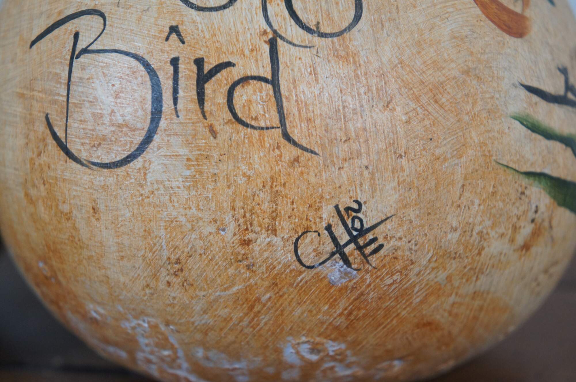 Lot of five late 20th century native Southwestern folk art hand painted gourds. Variety of colors and pattern motifs including a snake and a Pueblo Bird. Two signed CH 2011.