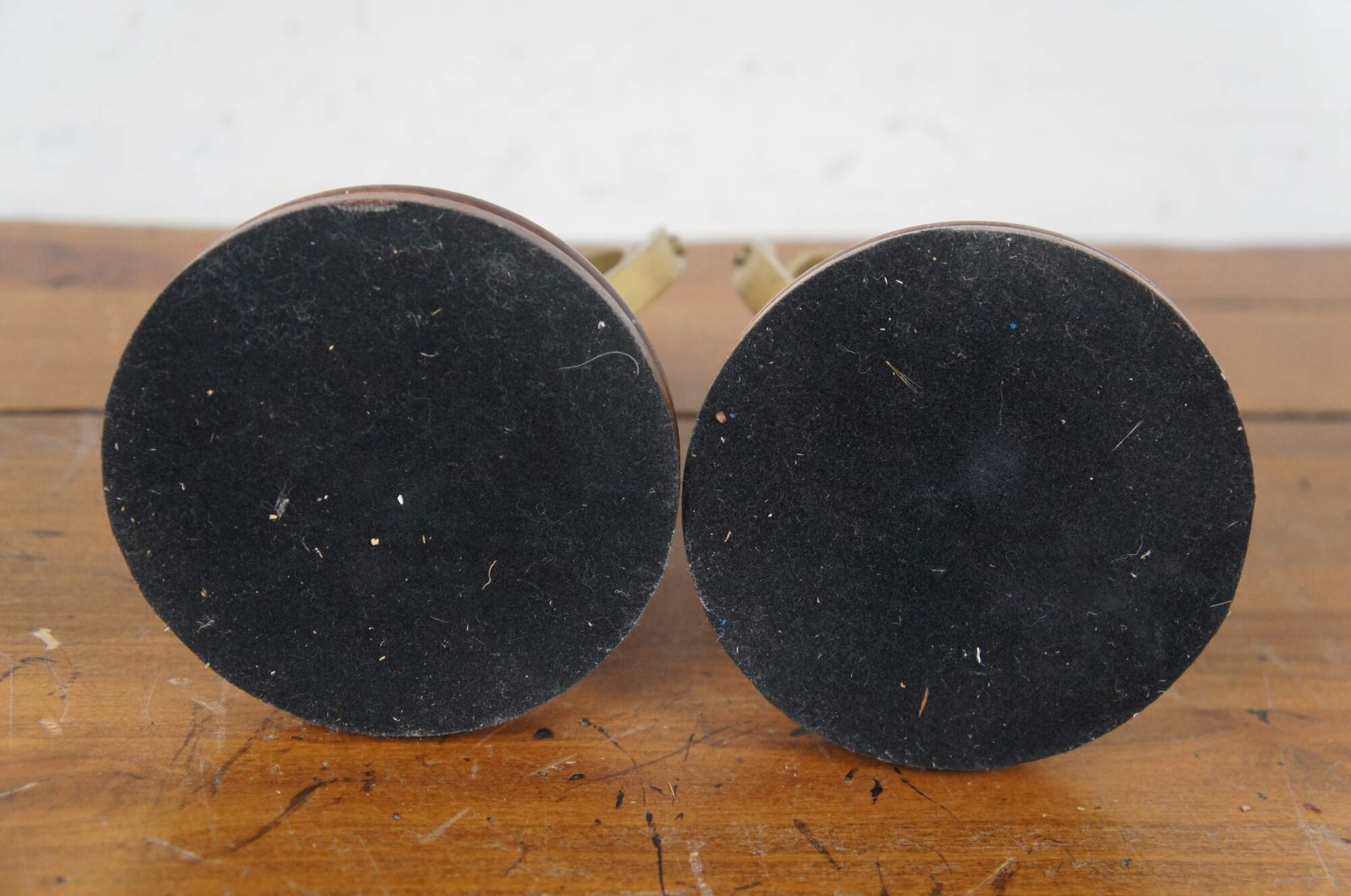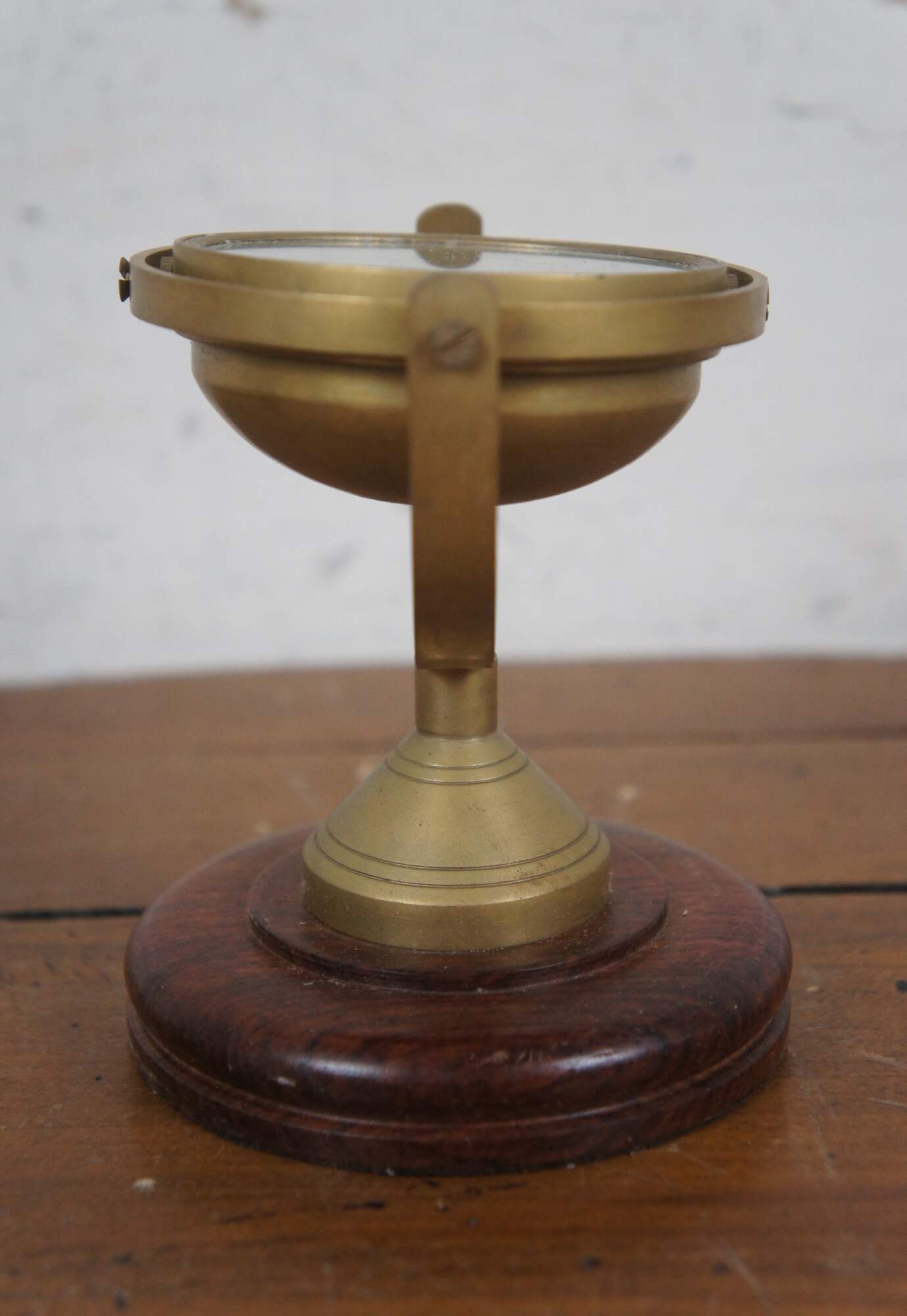 Pair of late 20th century free standing brass swiveling / gimbal nautical compasses on wood pedestal stands.