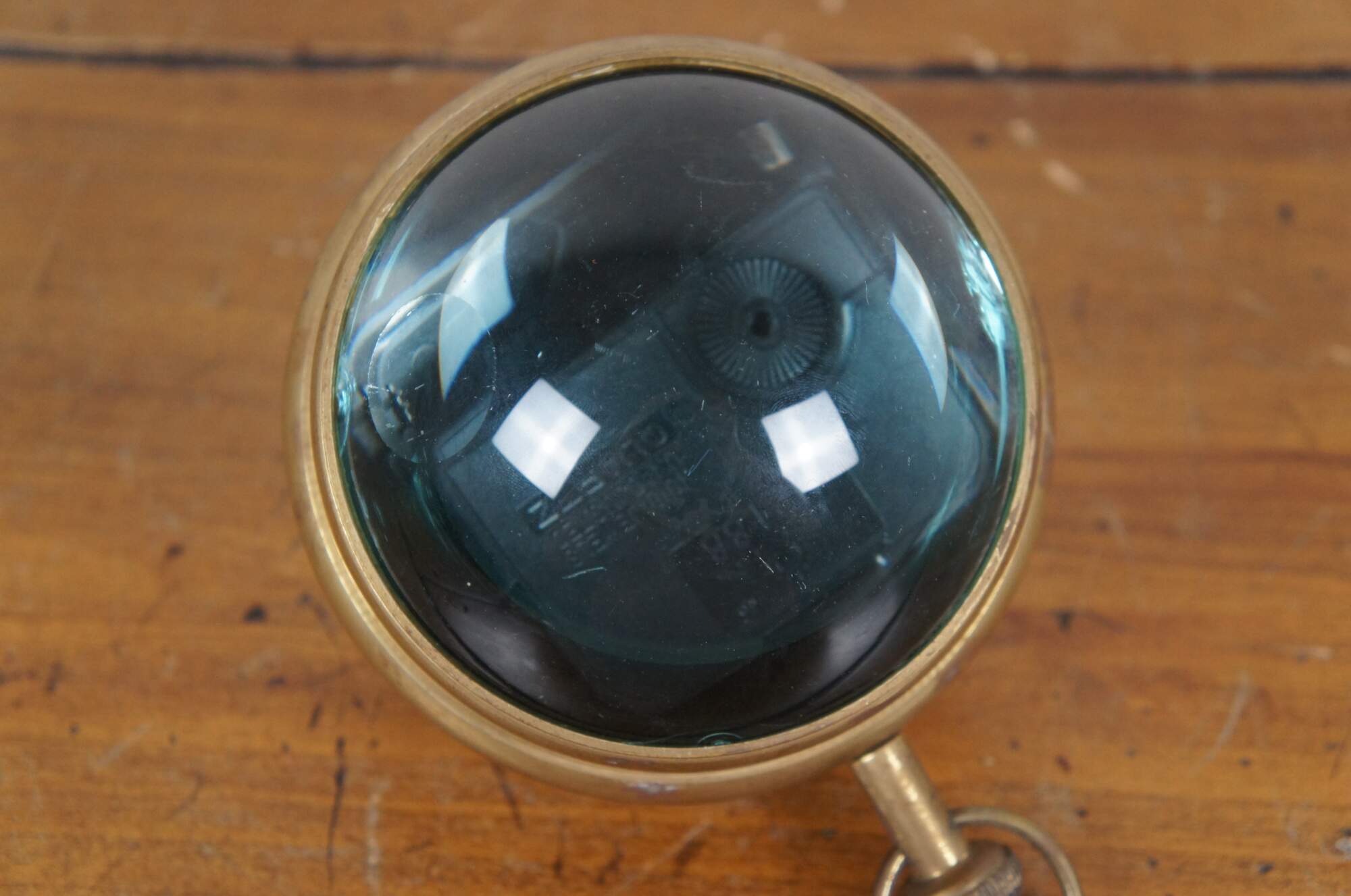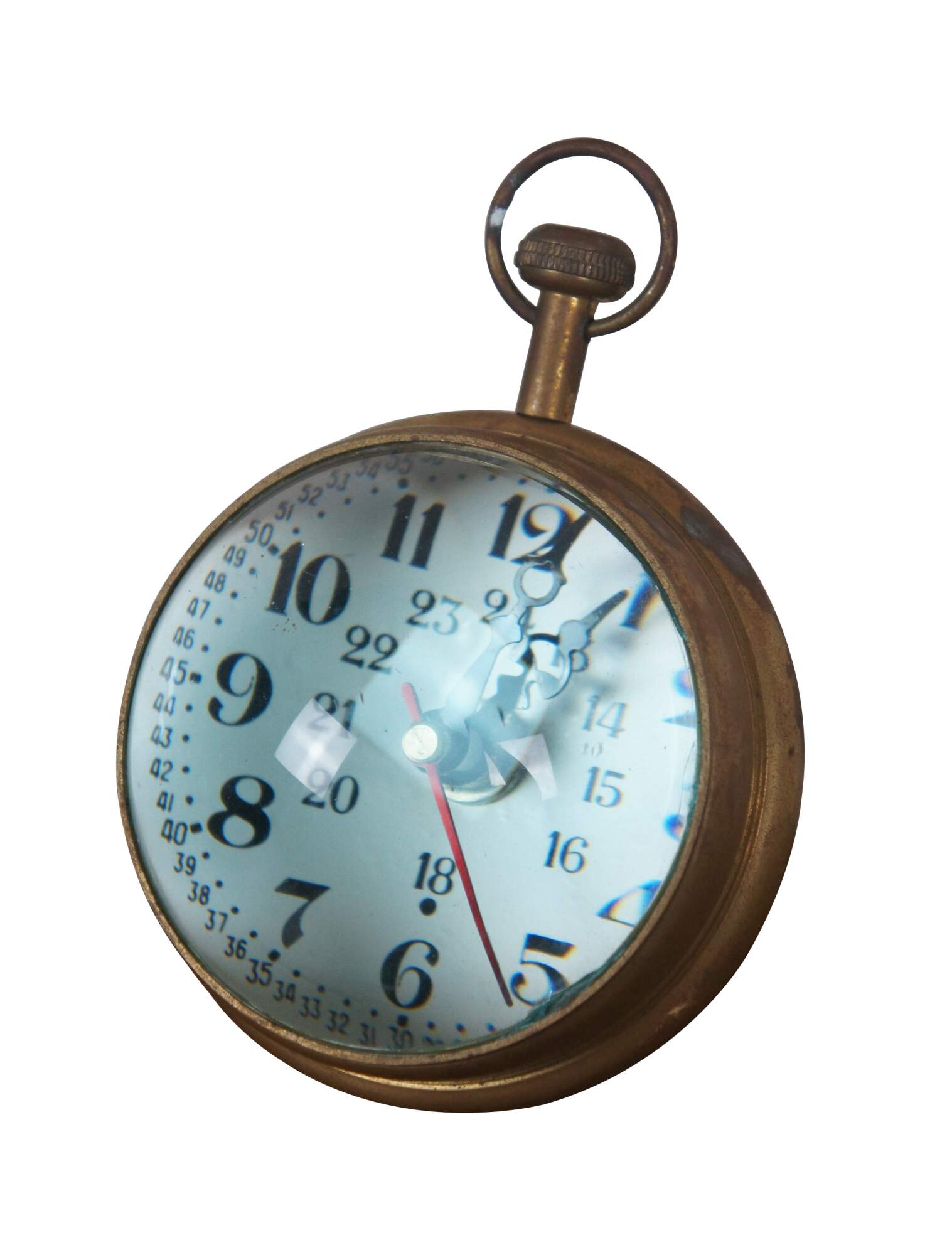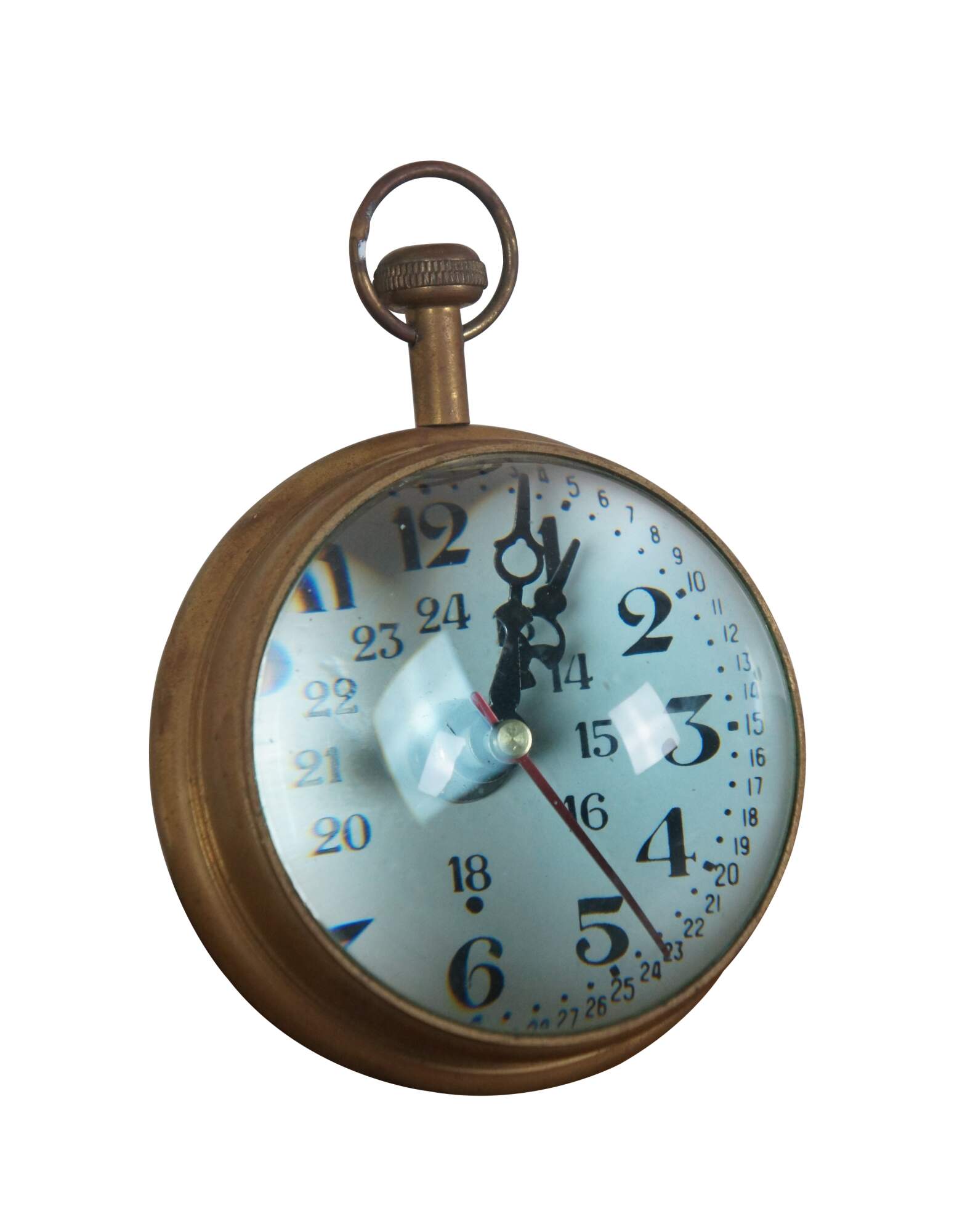 Late 20th century desk clock, crafted in the shape of a Marine pocket watch with brass frame and domes of magnifying glass on the front and back. White face with Arabic numerals, including seconds and 24 hour time. Made in India. M2188 Quartz battery operated movement.