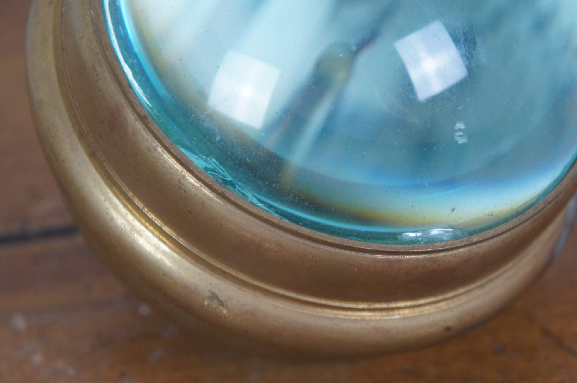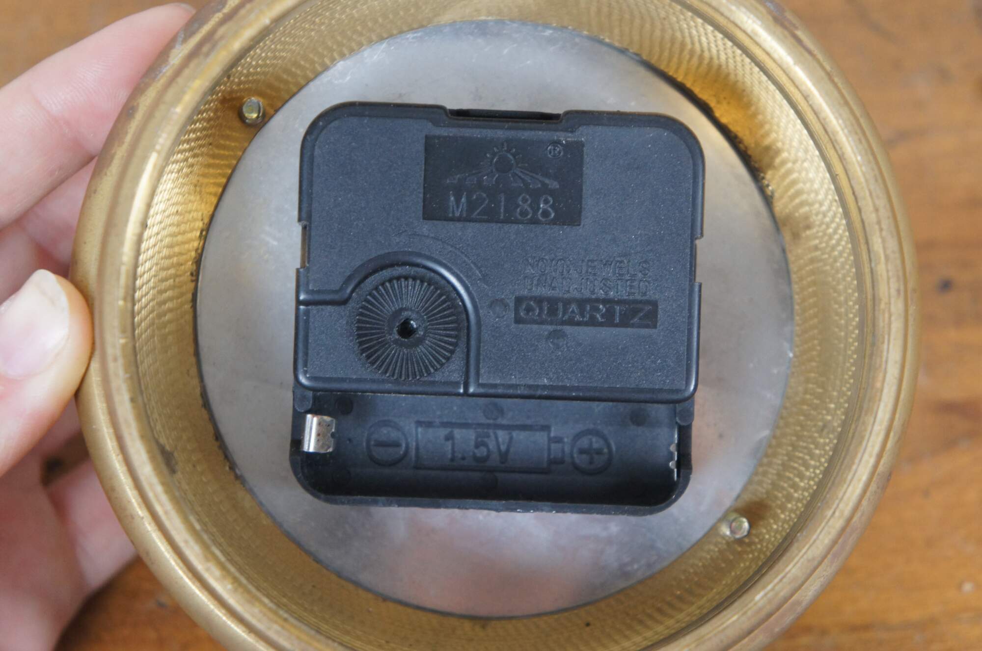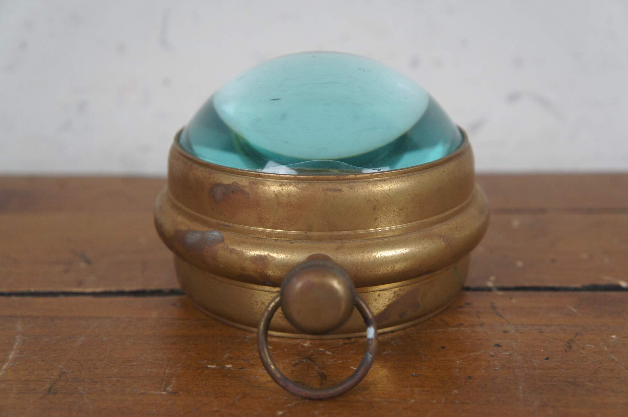 Late 20th century desk clock, crafted in the shape of a Marine pocket watch with brass frame and domes of magnifying glass on the front and back. White face with Arabic numerals, including seconds and 24 hour time. Made in India. M2188 Quartz battery operated movement.