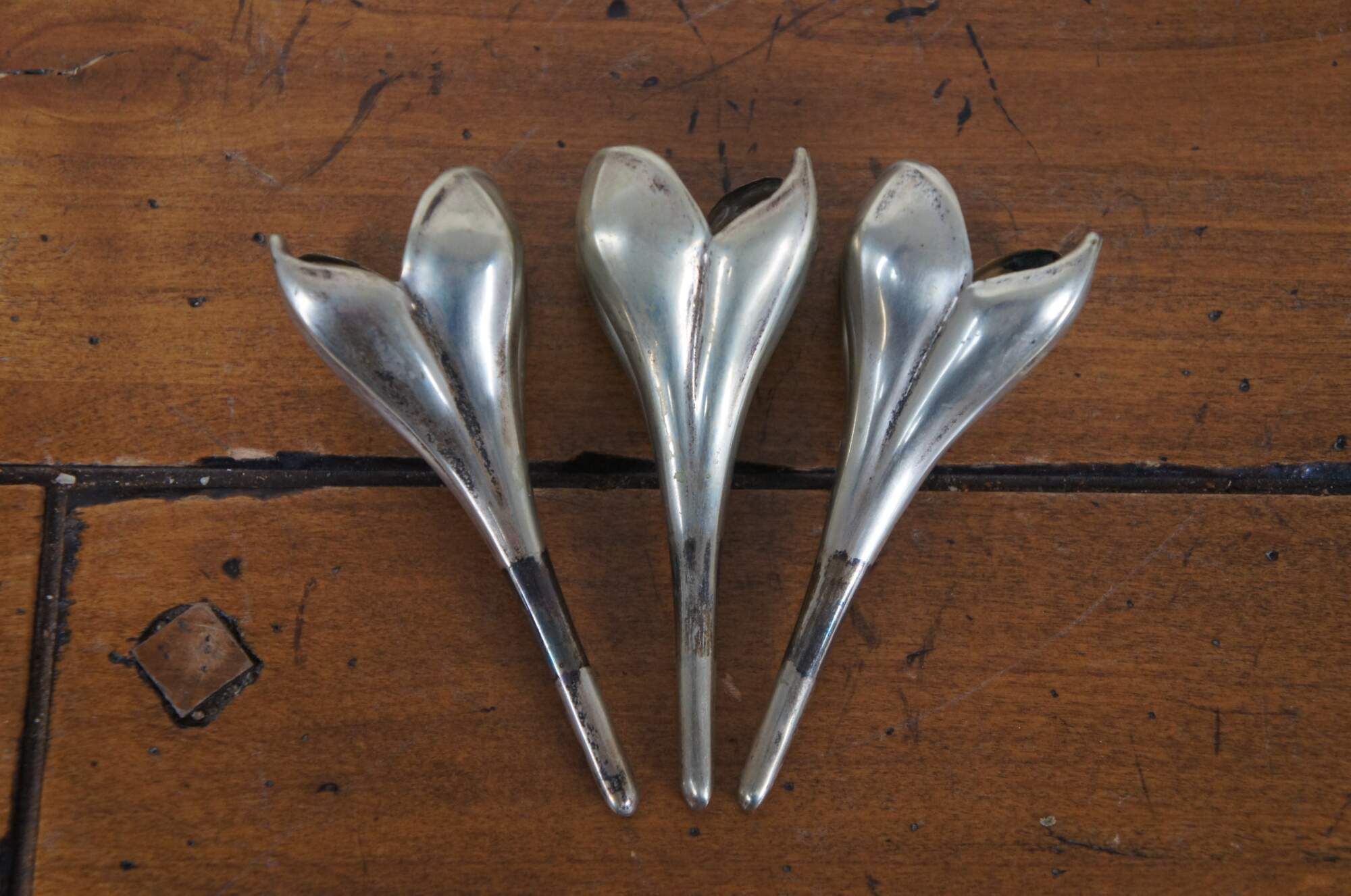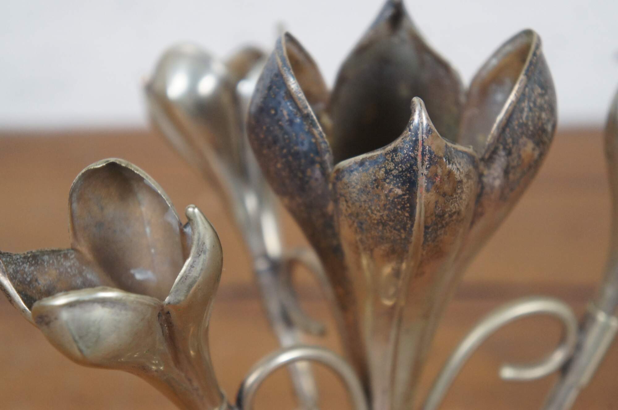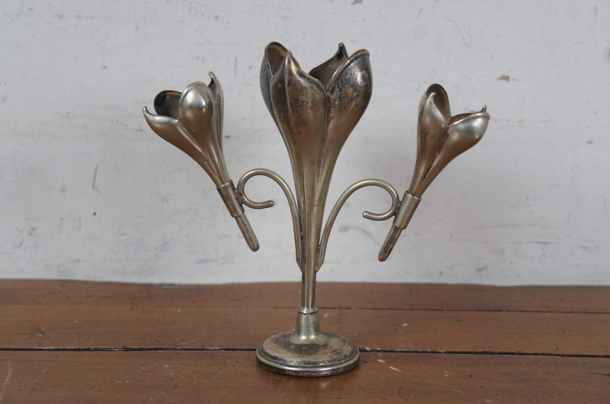 Early 20th century art nouveau silver plated epergne / bud vase. Round pedestal base supporting central crocus blossom / trumpet shaped vase and three smaller trumpets / blossoms in scrolled supports. Base marked 9711-4 R.