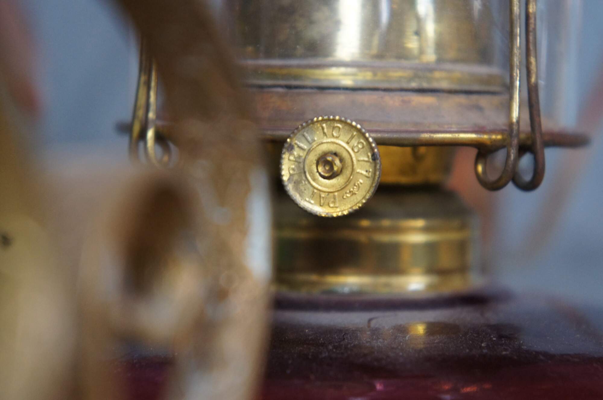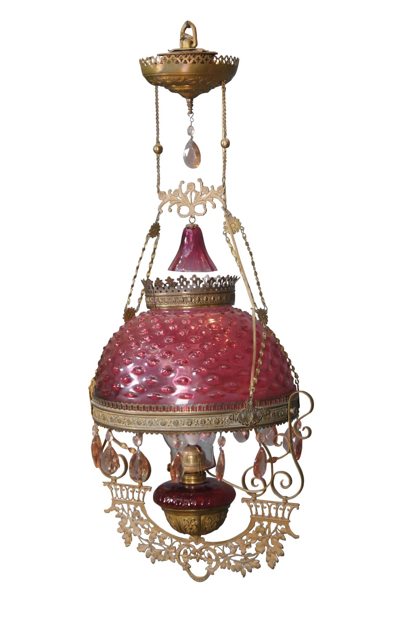 Late 19th century Antique Victorian parlor / pendant light. Oil lamp converted to electric. Intricate brass frame embellished with floral patterns, scrollwork, and a swag of oak leaves and acorns. Deep pink cranberry glass oil reservoir with tear drop deatils, hobnailed shade, and fluted blossom shaped smoke bell. Pink drop crystals hang from the ceiling medallion and around the edge of the shade. Includes clear glass hurricane with beaded top. Plug In.