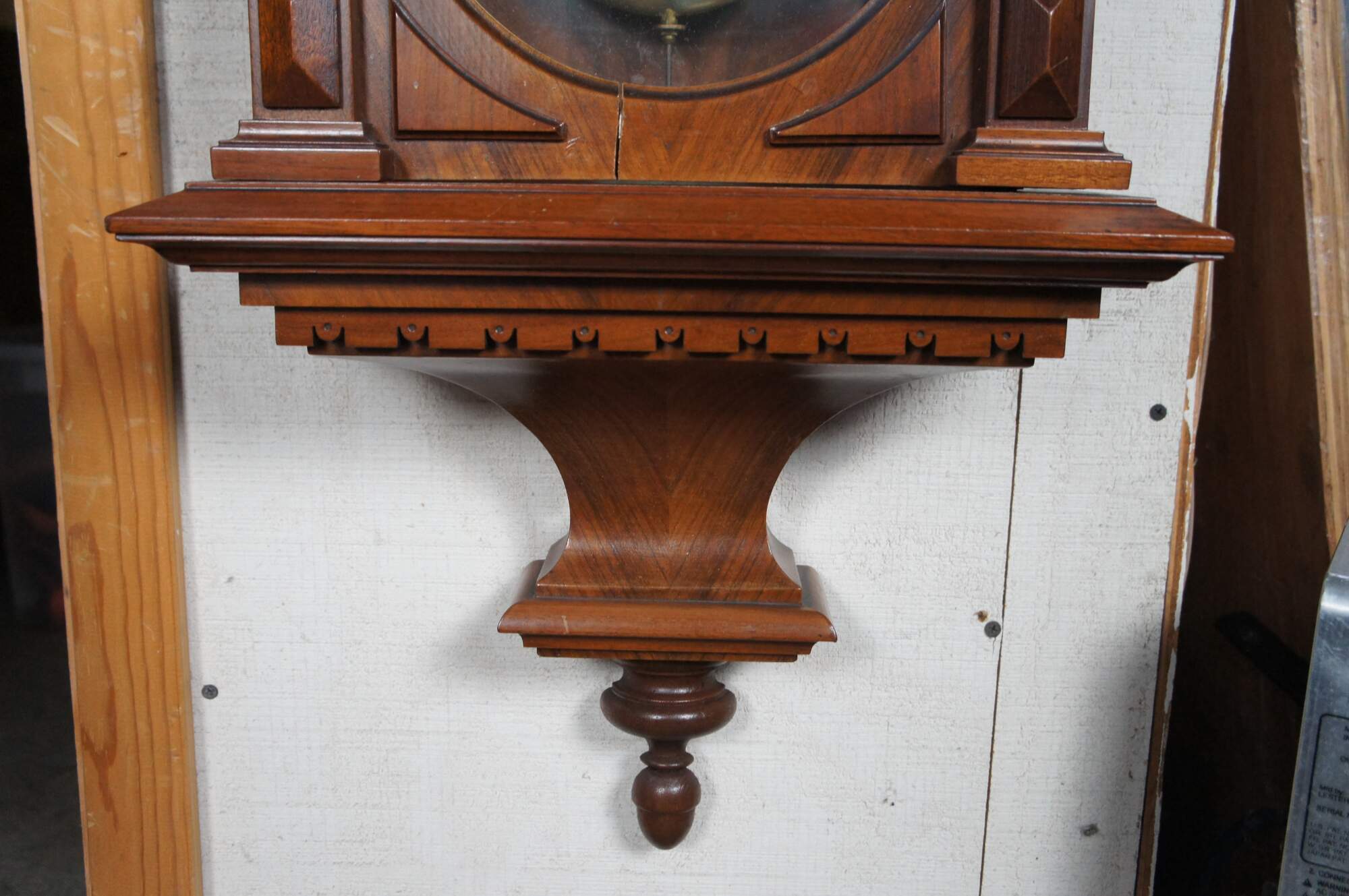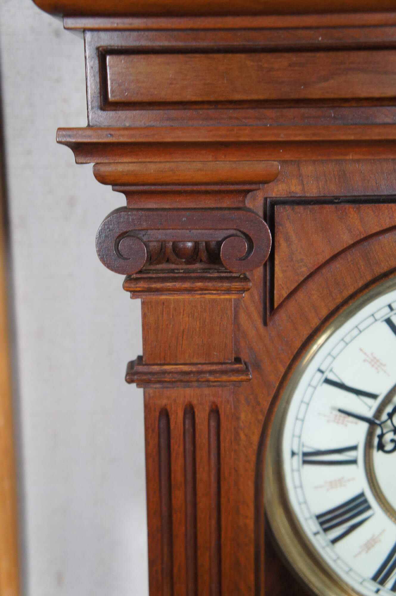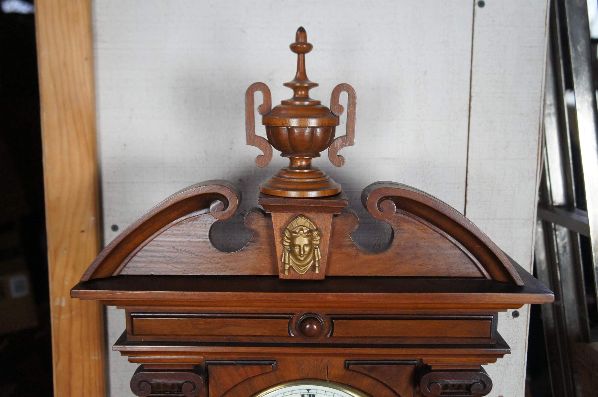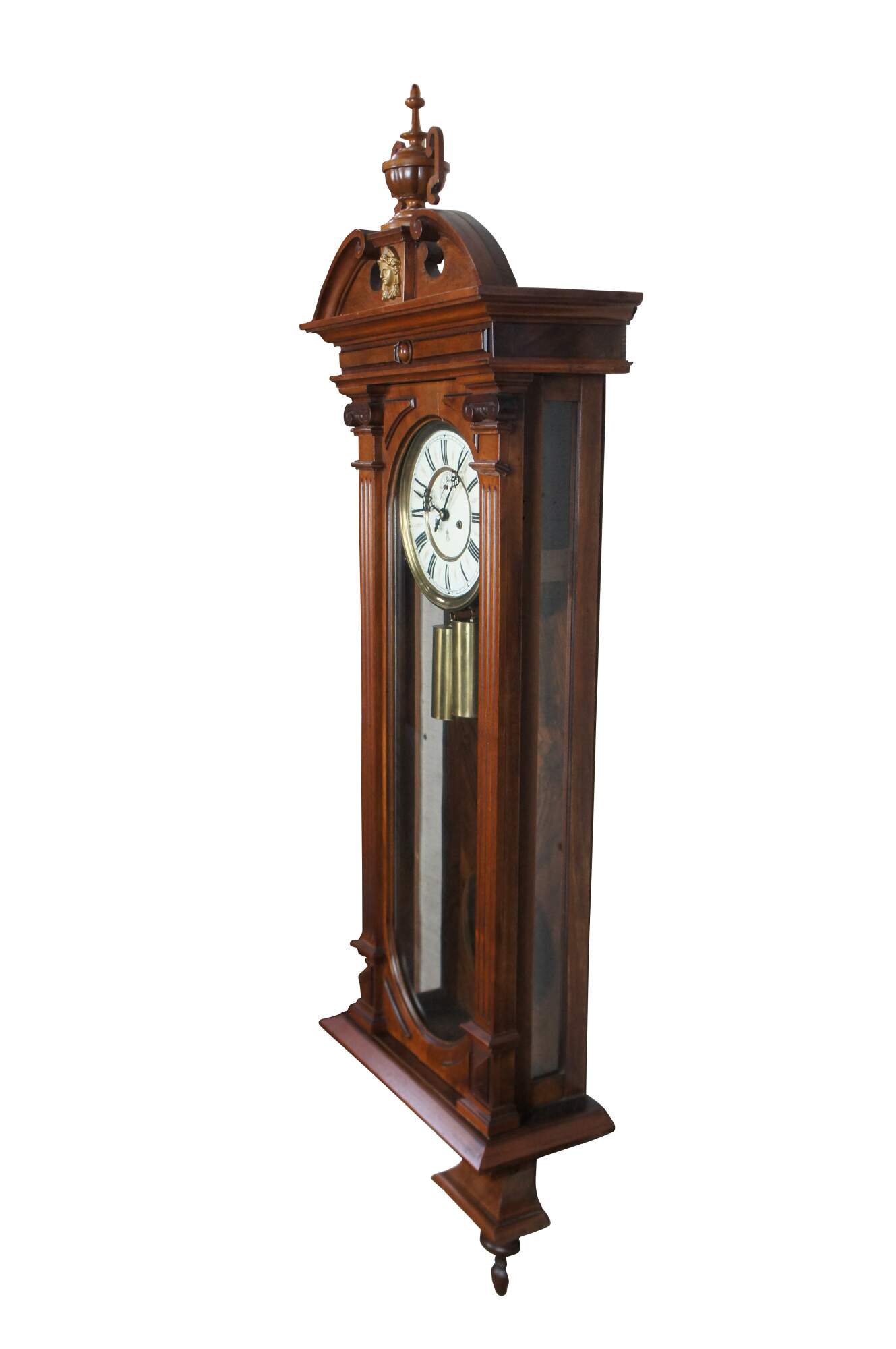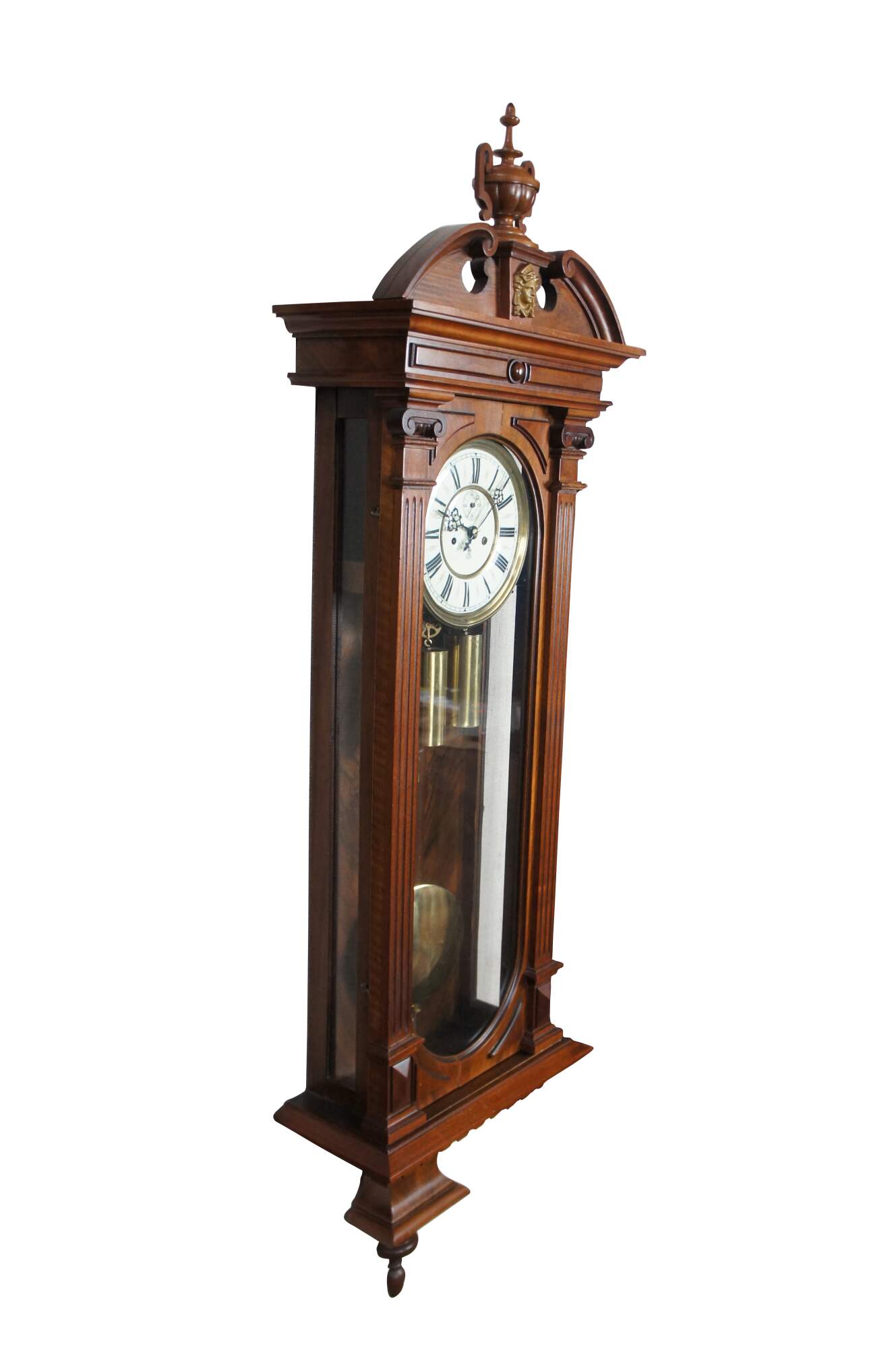 A beautiful antique turn of the century Gustav Becker weight driven Regulator wall clock. Features a long walnut case accented by a central trophy urn over a caryatid mount and a large glass front flanked by Grecian style fluted columns with scrolled capitals. Interior opens to a roman numeral clock face trimmed in brass with scrolled hands and a second hand dial. The face is marked with Gustavs Classic marking showing the crown over and anchor and his initials. The back of the face is also marked with his 1877-1926 mark. Interior case backing is matchbook walnut burl. Sides are glass panelled allowing the pendulum and works to be seen from all angles.