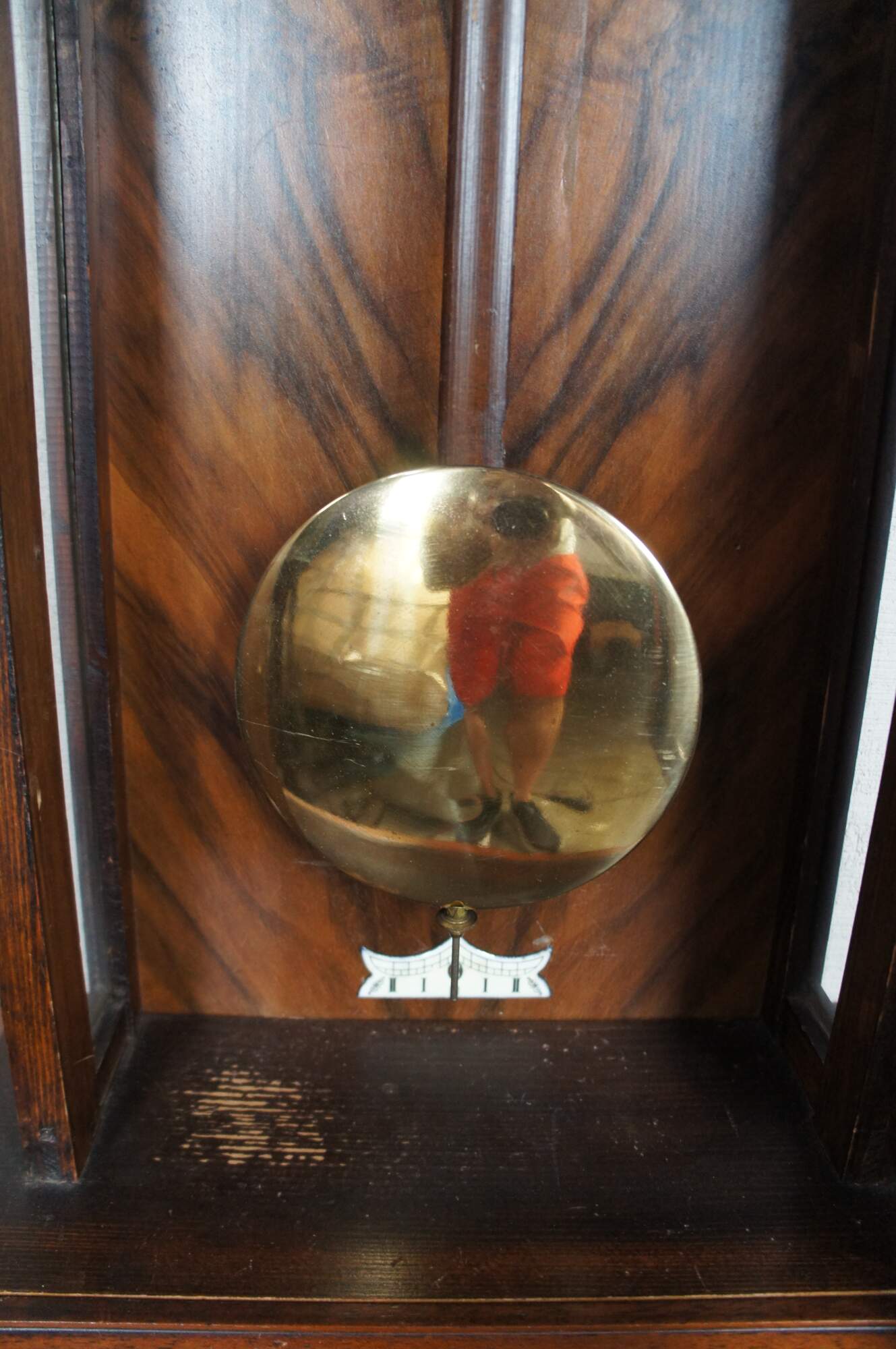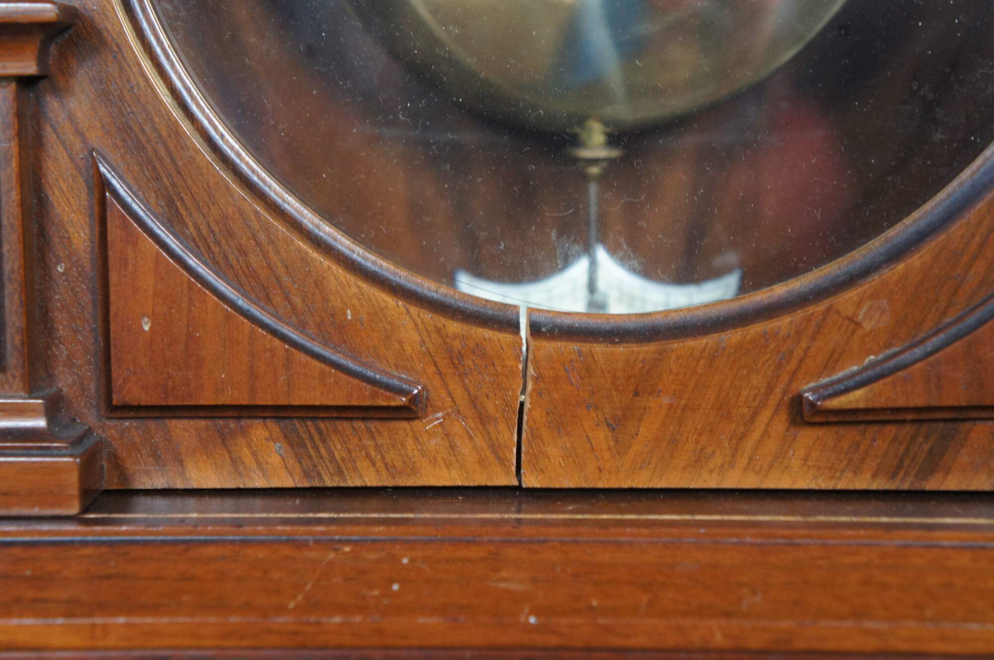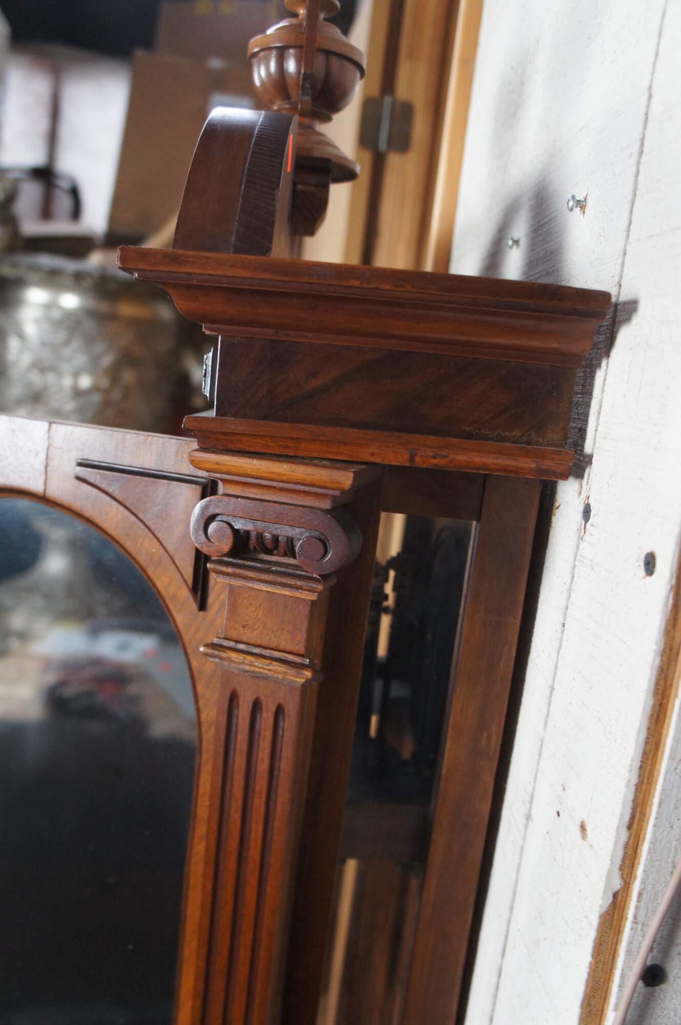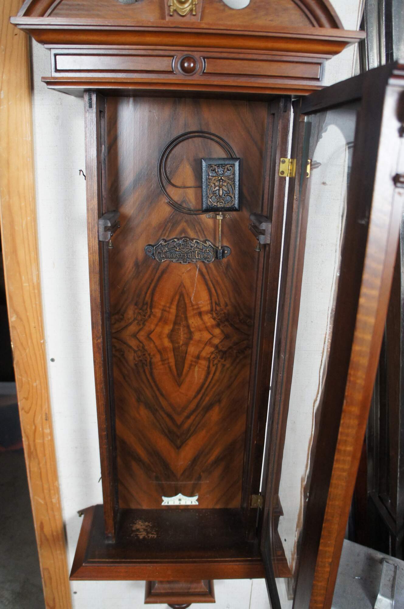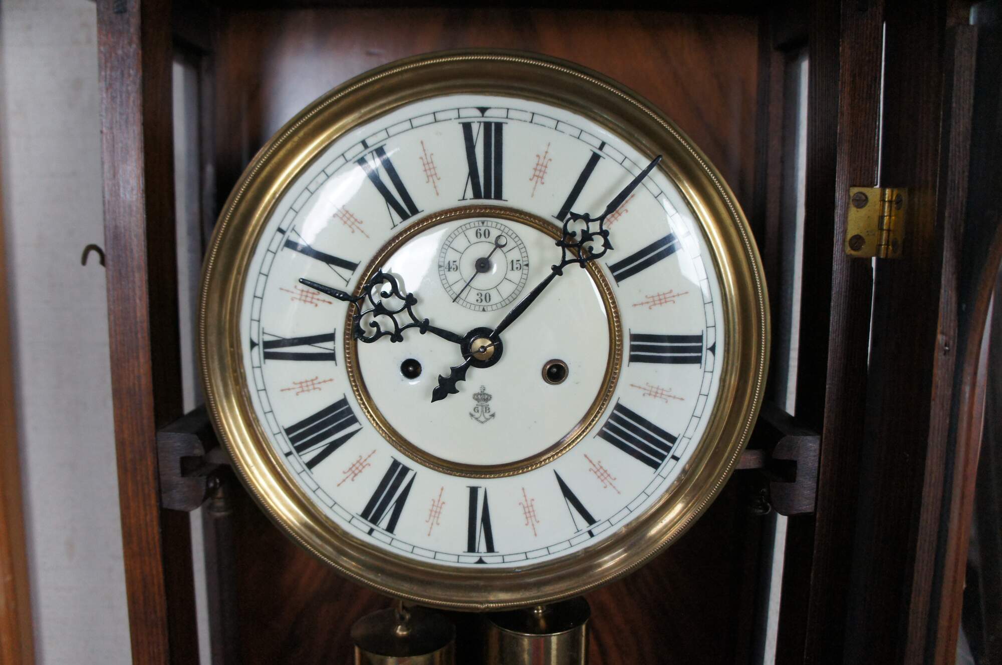 A beautiful antique turn of the century Gustav Becker weight driven Regulator wall clock. Features a long walnut case accented by a central trophy urn over a caryatid mount and a large glass front flanked by Grecian style fluted columns with scrolled capitals. Interior opens to a roman numeral clock face trimmed in brass with scrolled hands and a second hand dial. The face is marked with Gustavs Classic marking showing the crown over and anchor and his initials. The back of the face is also marked with his 1877-1926 mark. Interior case backing is matchbook walnut burl. Sides are glass panelled allowing the pendulum and works to be seen from all angles.