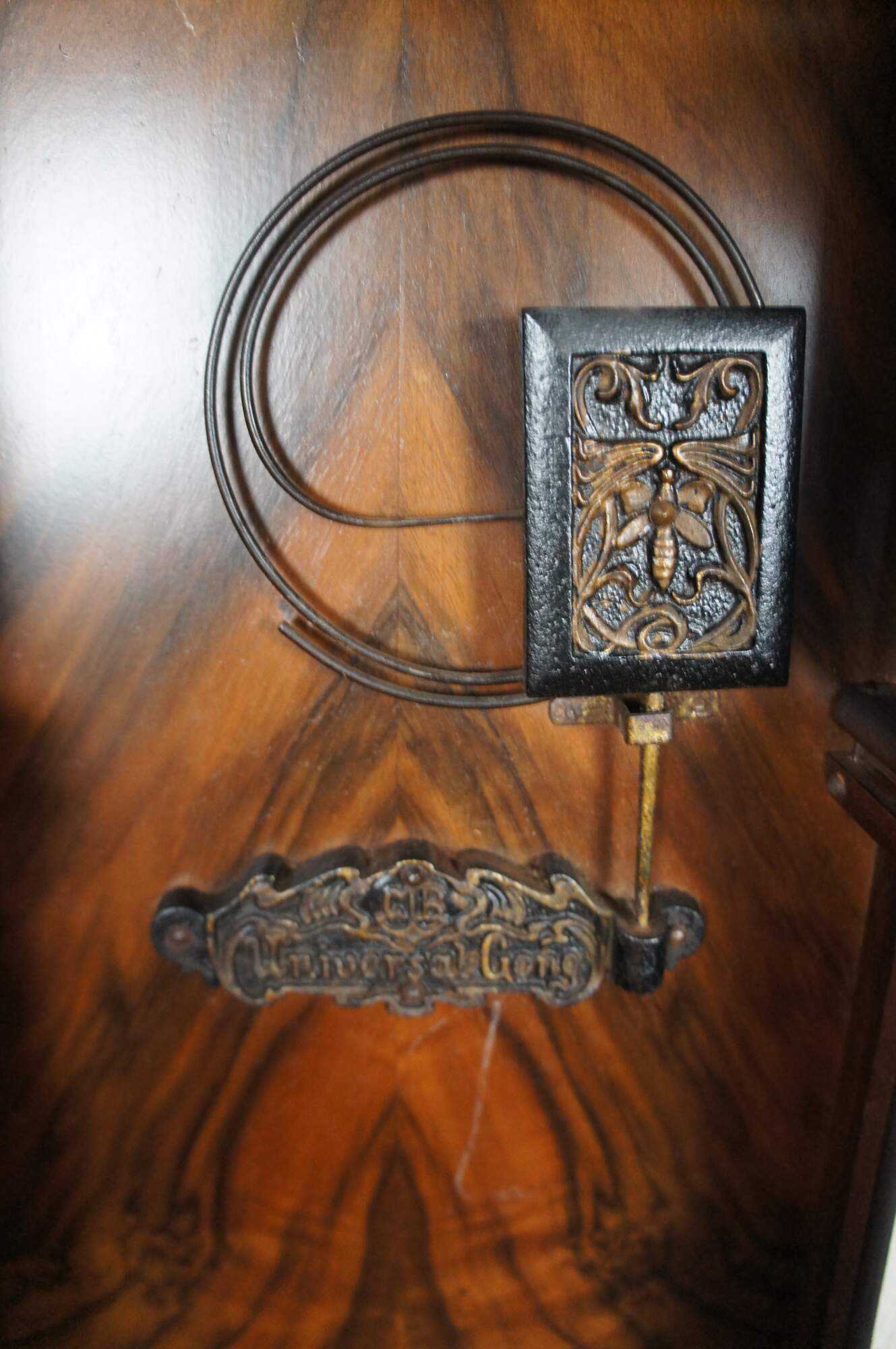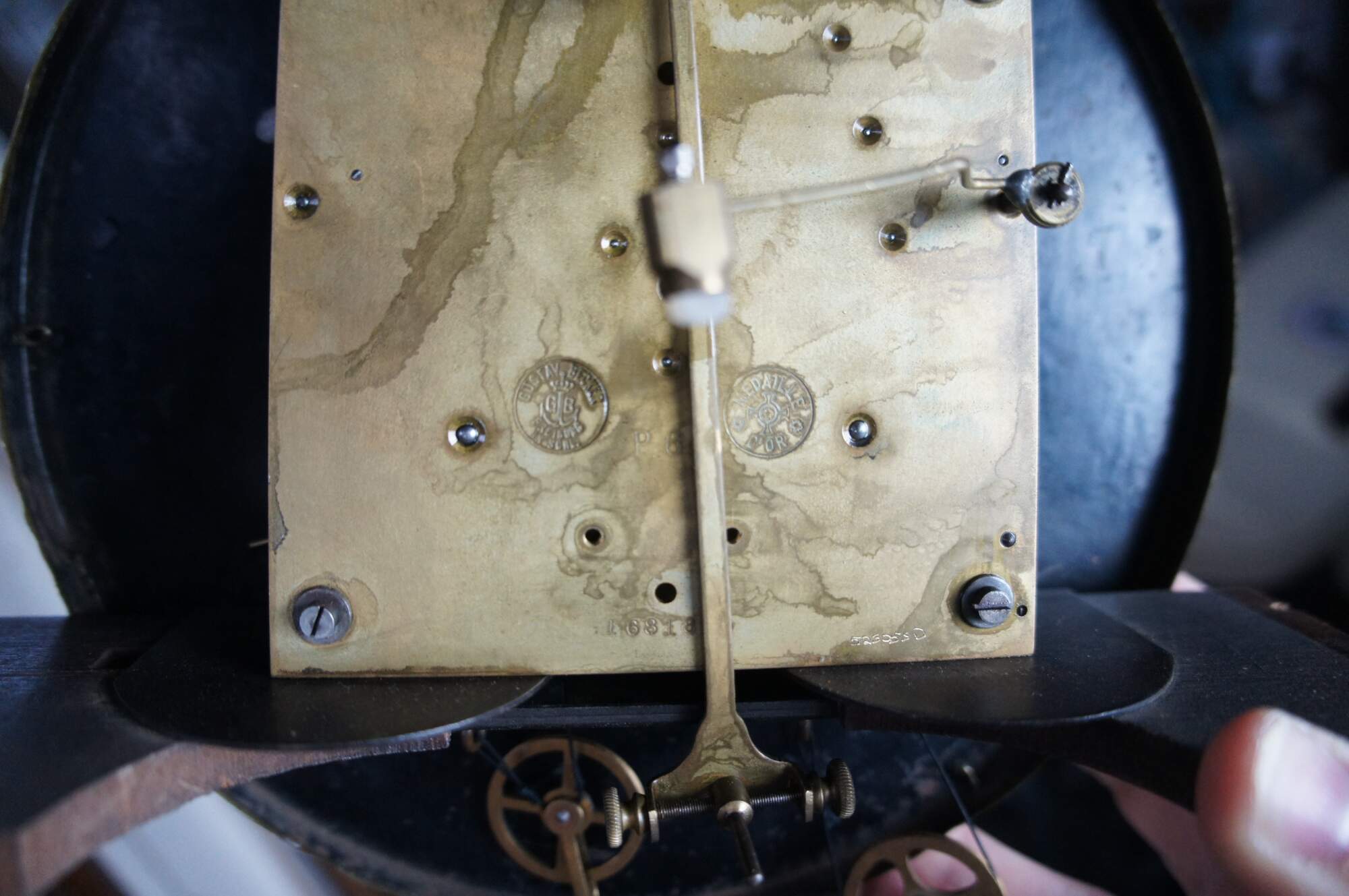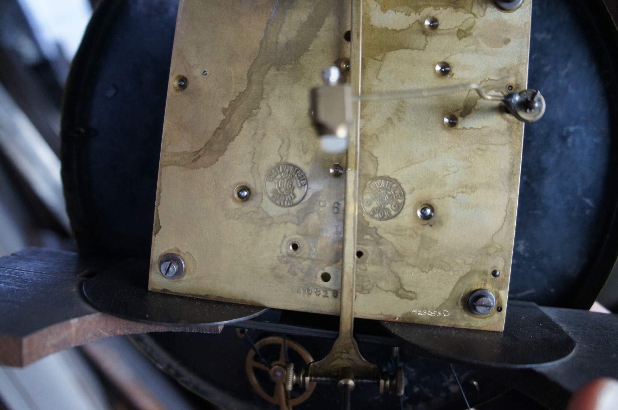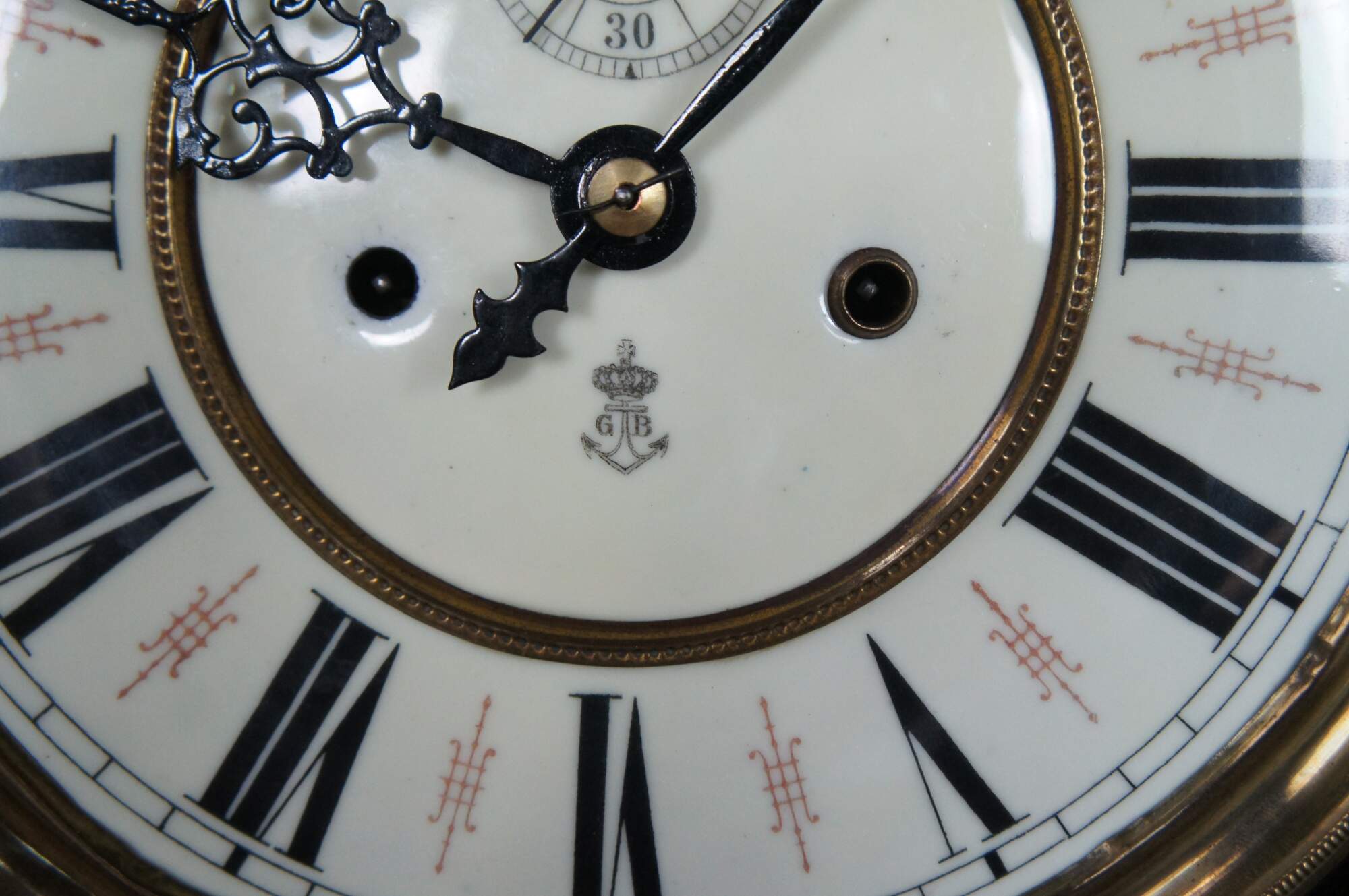 One of the better quality/best-known German clockmakers from the mid to late 19th century was Gustav Becker. Born in 1819, Becker trained as a clockmaker in Germany and Austria. In 1850 he opened workshops in Freiburg, Silesia, Germany in 1850. Initially, Becker struggled with untrained help, but won the "Medaille d’Or" for design at the 1852 Silesia Trade Exposition. Becker incorporated that first medal and his initials, G.B., into his trademark and, as you will see below, into many components of his clocks, from movement mounts to wall standoffs to beatplates and pulleys.