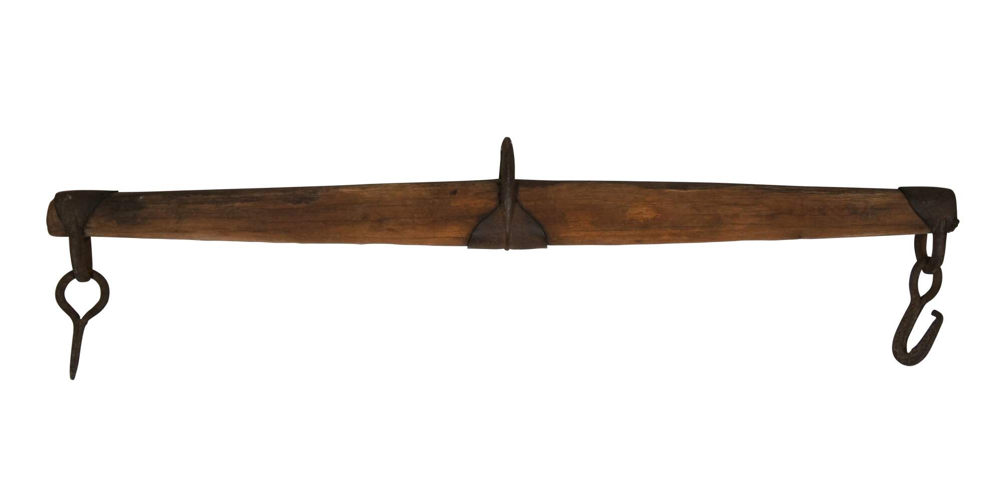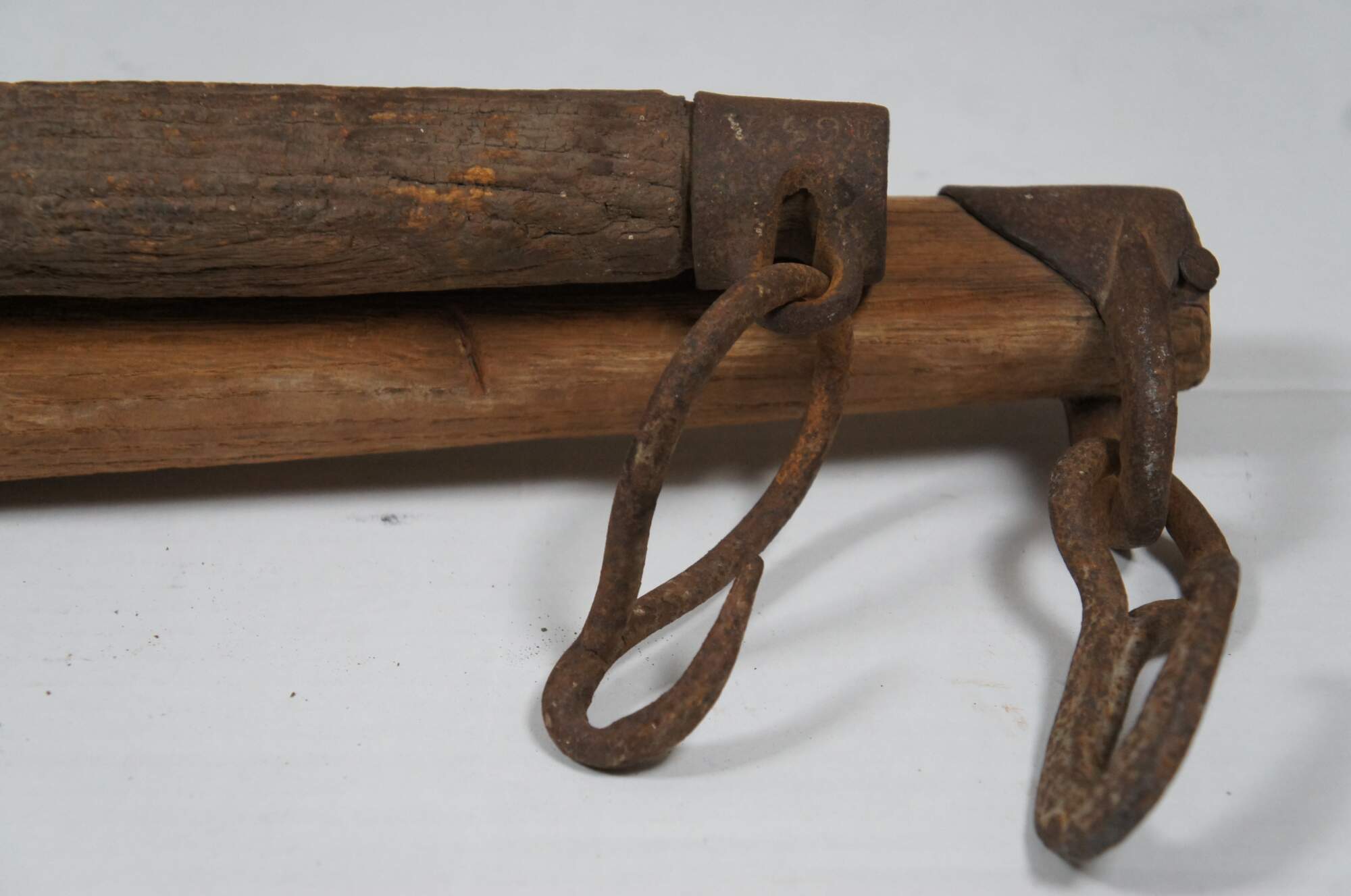 Pair of late 19th - early 20th century wood and iron singletree western primitive farmhouse horse / ox yokes. Iron cap on the smaller one is marked 165A.