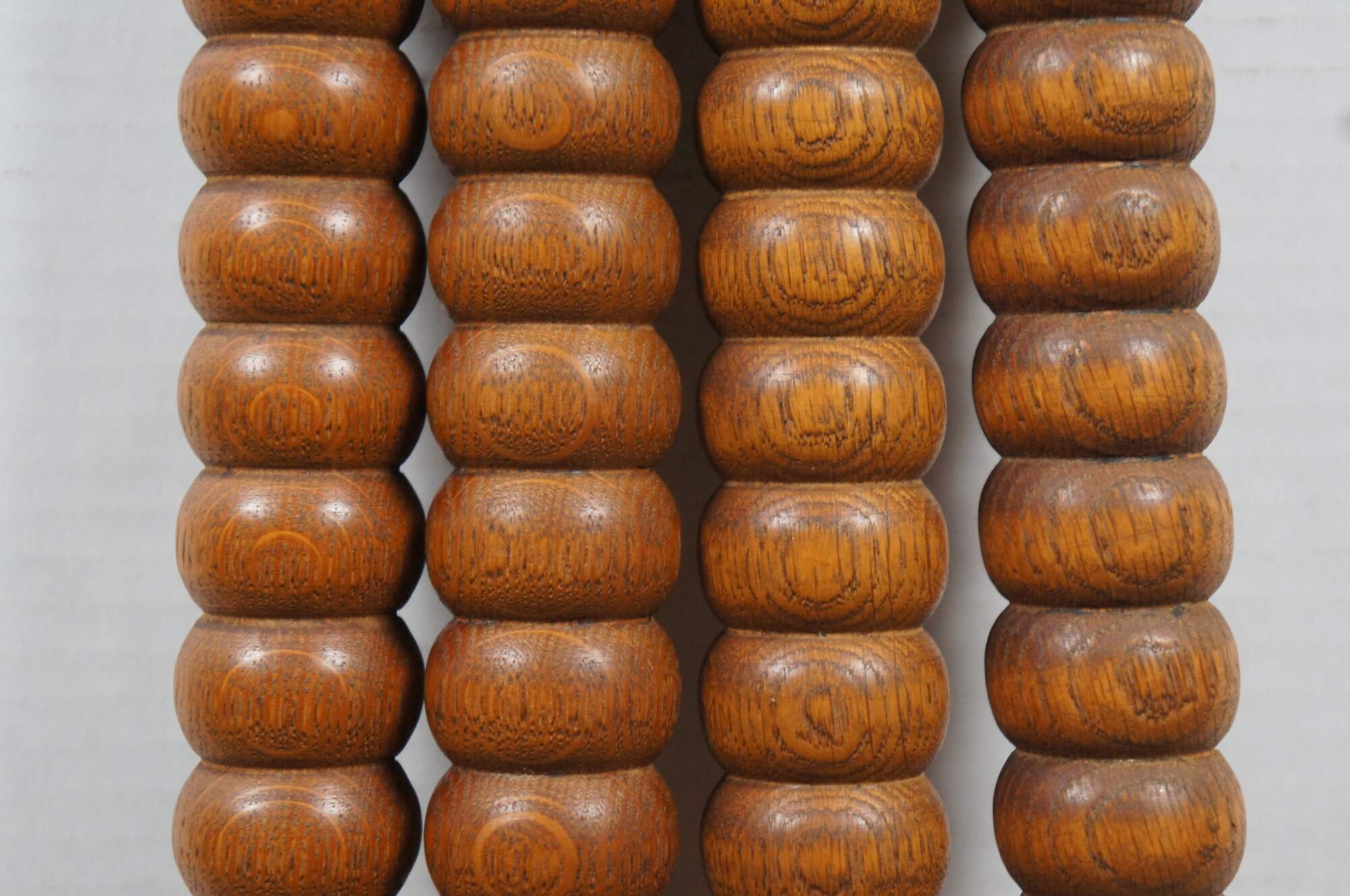 Set of four matching early 20th century turned oak spindle table legs with metal and glass marble ball and claw style feet.