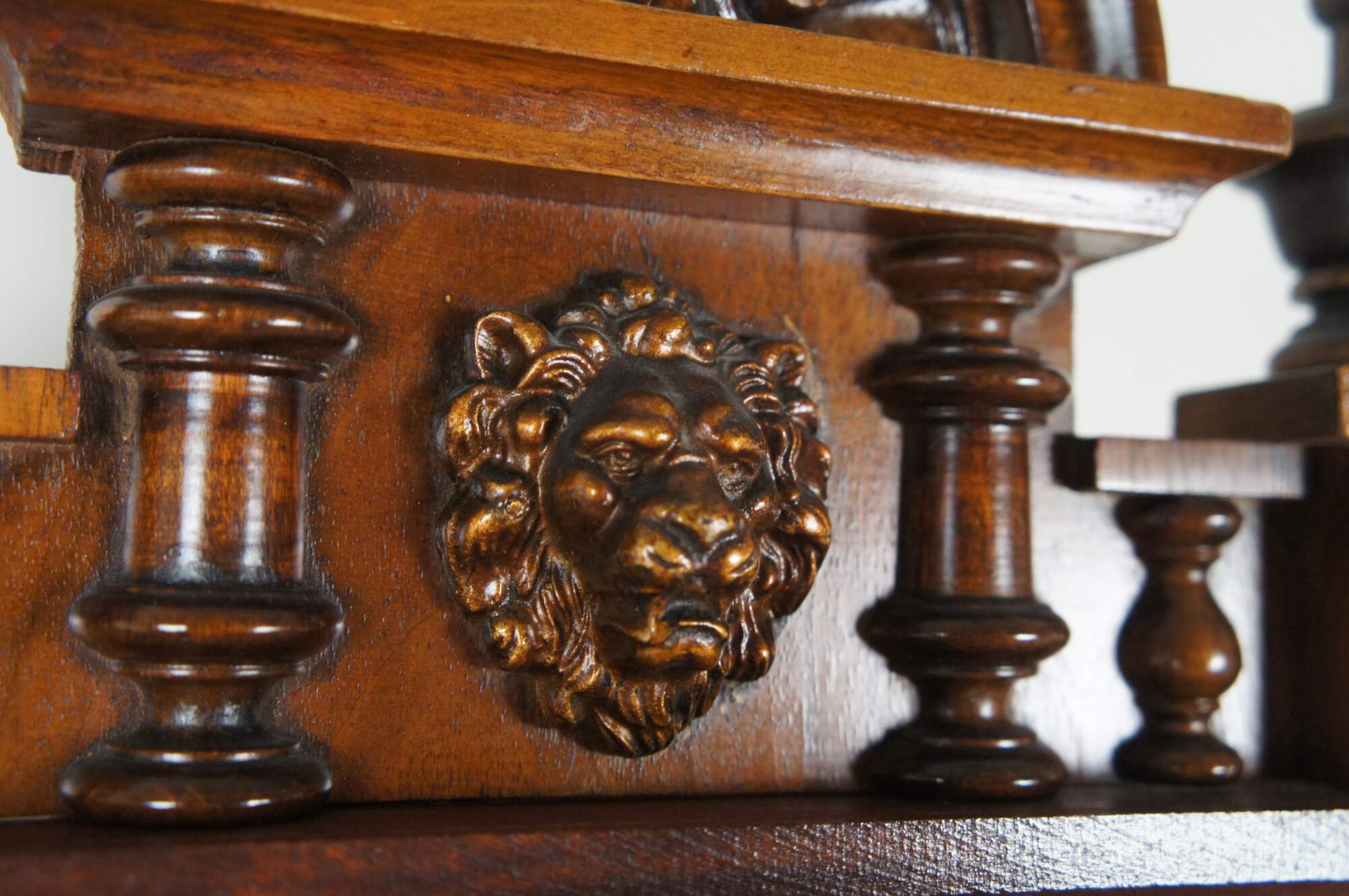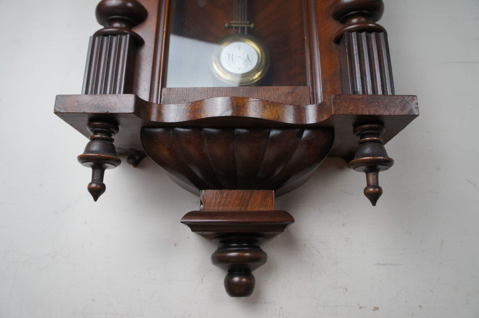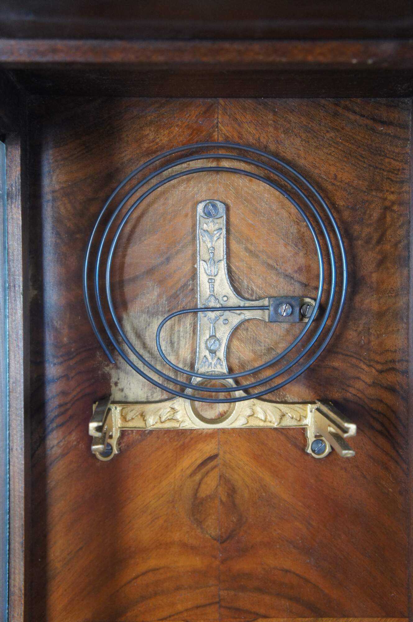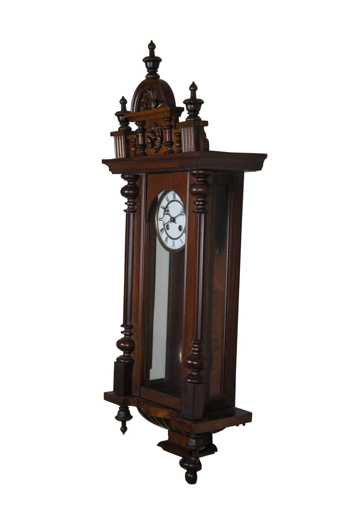 1920s German Mauthe Wall Clock. Features a tall case made from walnut with turned columns, ornate finials and a lion head at the center. The clock face is designed with Roman Numerals and ornate hands. The pendulum is long with at Return and Advance face. Makers mark along backsidde of works.