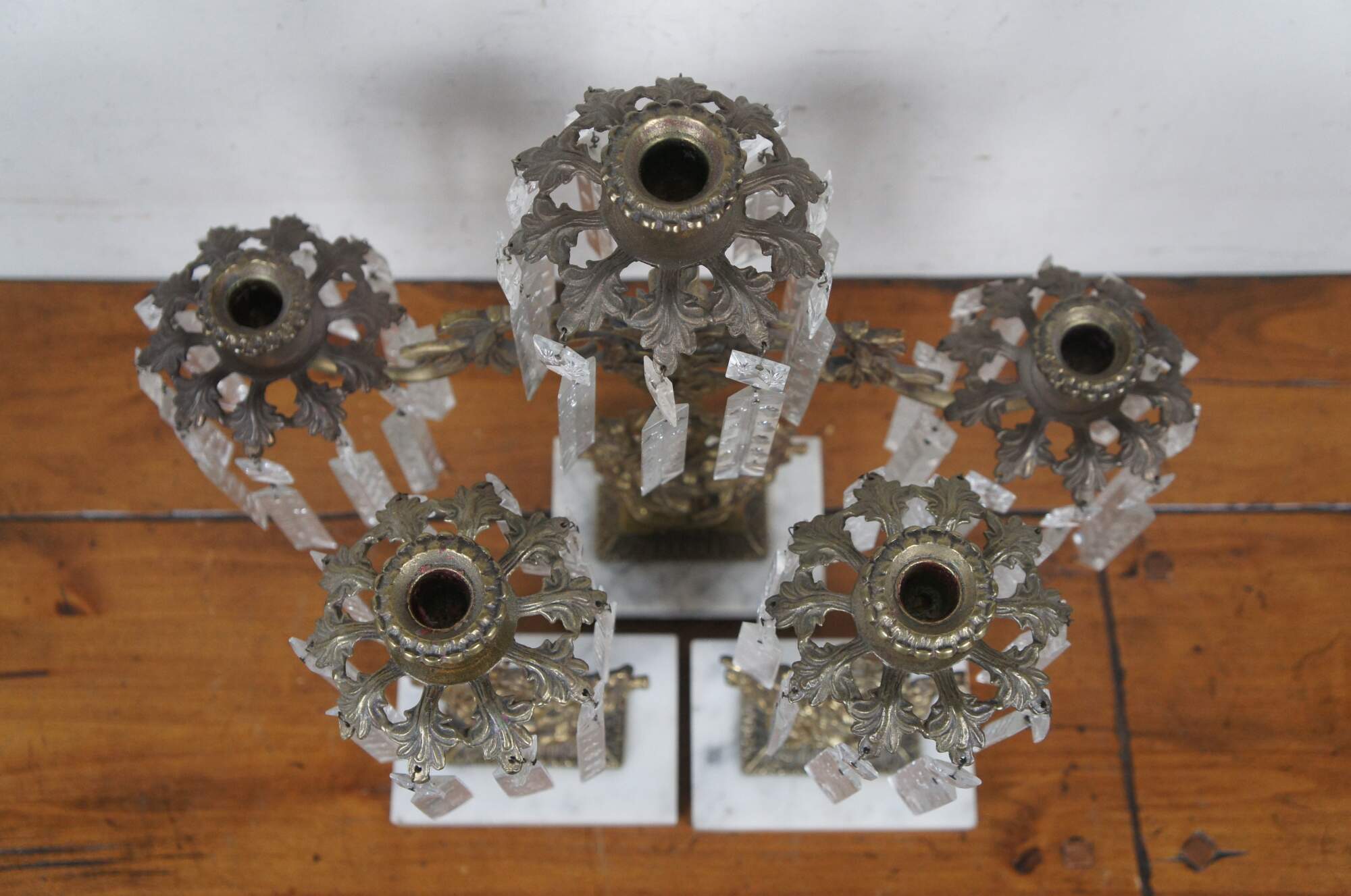 Late 19th - early 20th century three piece girandole candelabra / candlestick set. Two single taper and one three taper candle holders. White marble bases with gilded bronze candlesticks in the shape of baskets of flowers. Flower shaped candle cups with acanthus leaf drip guard. Two section rectangular drop crystals on each leaf tip, etched with stars and flowers.