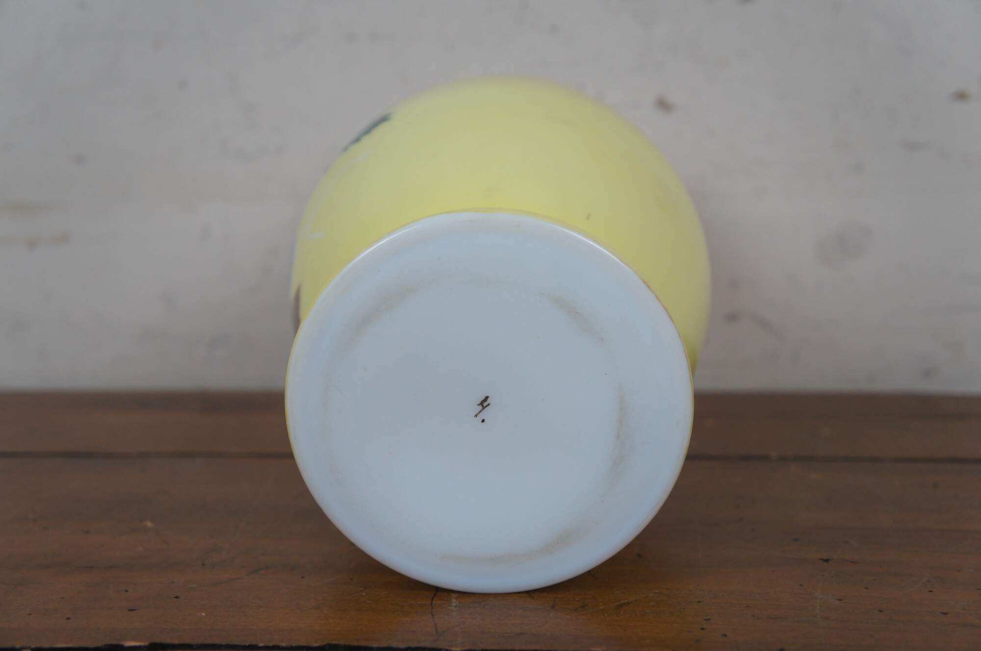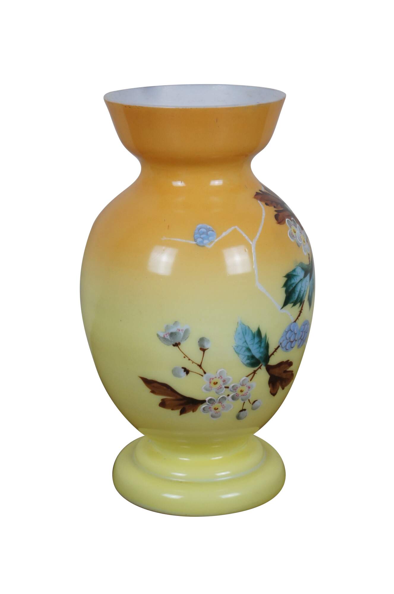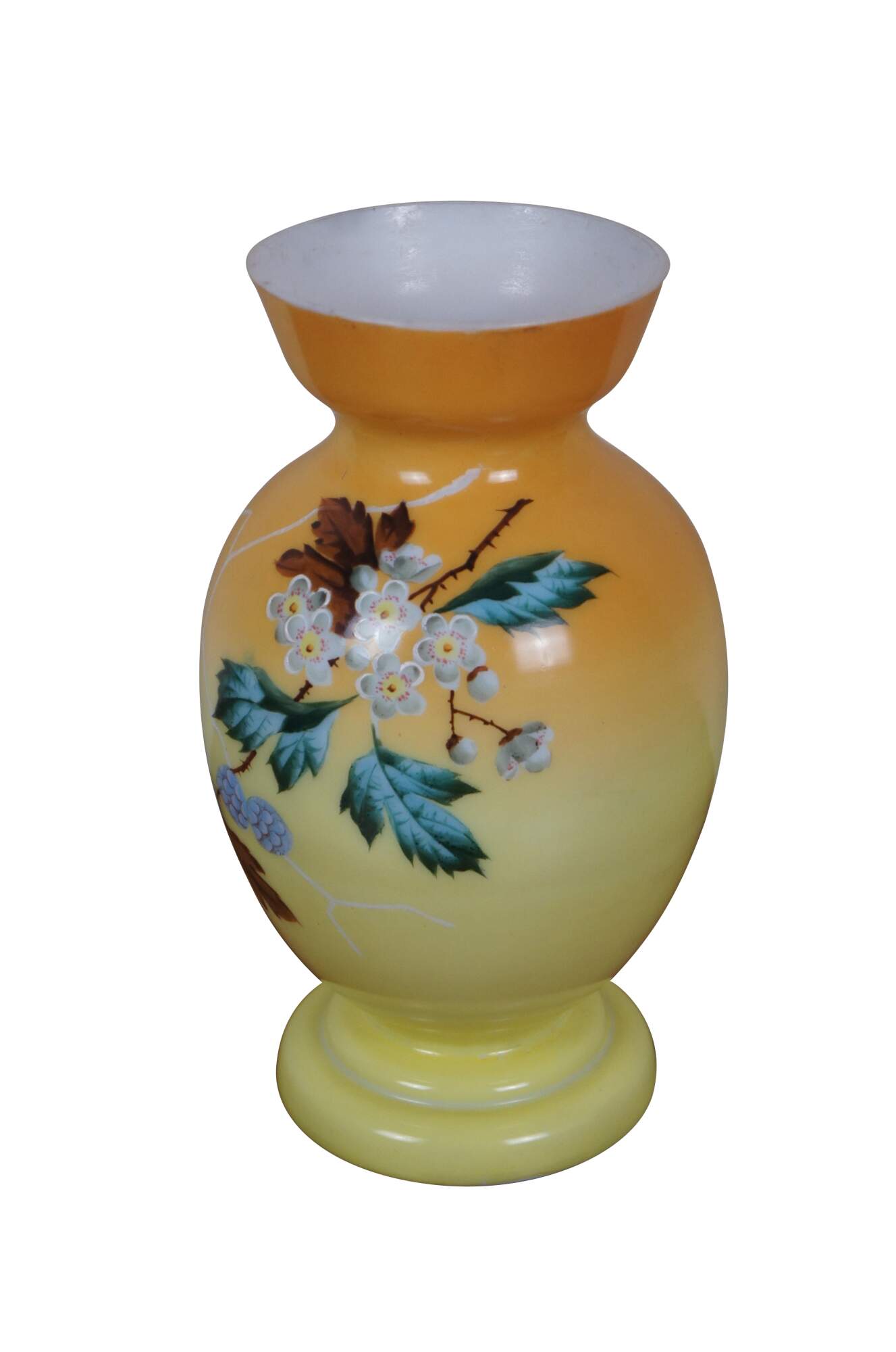 Vintage opaline / painted milk glass vase. Yellow and orange ombre with a hand painted design of crossed branches of cherry blossoms and pine cones. Marked 4 on base.
