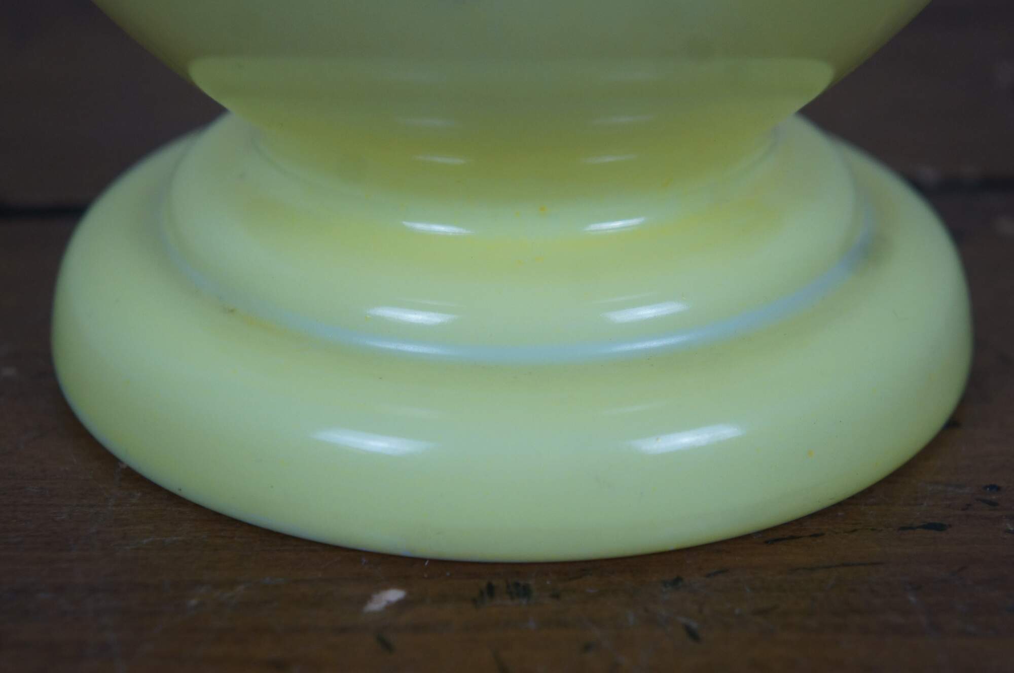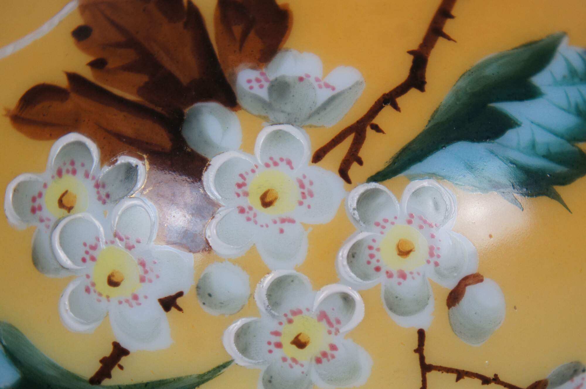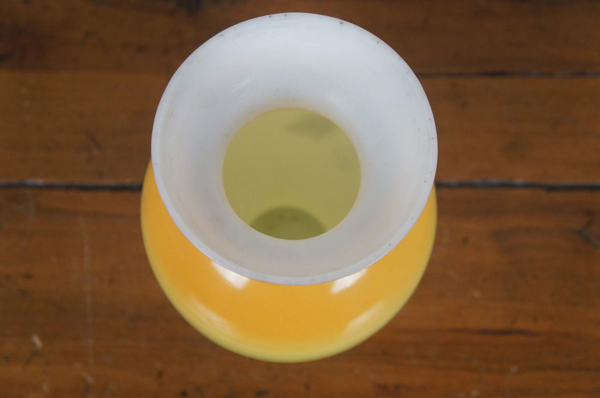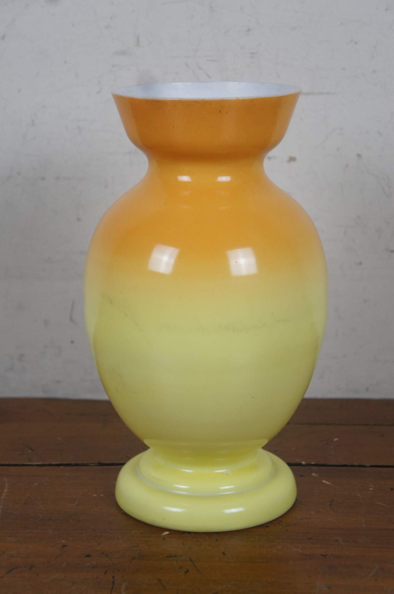 Vintage opaline / painted milk glass vase. Yellow and orange ombre with a hand painted design of crossed branches of cherry blossoms and pine cones. Marked 4 on base.