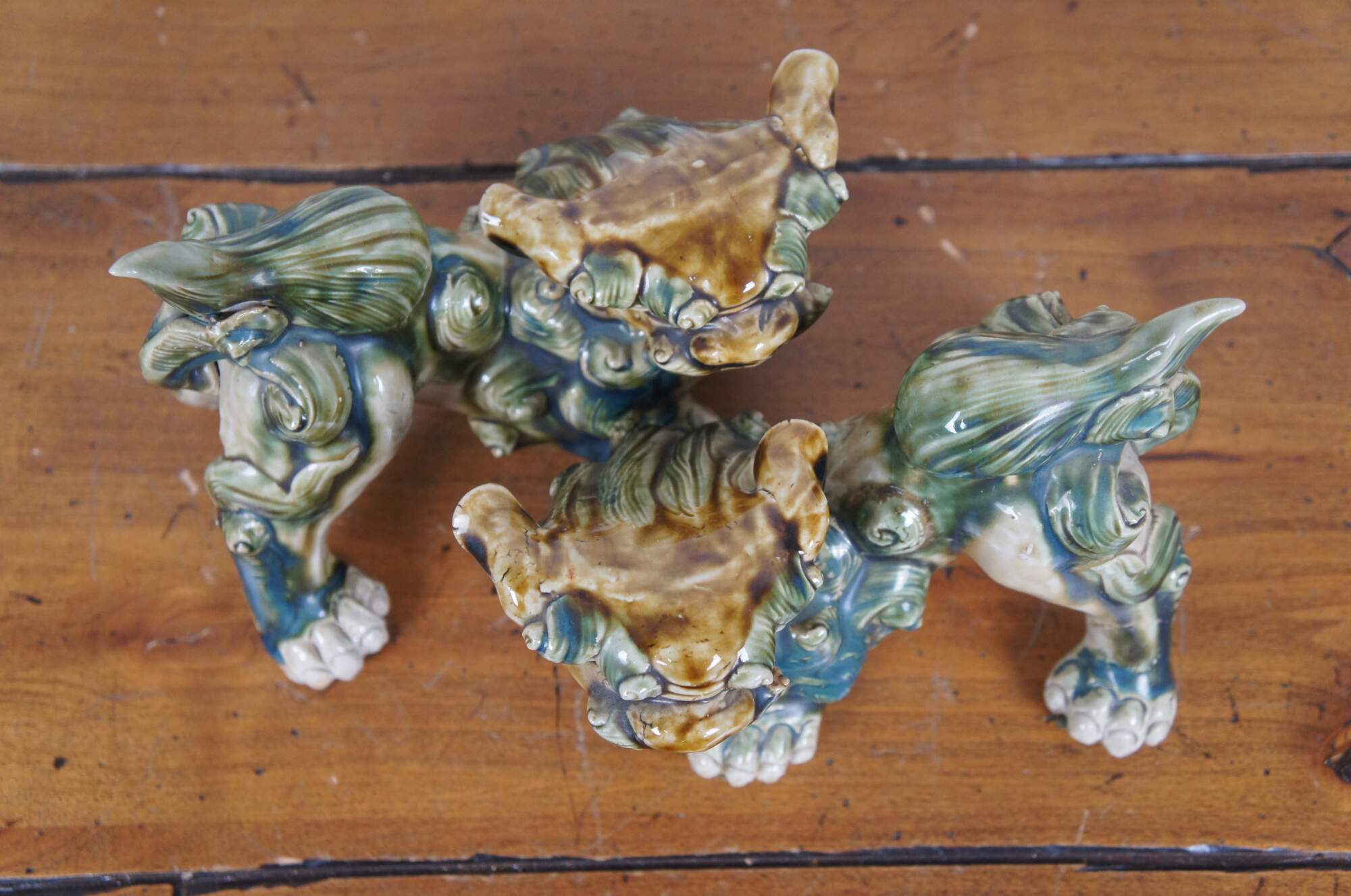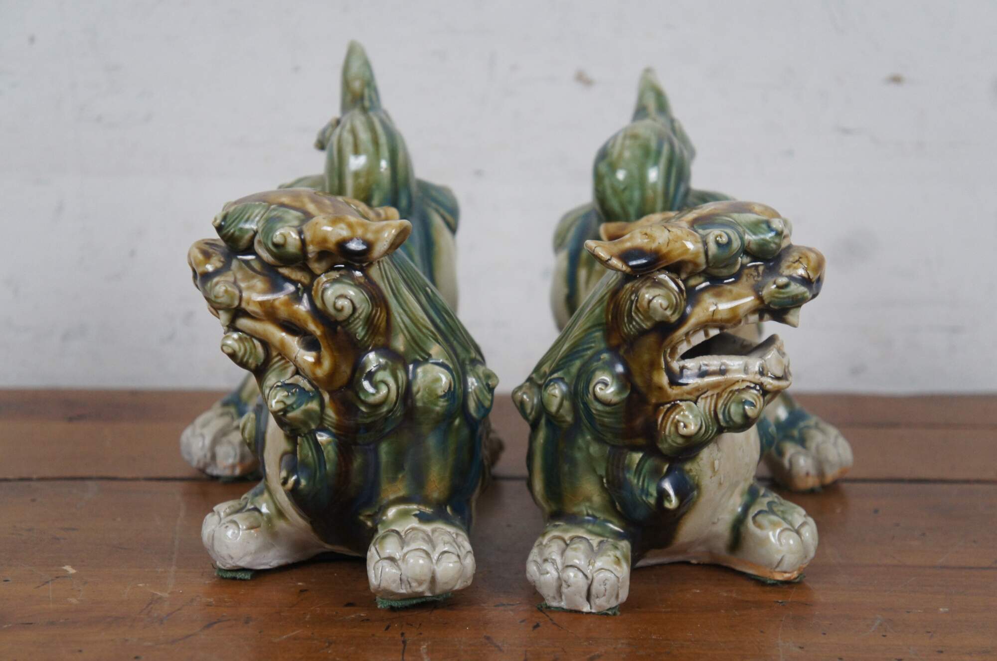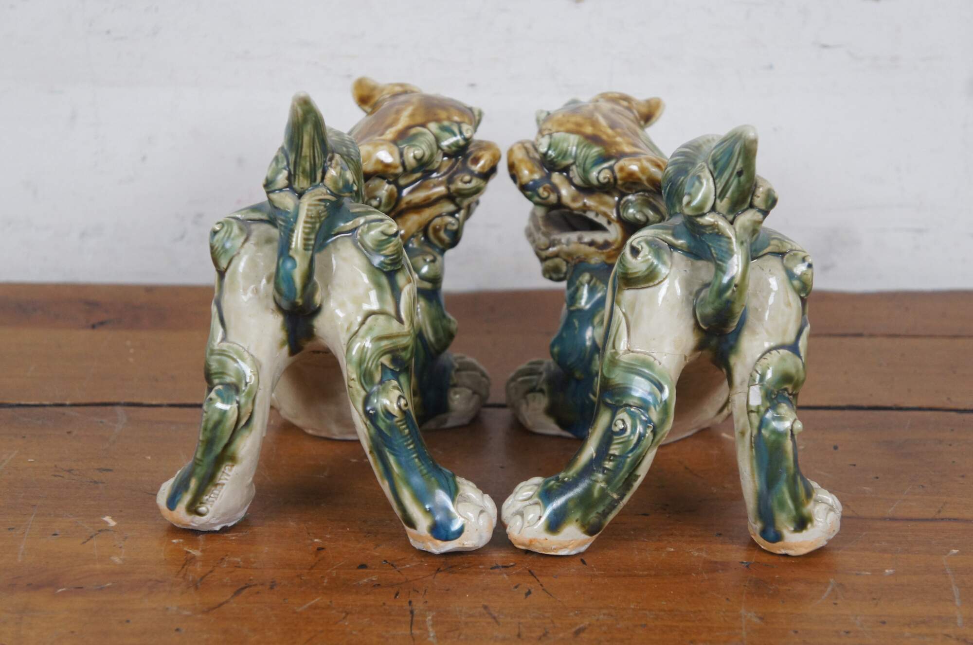 Pair of 20th century shishi / guardian lion / foo dog figurines. Ceramic glazed in green, teal and brown. Incised with Okinawa on rear leg.