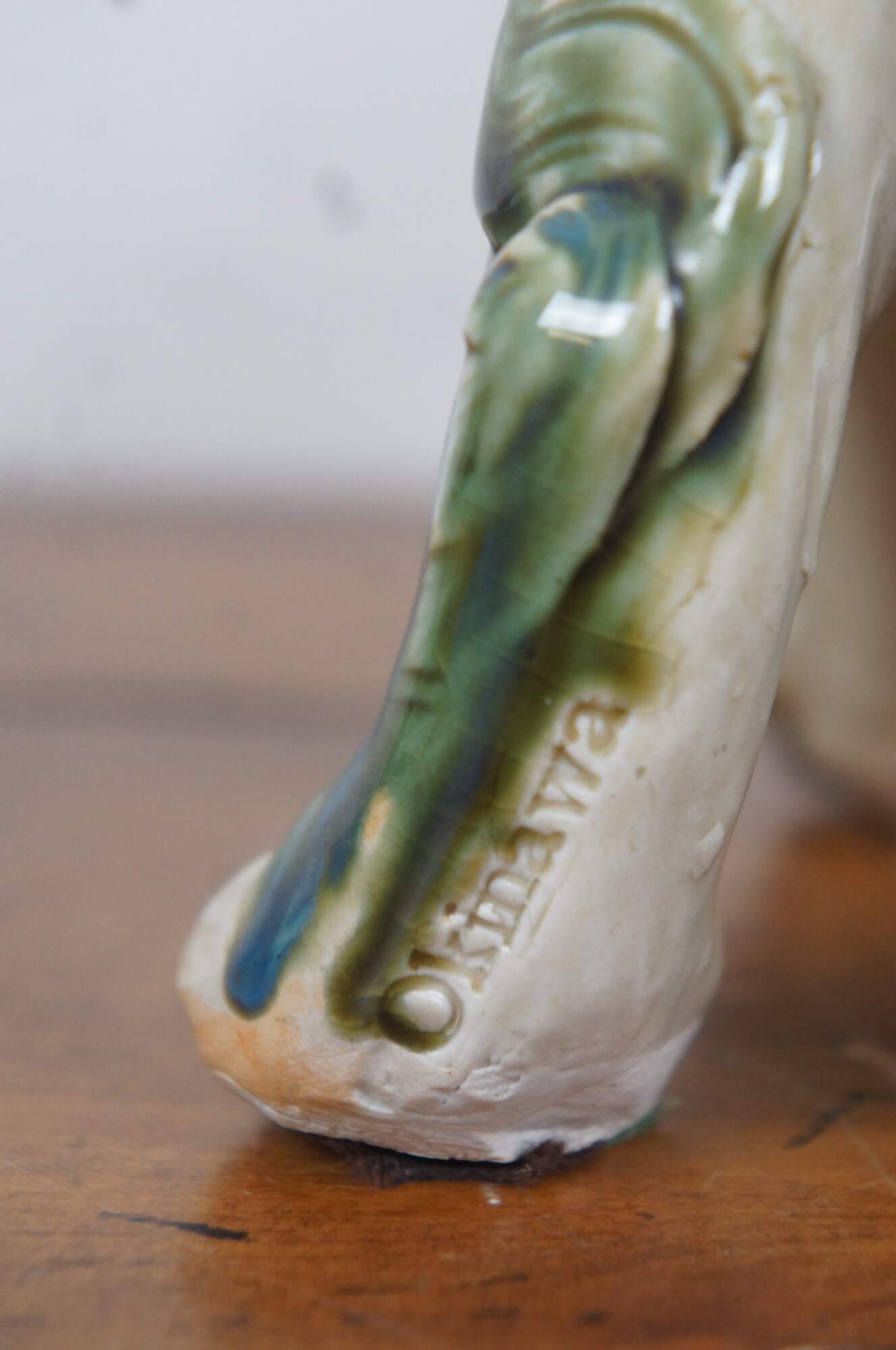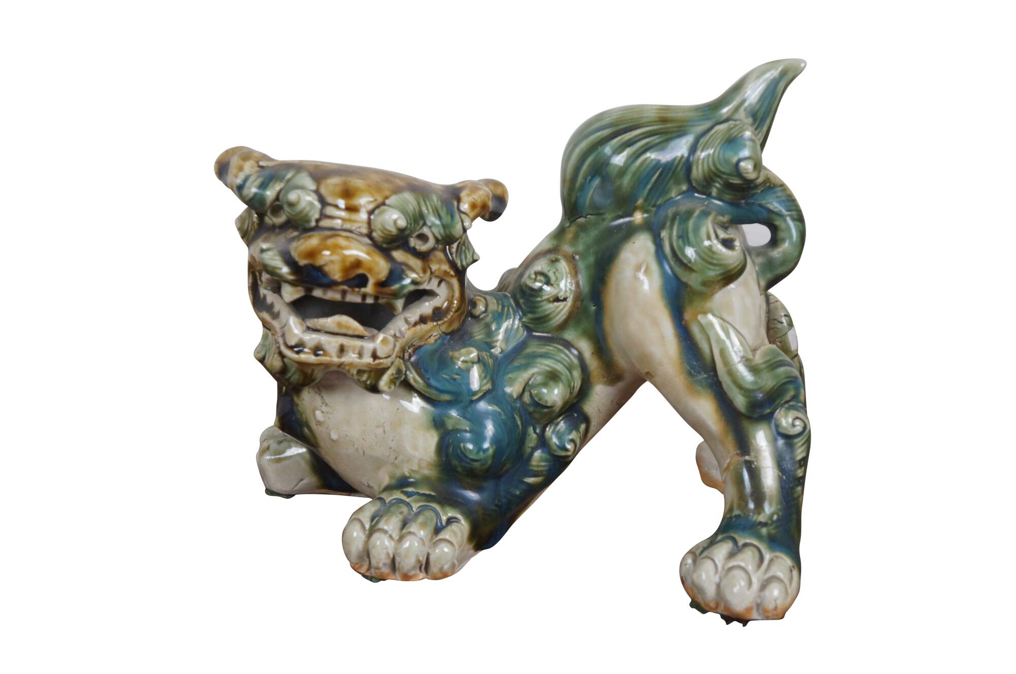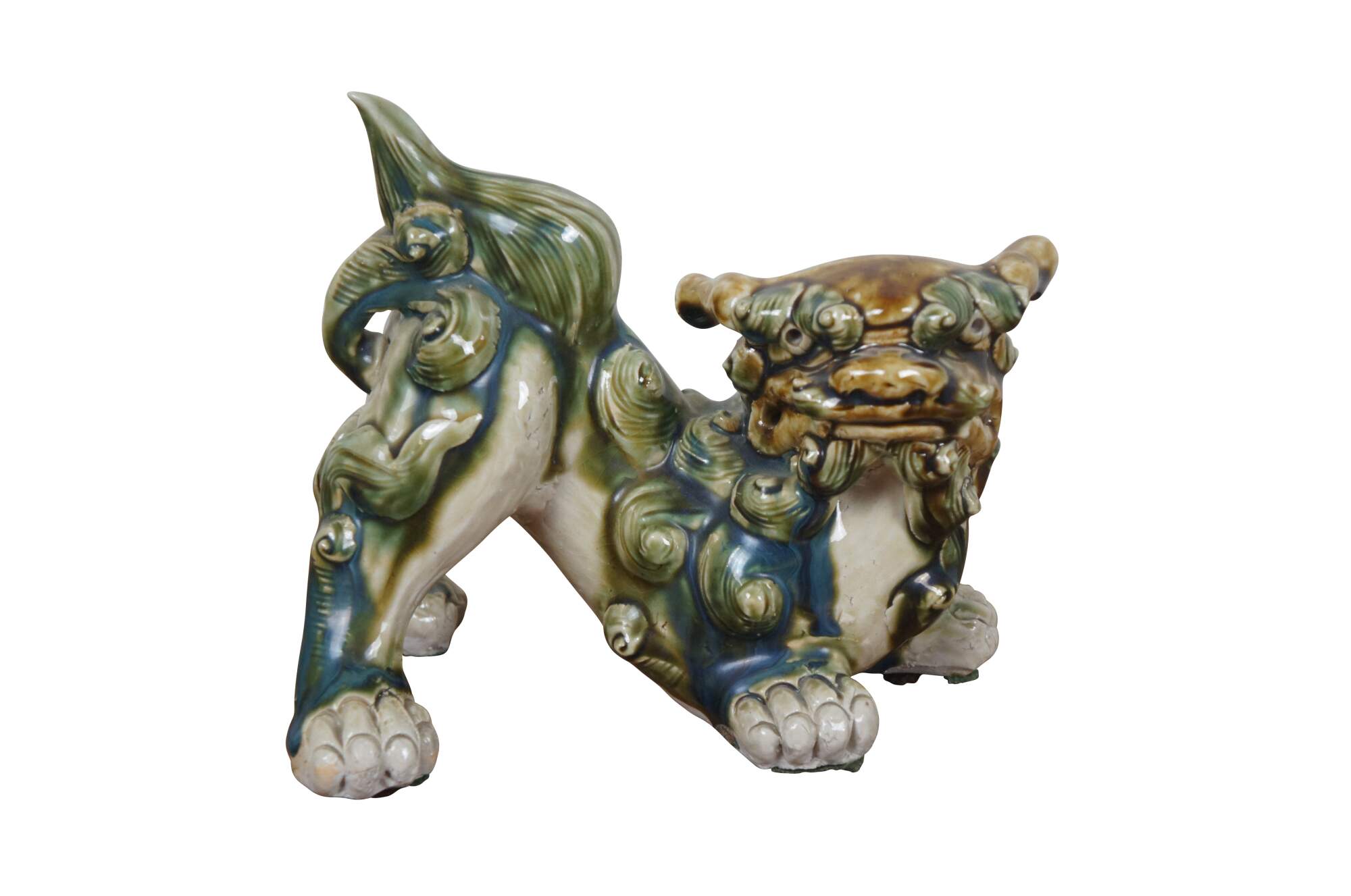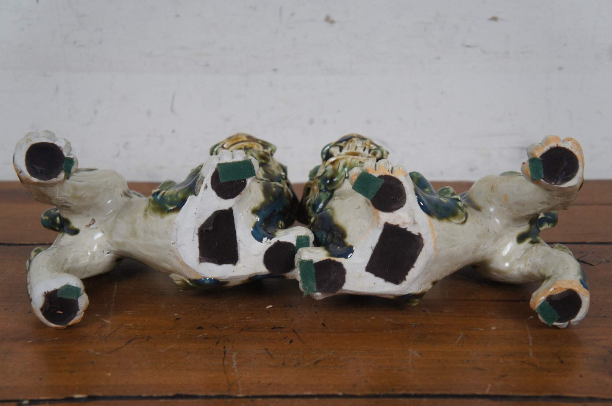 Pair of 20th century shishi / guardian lion / foo dog figurines. Ceramic glazed in green, teal and brown. Incised with Okinawa on rear leg.