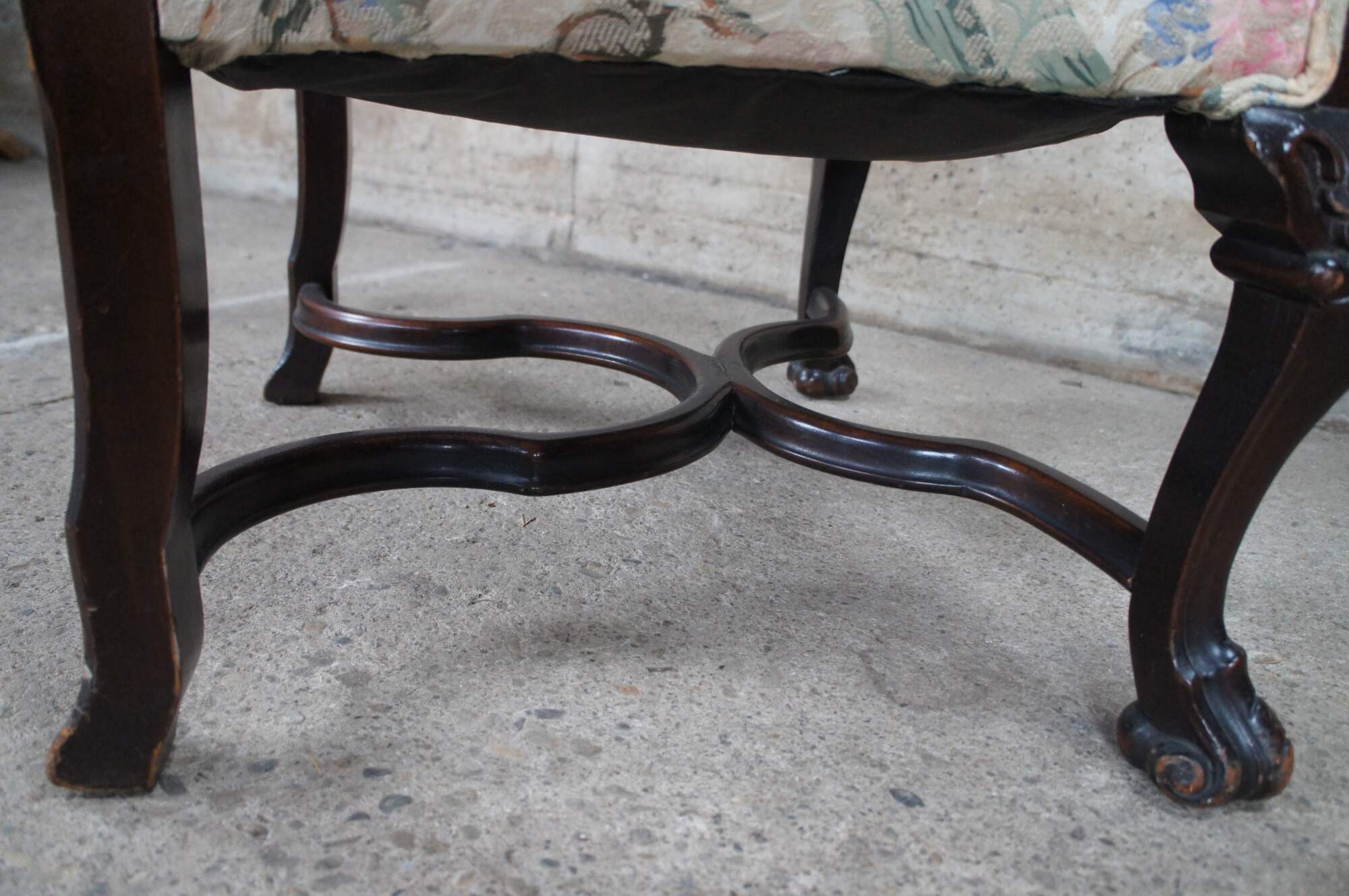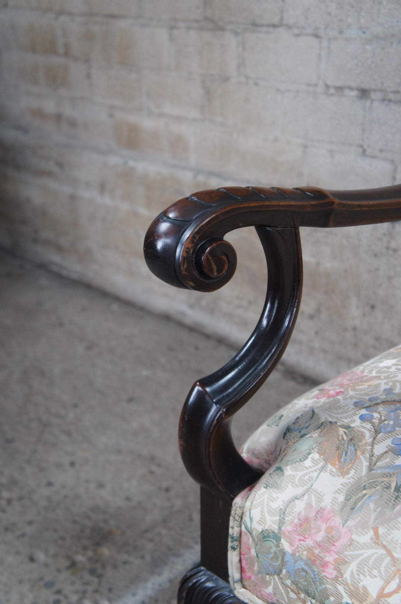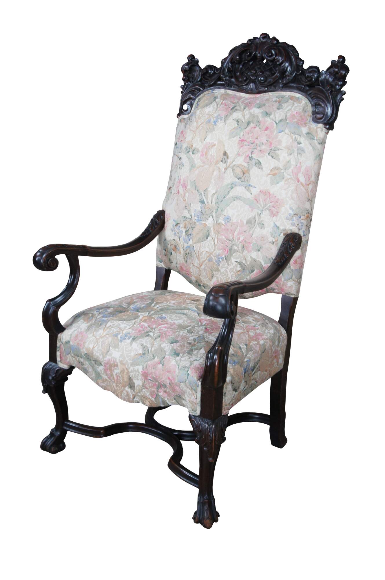 Antique French throne armchair. Made of walnut featuring carved serpentine design with reticulated floral and acanthus crown.
