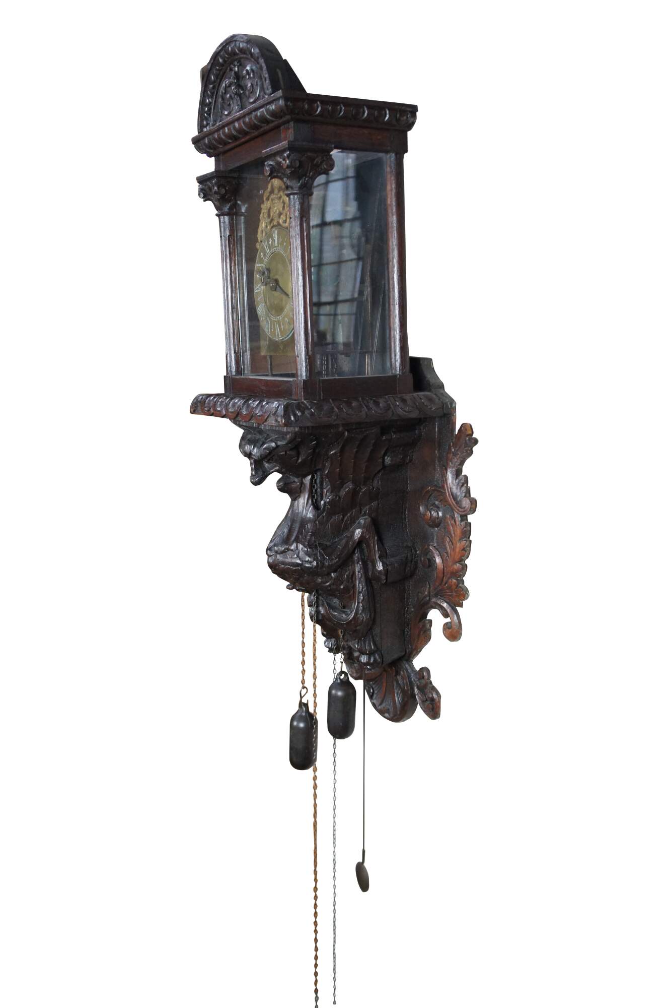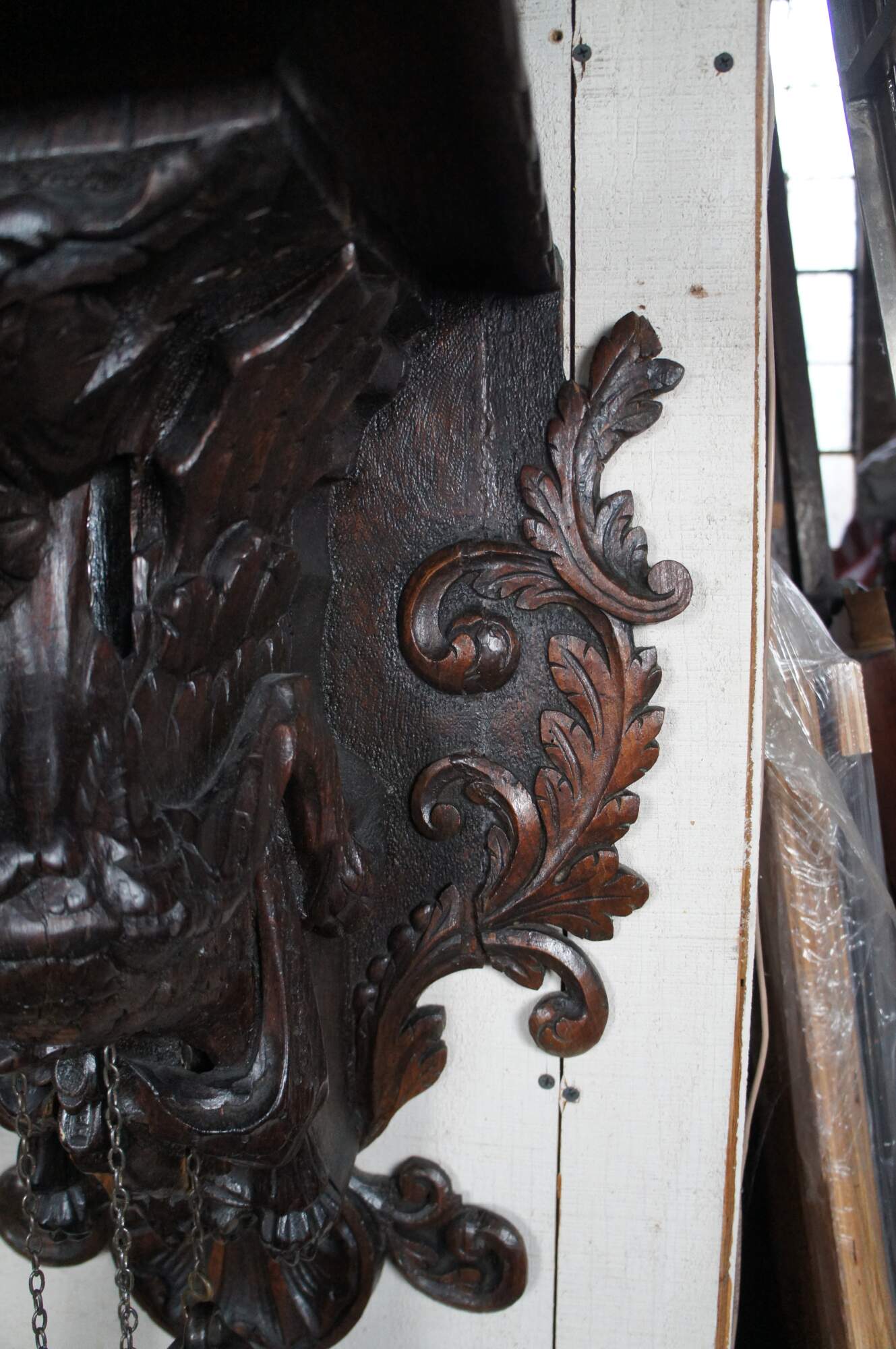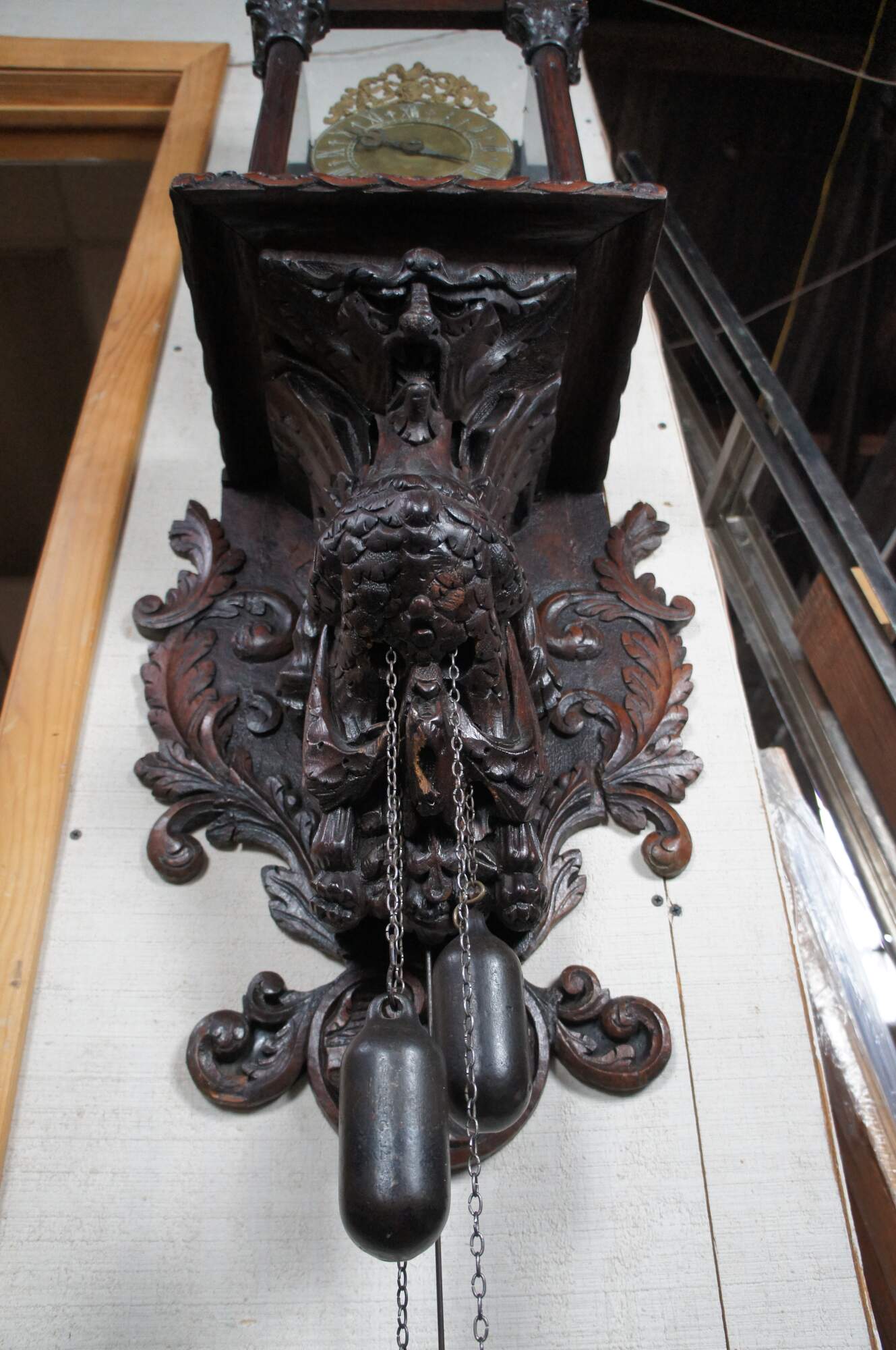 The time piece and case rest on a one of a kind life like figural hand carved oak corbel pedestal centererd by a high relief Bird / Griffon. The chains and pendulum are concealed inside of the animal and can be seen below. Case backing is is bordered by scrolling acanthus leaves. Hangs along the back via a large Iron hook.