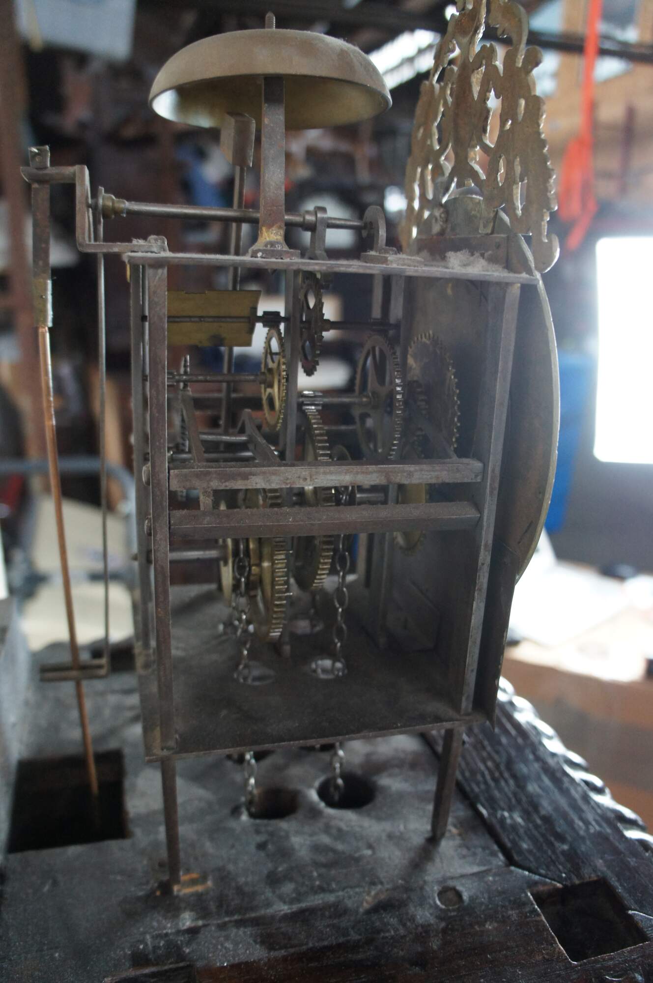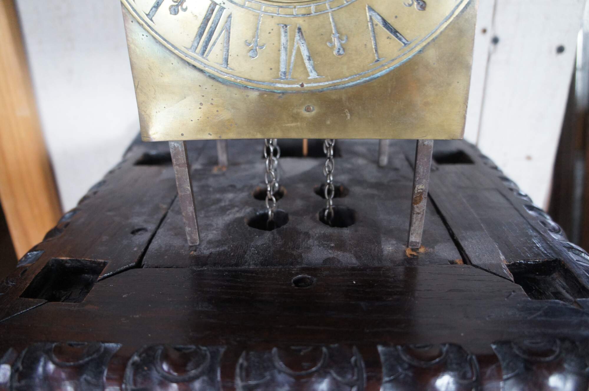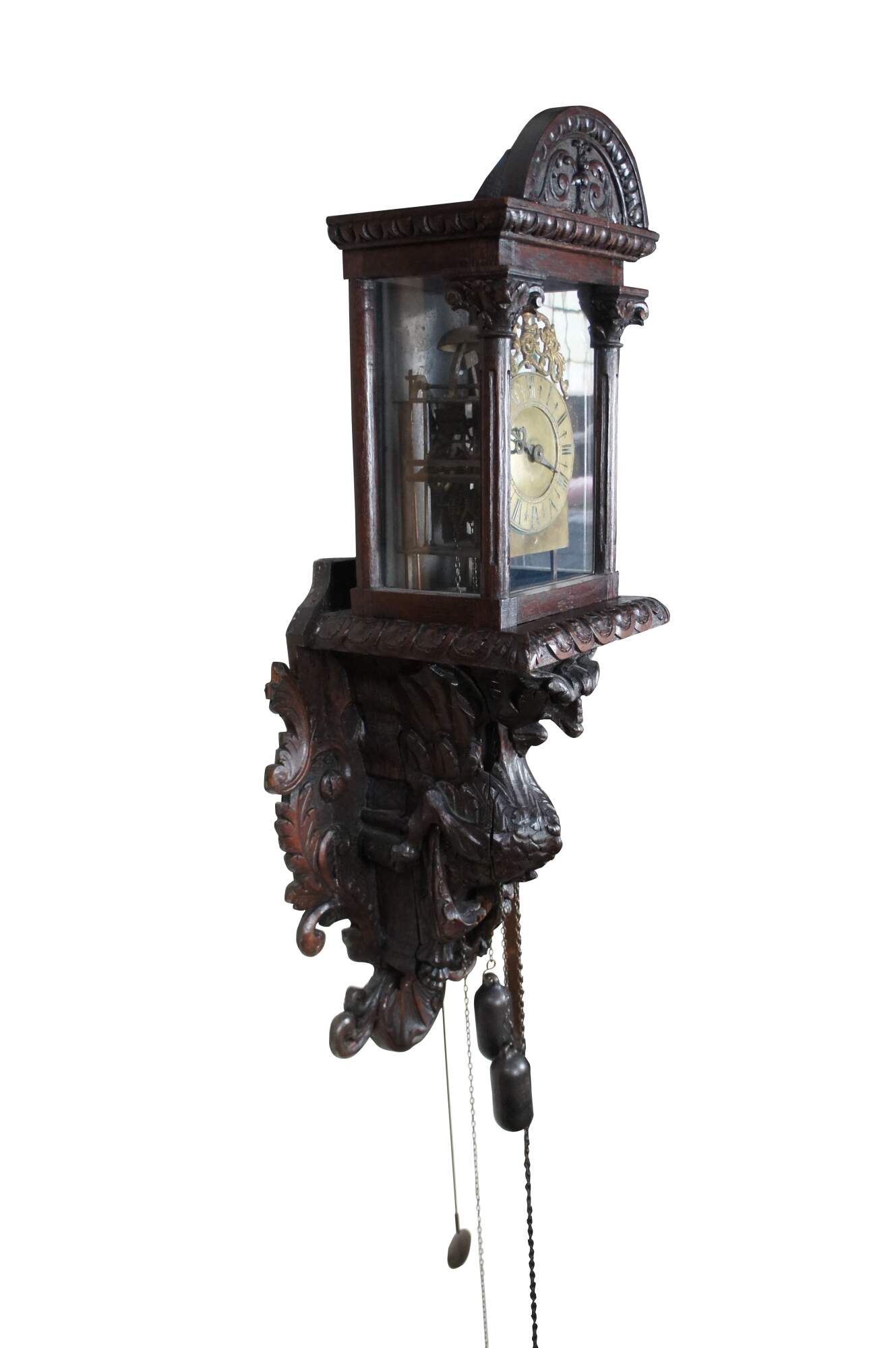 The time piece and case rest on a one of a kind life like figural hand carved oak corbel pedestal centererd by a high relief Bird / Griffon. The chains and pendulum are concealed inside of the animal and can be seen below. Case backing is is bordered by scrolling acanthus leaves. Hangs along the back via a large Iron hook.