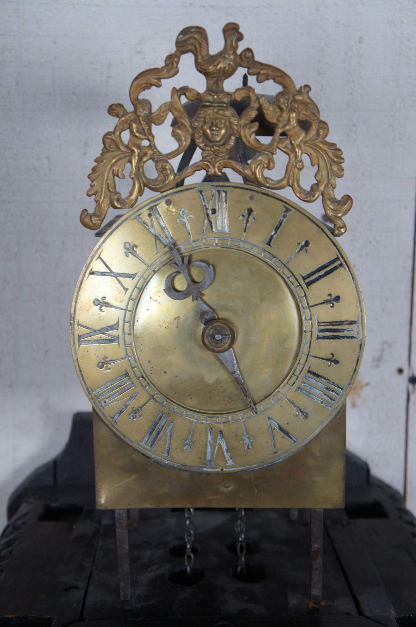 An exceptional hanging lantern clock from the 17th Century. The clock is housed within a hooded glass case with Grecian style carved columns, gadrooning and acanthus scrolled accents. Features a brass face with Roman Numerals, brass hands and a pierced brass pediment with inward facing cherubs, a rooster and central figure. The works are not marked, but appear to be English.