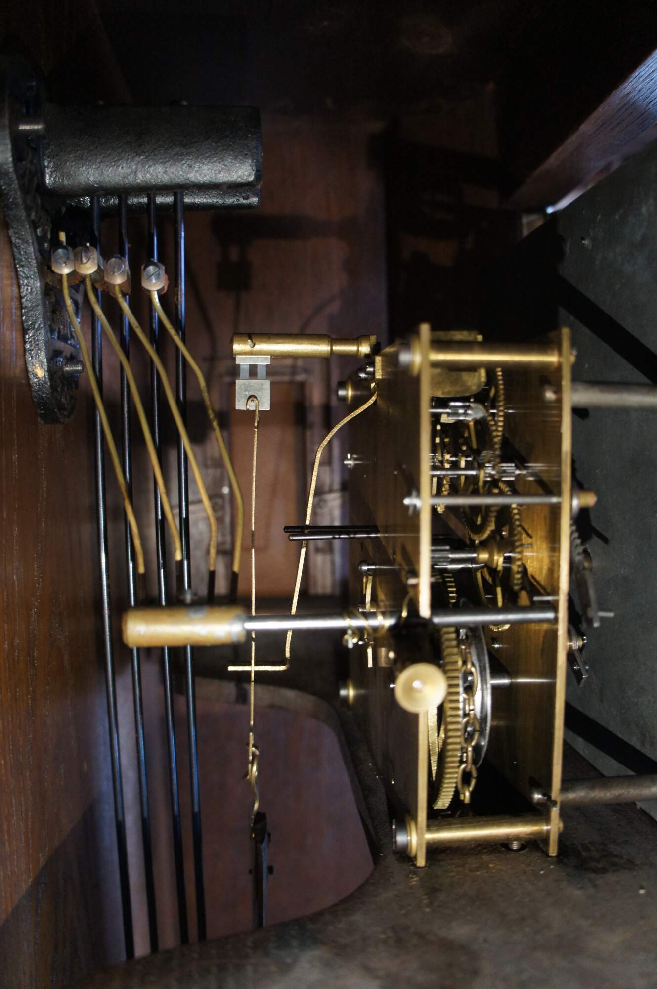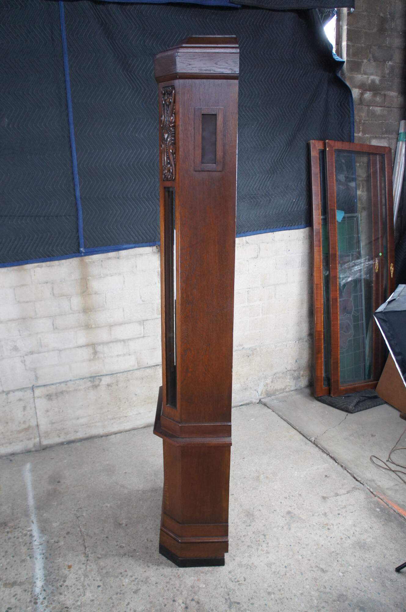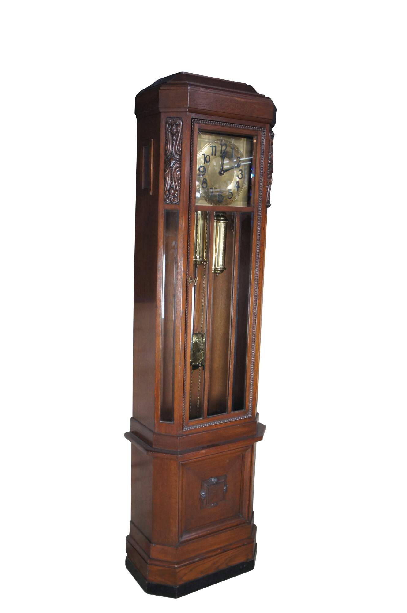 Antique Victorian German long case grandfather clock. Made of oak featuring a faceted design with carved panels, beveled glass and brass face / weights / pendulum.