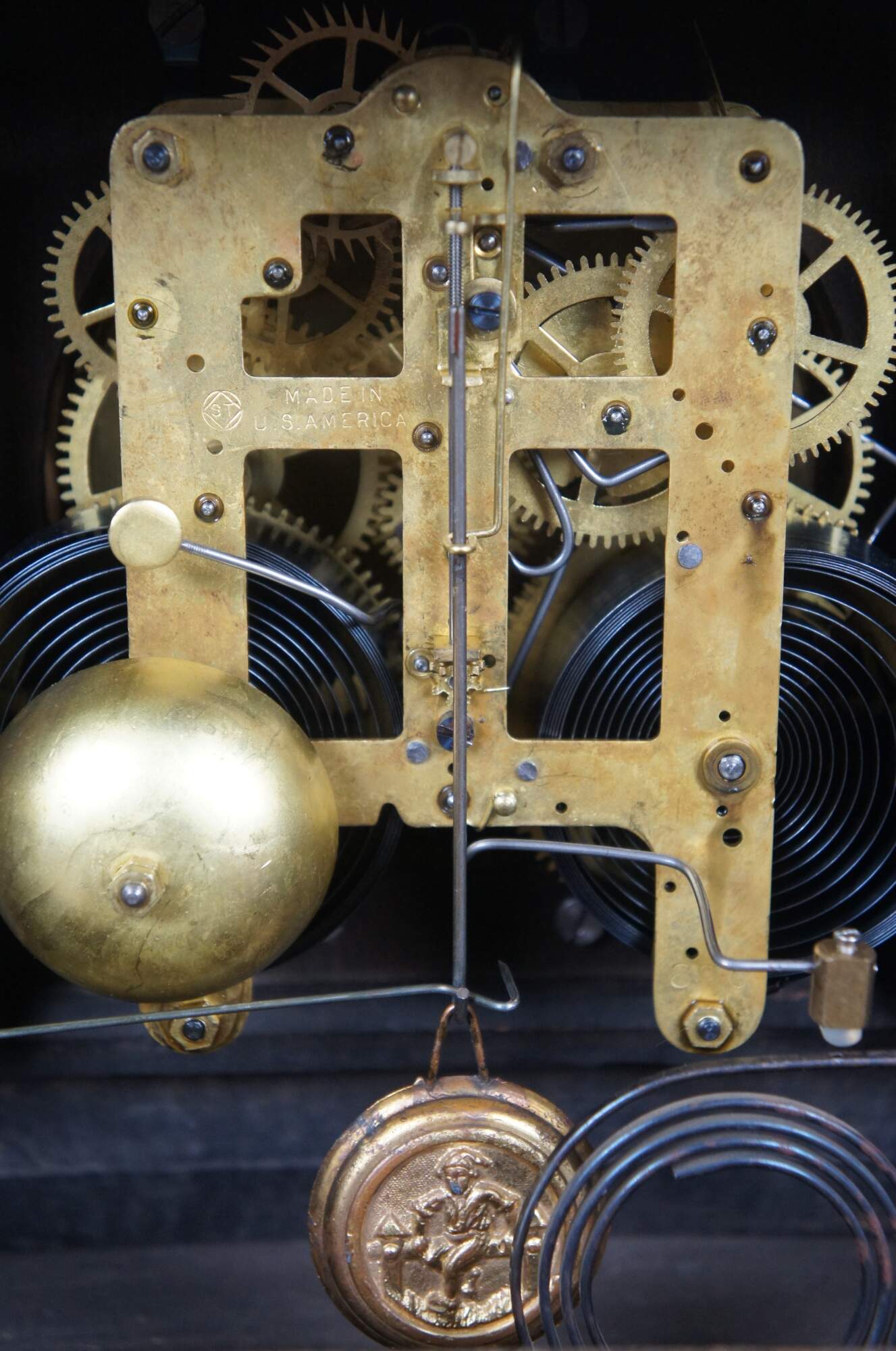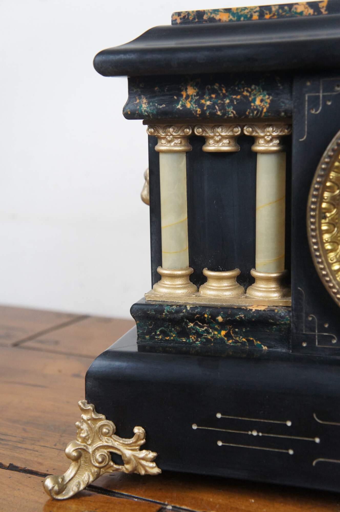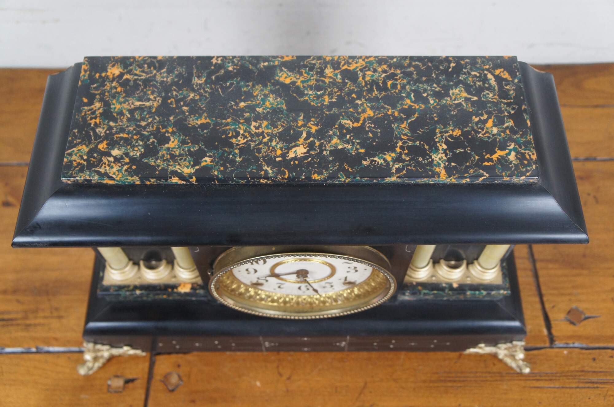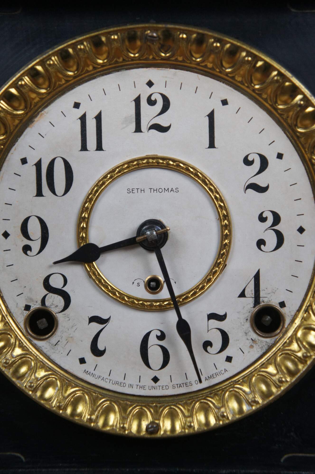 Early 20th century seth Thomas key wound, 8 day chiming mantel clock. Ebonized wood body with delicate white art deco details, green / orange / black adamantine accents and six off white adamantine columns. Brass acanthus leaf feet, lion's head ring handles and ionic column caps.