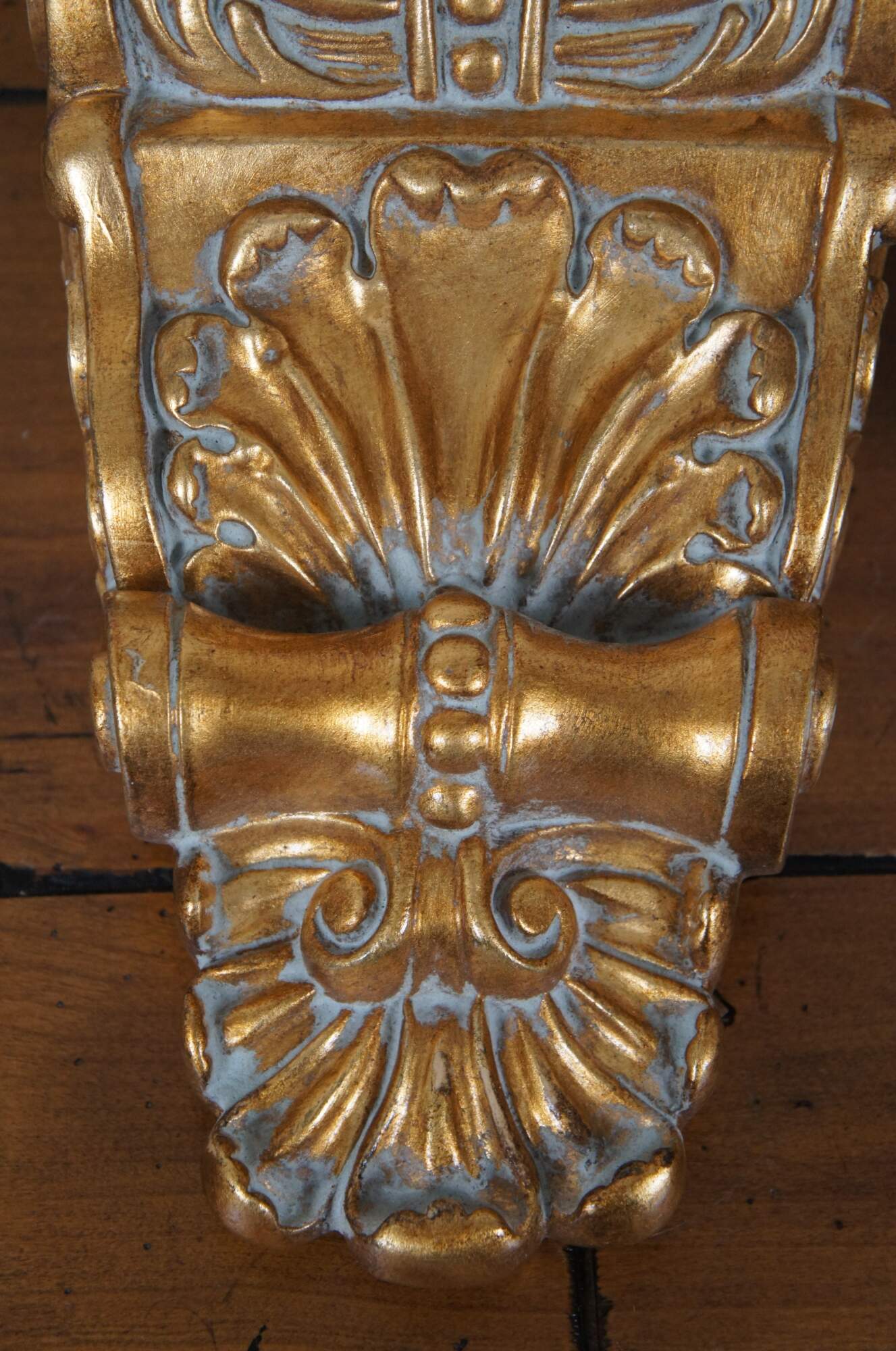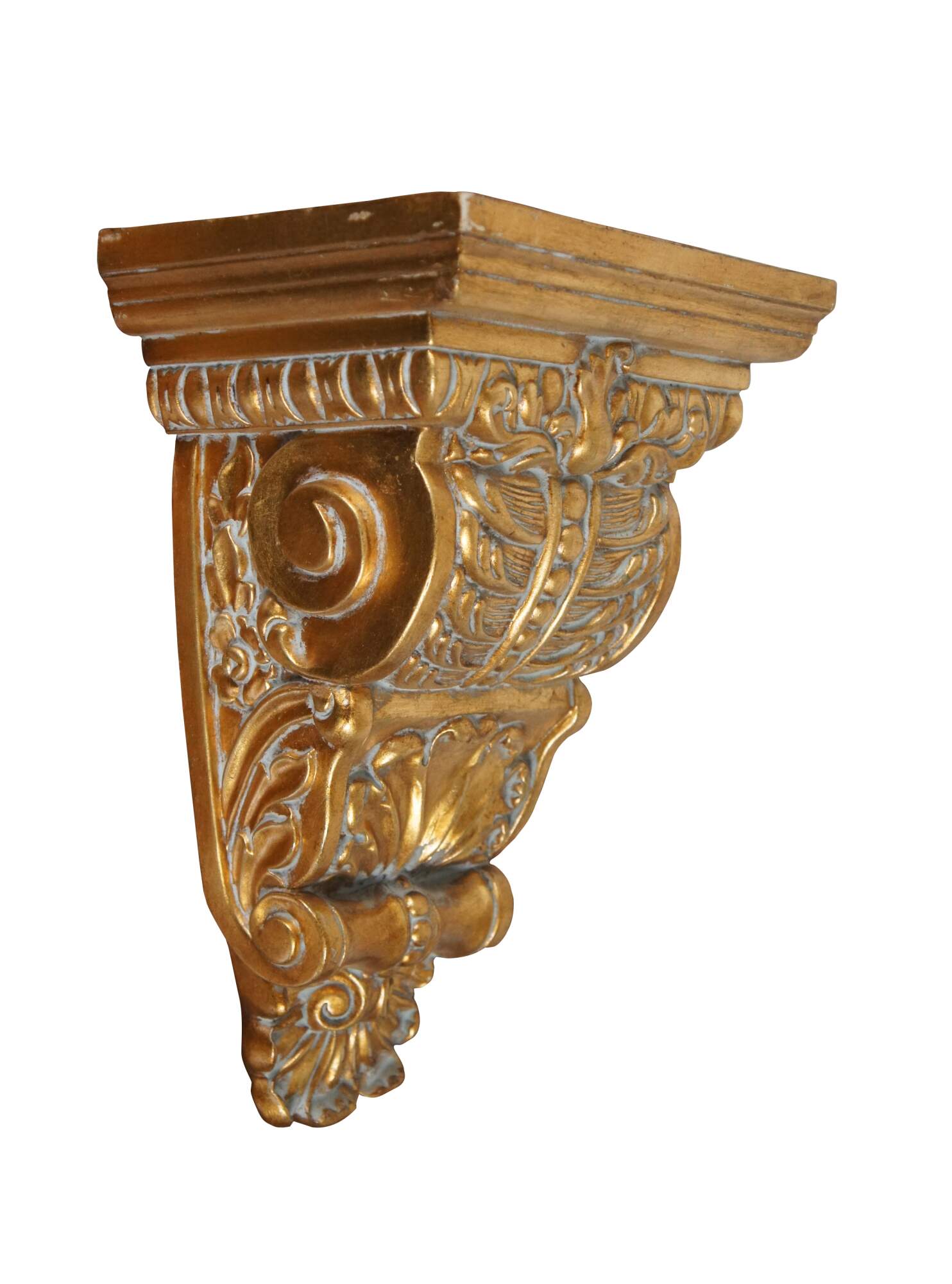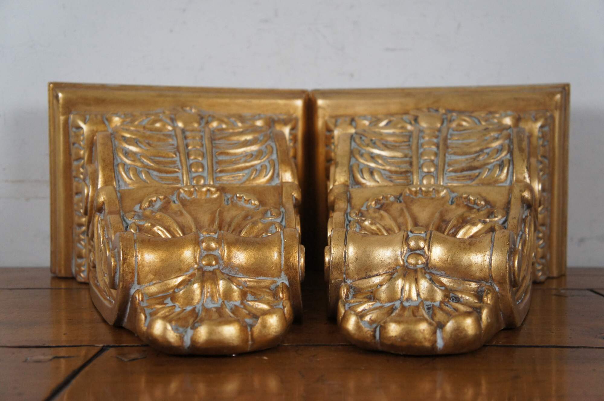 Pair of vintage 20th century gilt corbels / wall brackets / shelves with a French inspired design of scallops, foliates, and scrollwork. Rectangular top. Composite foam with inset picture hooks.