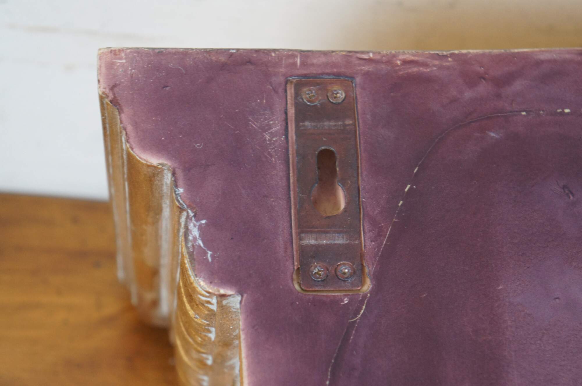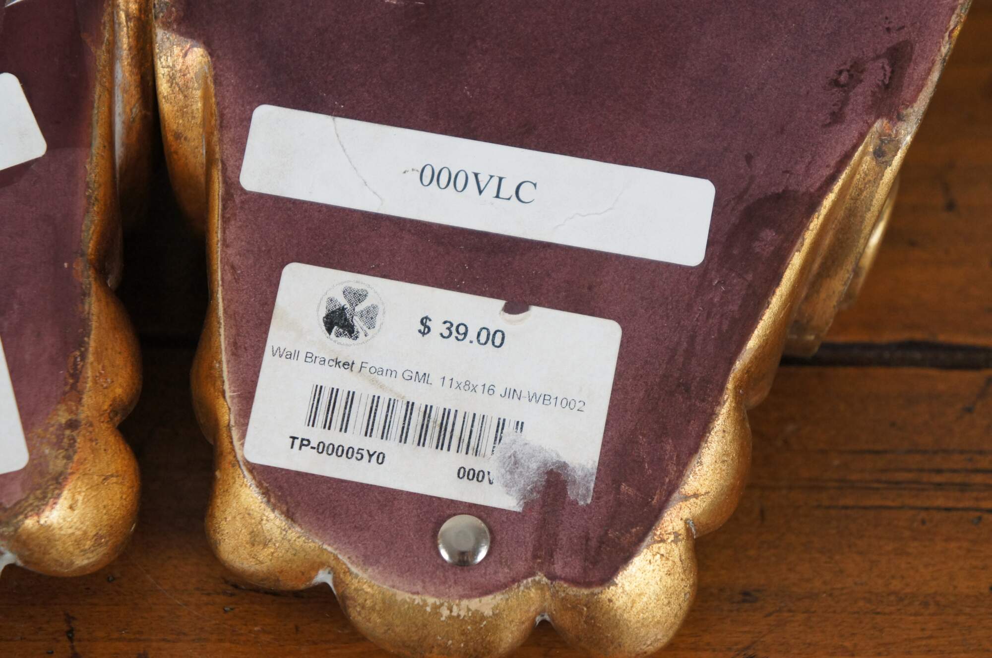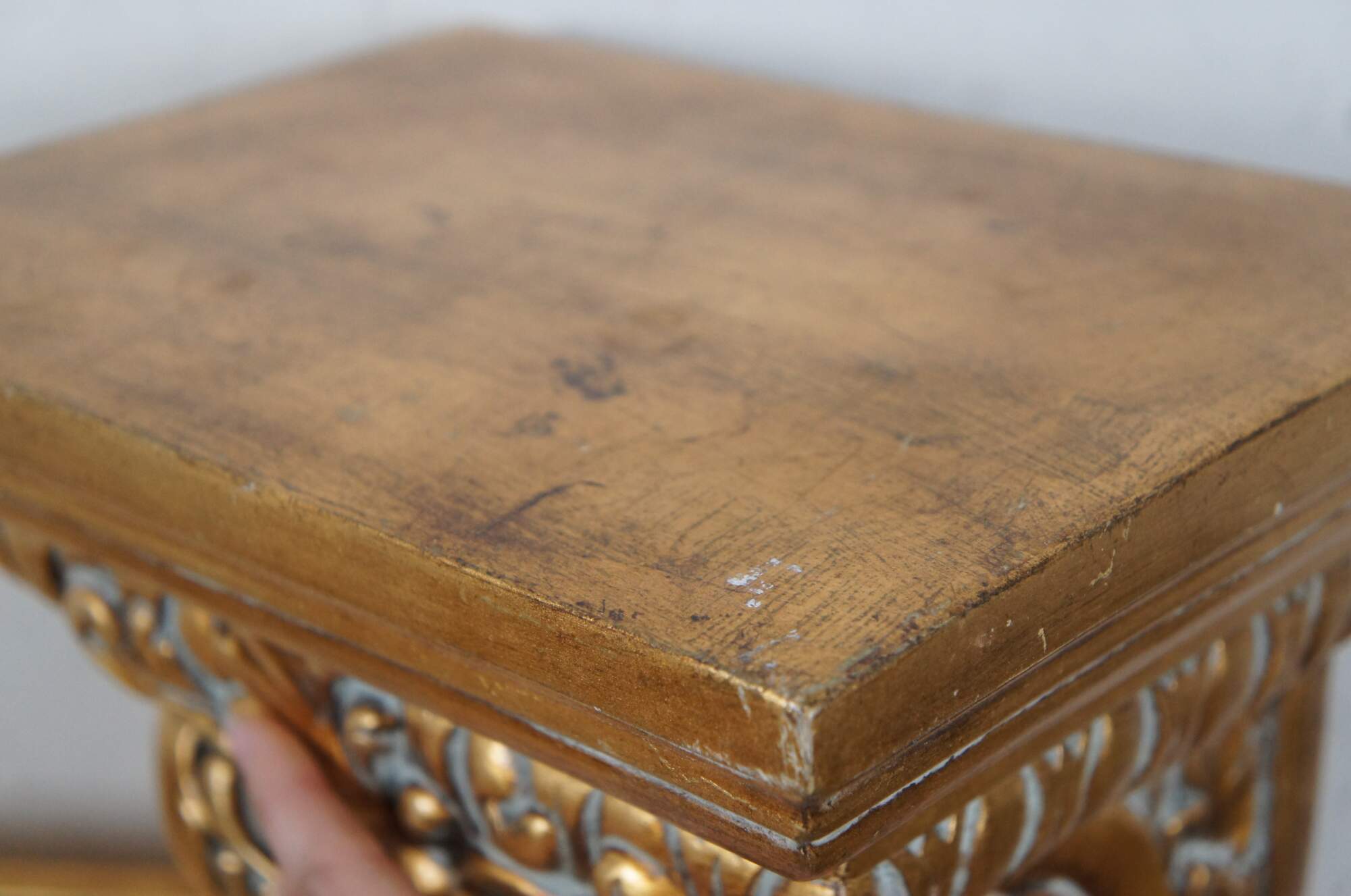 Pair of vintage 20th century gilt corbels / wall brackets / shelves with a French inspired design of scallops, foliates, and scrollwork. Rectangular top. Composite foam with inset picture hooks.
