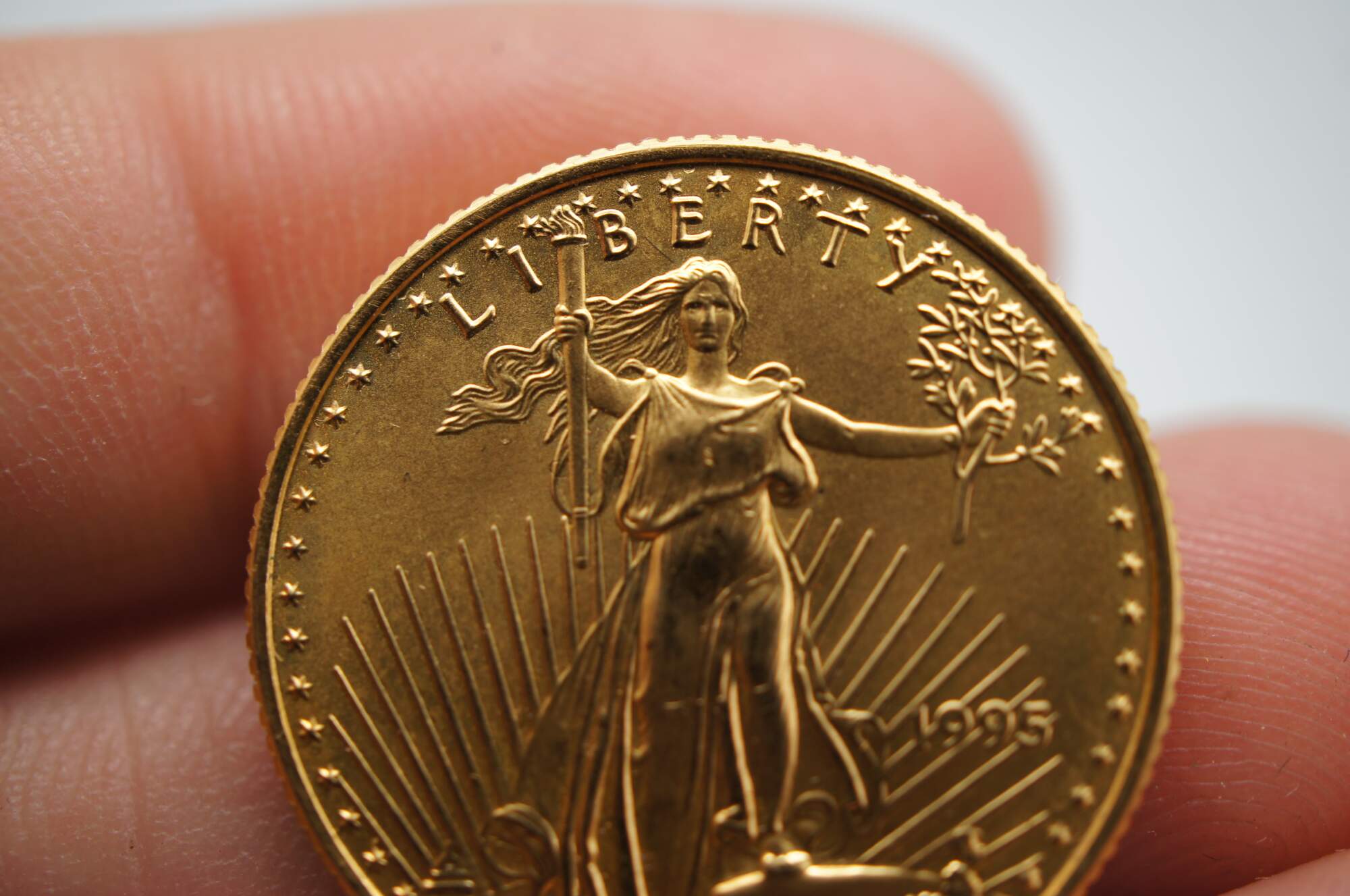 Vintage 1995 United States of America $10 coin made of 1/4 oz fine gold. Obverse: Lady Liberty walks toward the viewer with a torch and olive branch in her hands, across a landscape with the US Capitol Building at the left and oak leaves at the right, before the rays of the rising/setting sun. Date year at middle right, Liberty across top, frame of 50 stars. Reverse: American Blad Eagle carrying an olive branch flying over a tree branch with three other eagles. United States of America at top, E Pluribus Unum at middle left, In God We Trust at middle right, 1/4 oz. Fine Gold ~ 10 Dollars across bottom. Includes a plastic coin sleeve.