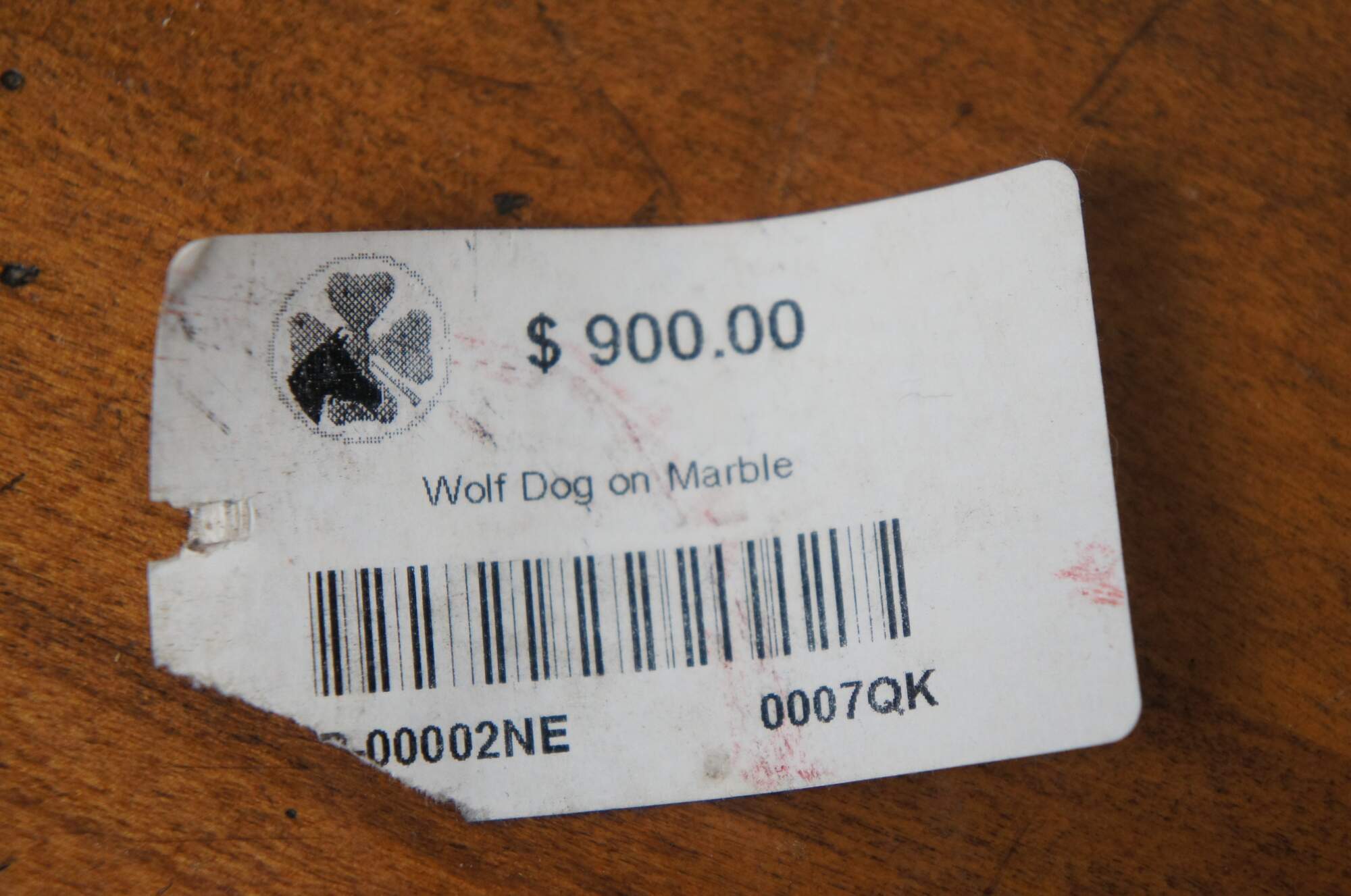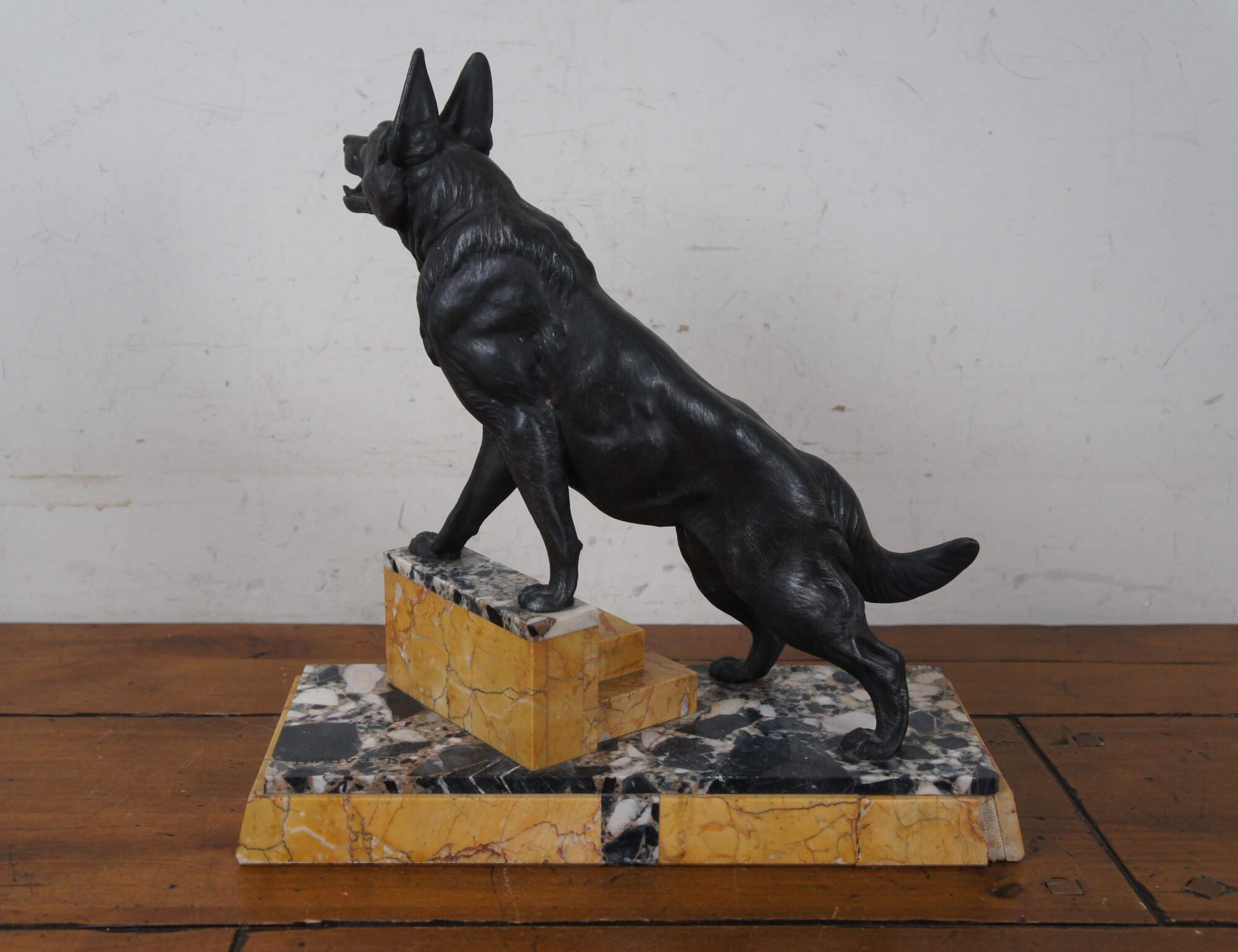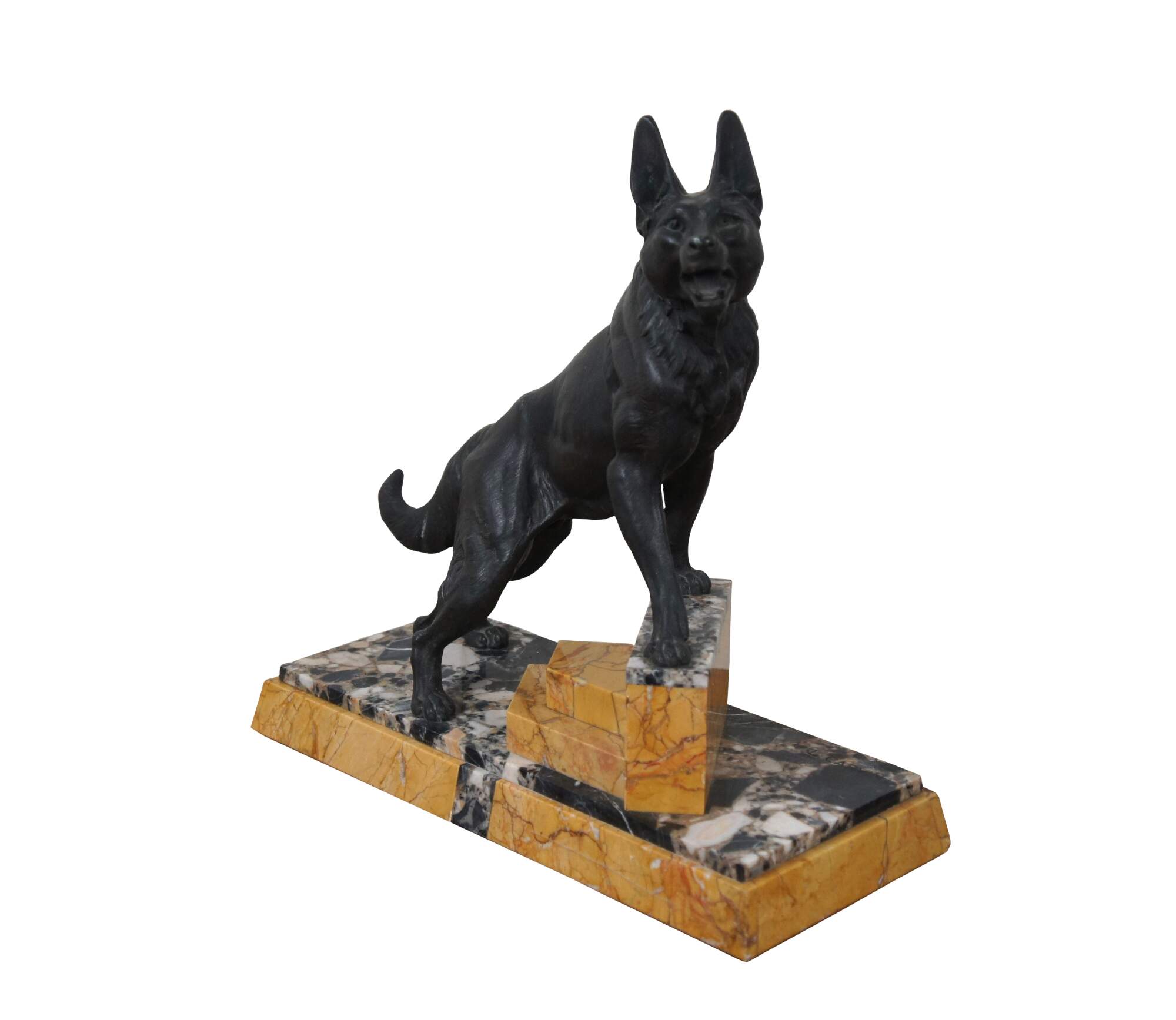 Antique early 20th century art deco spelter sculpture / statue after Louis Albert Carvin, depicting a large wolf like Alsatian German Shepherd / dog with collar, standing on a small set of steps crafted of golden yellow and black and white marble.