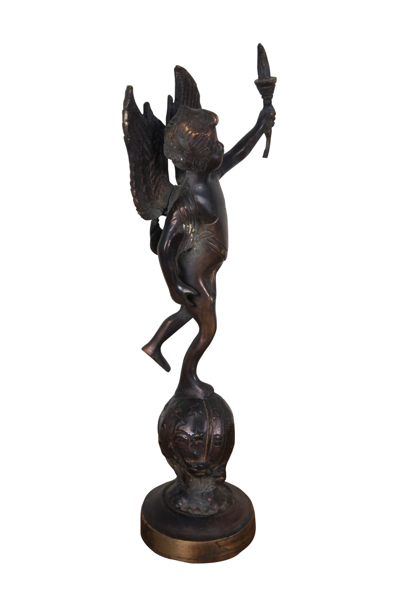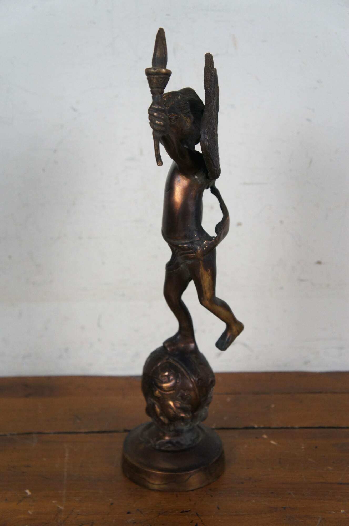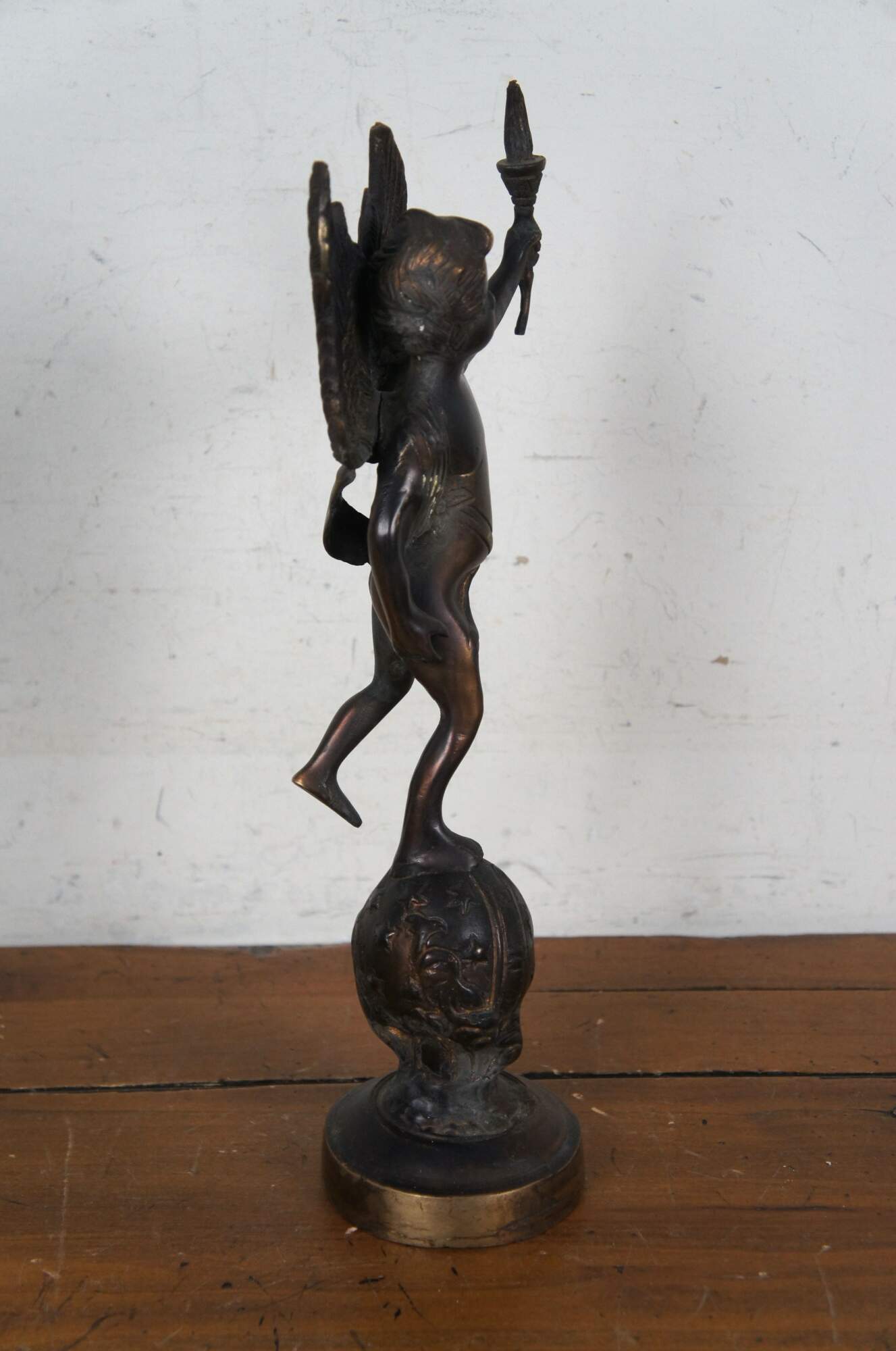 Vintage cast bronze sculpture / figurine in the shape of a putto / cherub / angel carrying a torch, perched on top of a globe studded with stars.