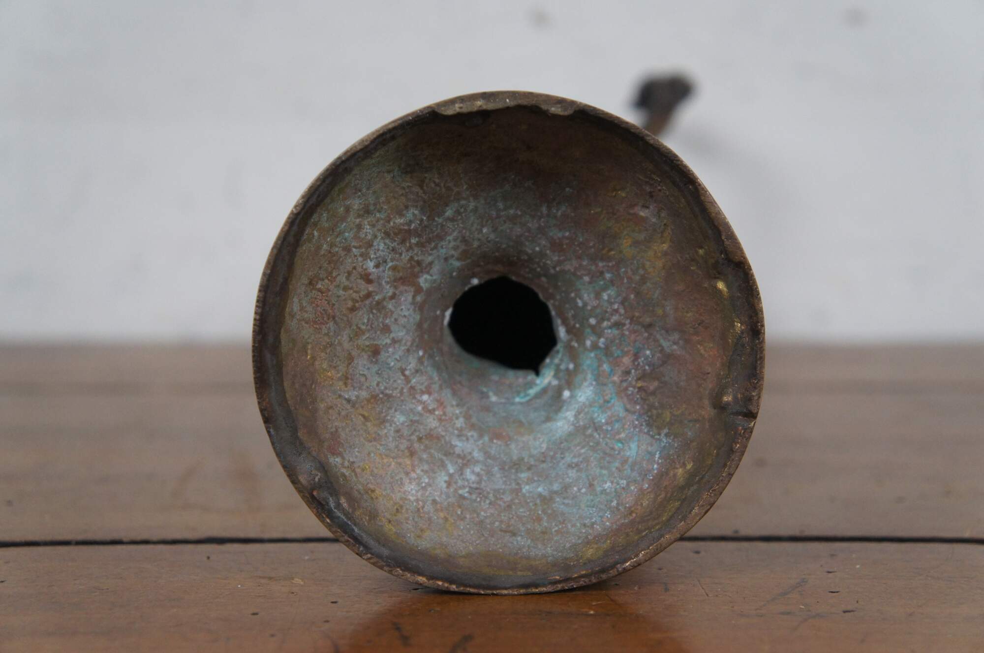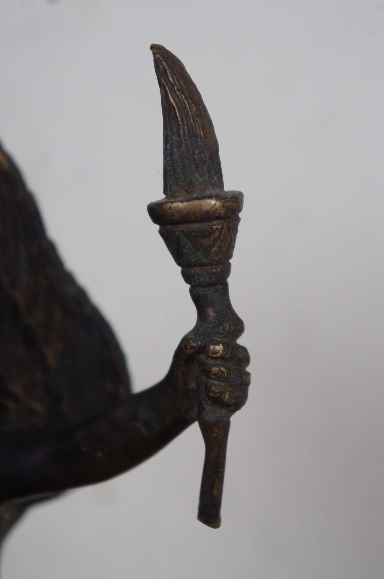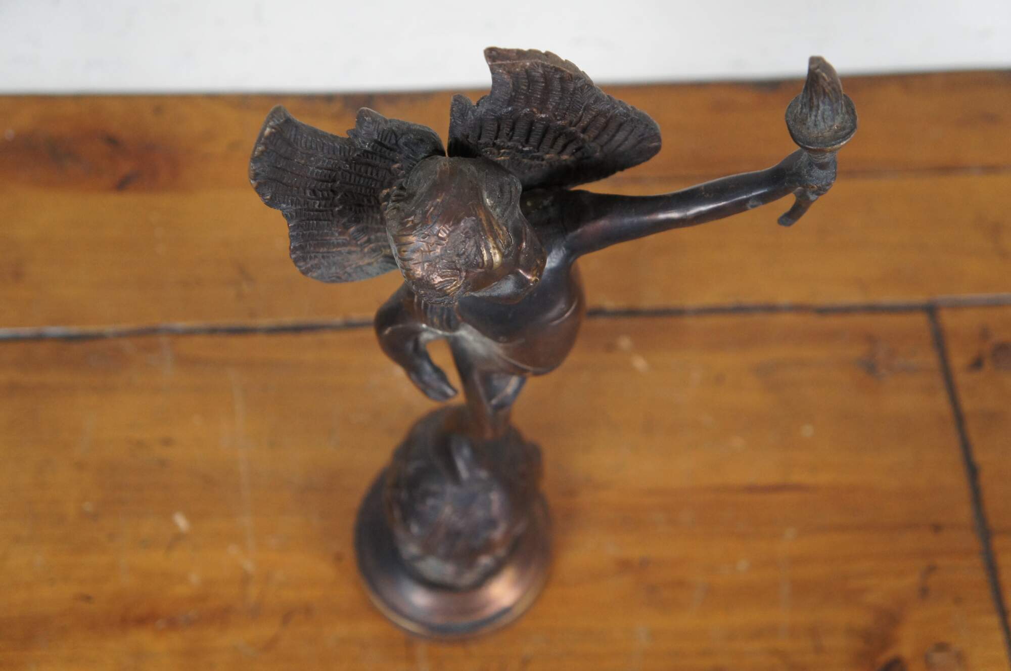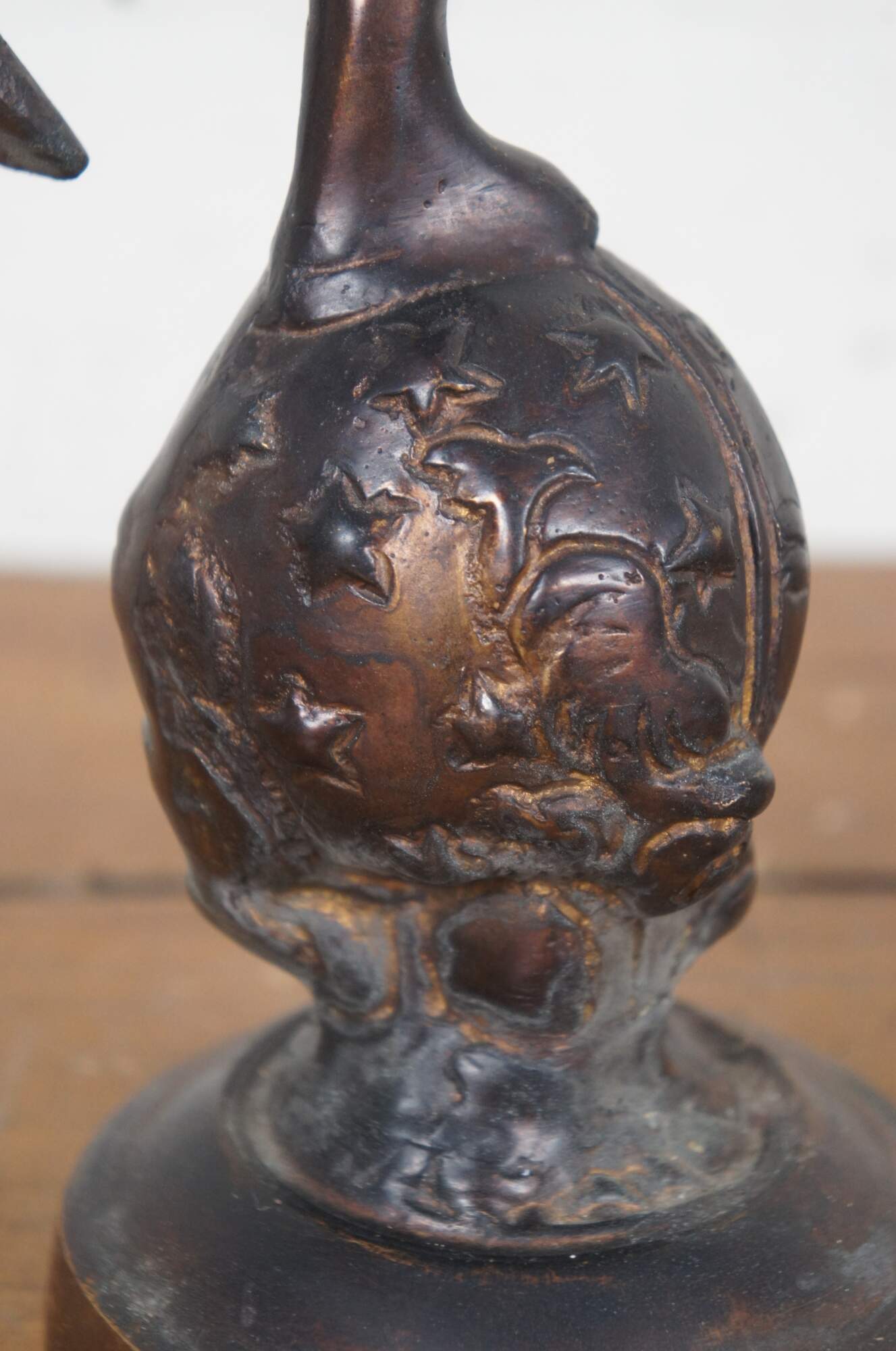 Vintage cast bronze sculpture / figurine in the shape of a putto / cherub / angel carrying a torch, perched on top of a globe studded with stars.