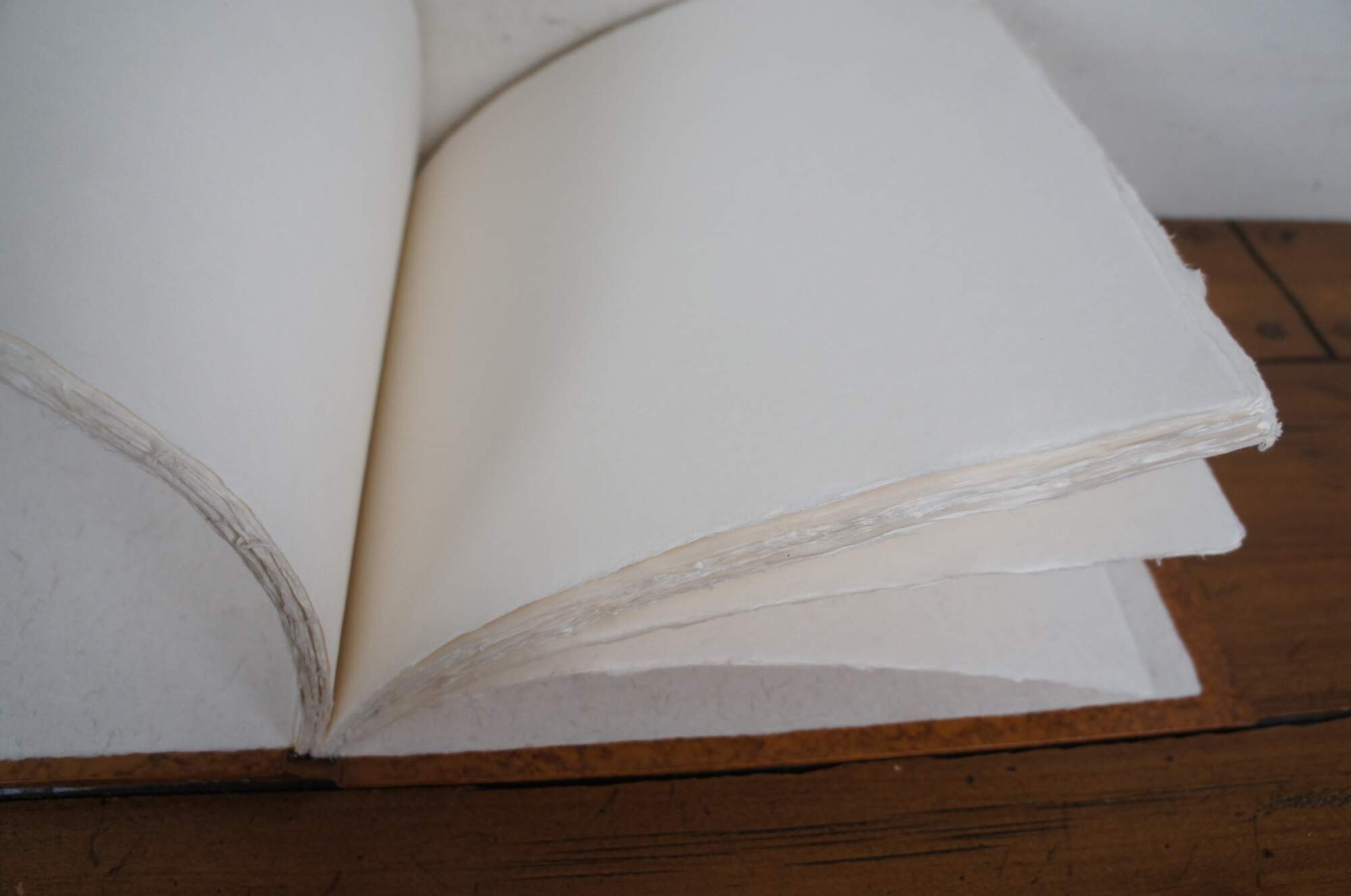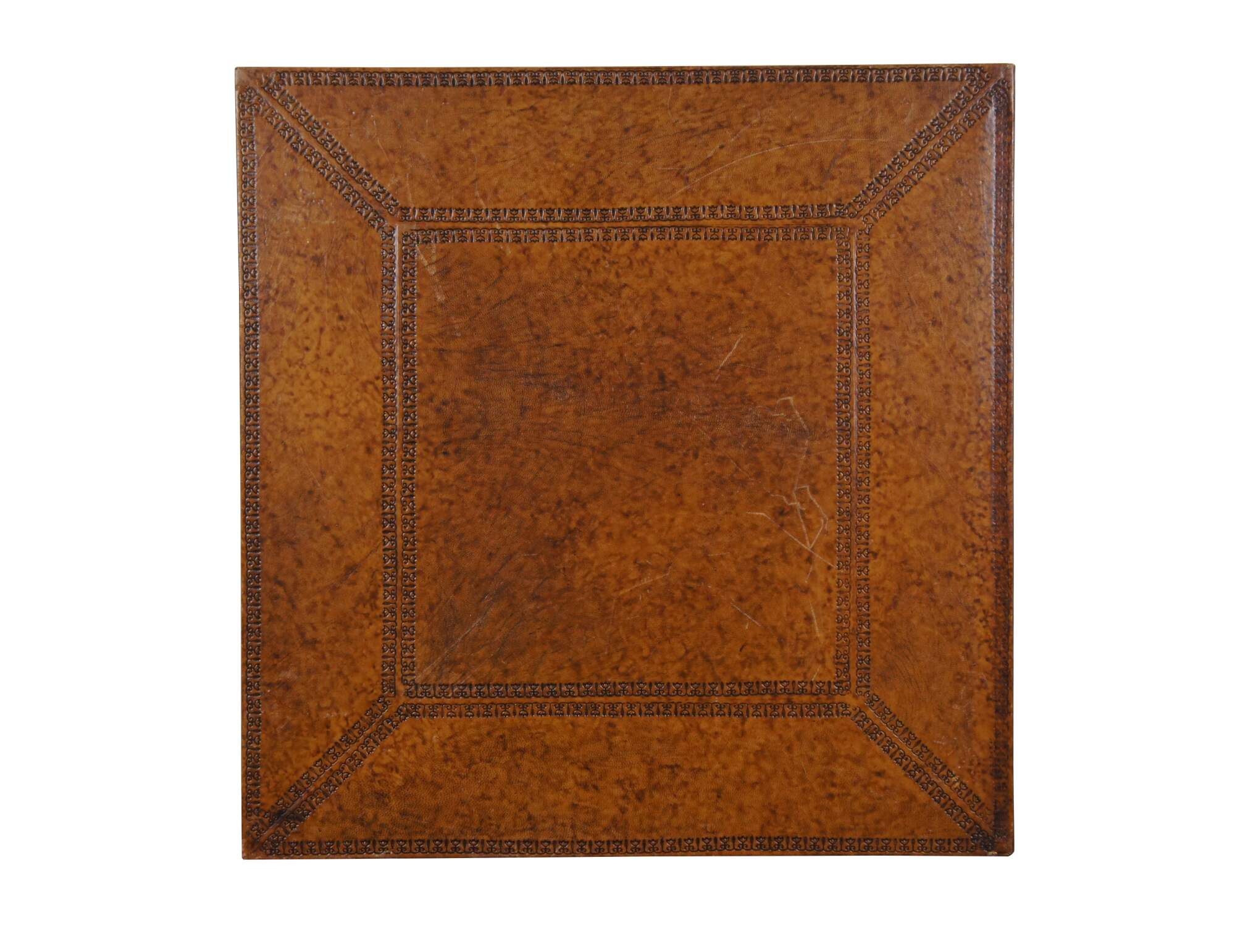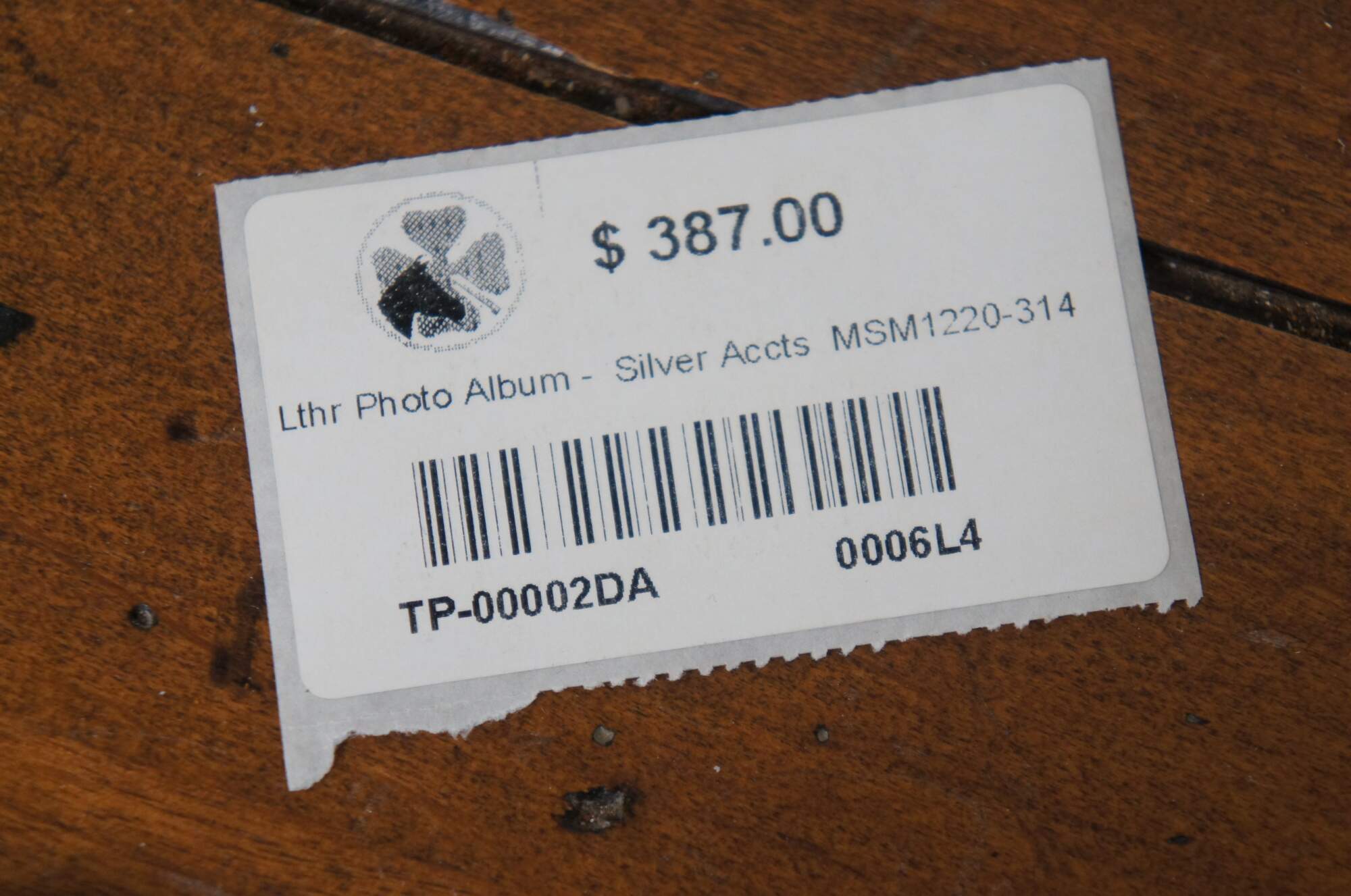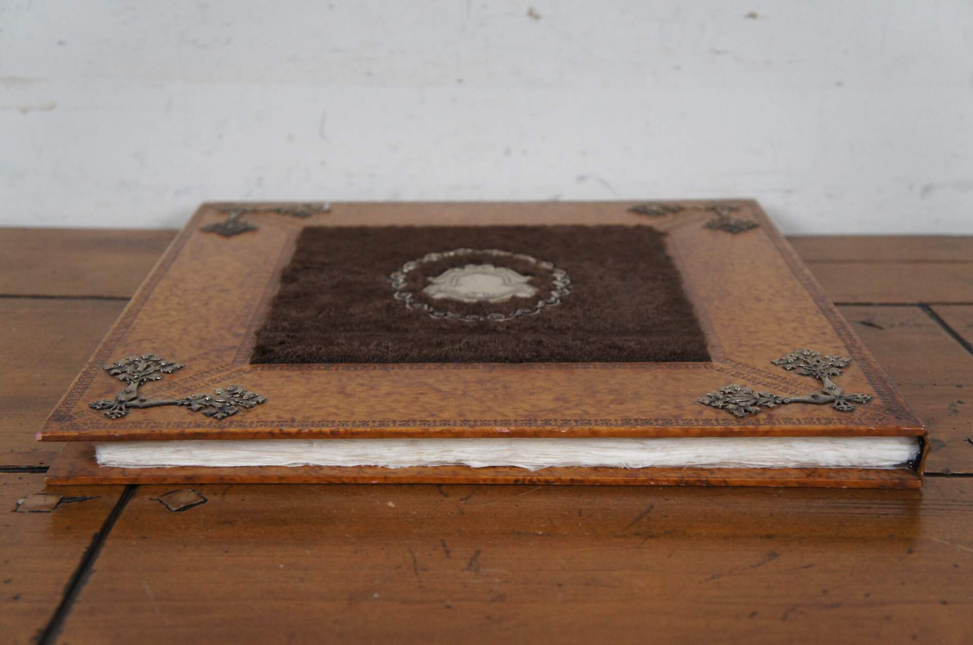 Vintage late 20th century Maitland Smith French Regency style photo album / scrap book. Bound in mottled tooled leather with panel of faux fur at the center, and accented with a shield and floral silver plate appliques. Raw edged blank pages.