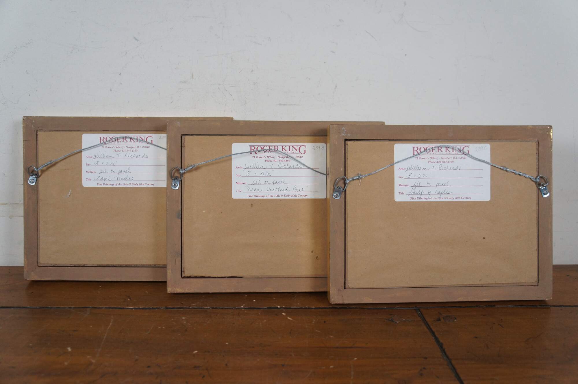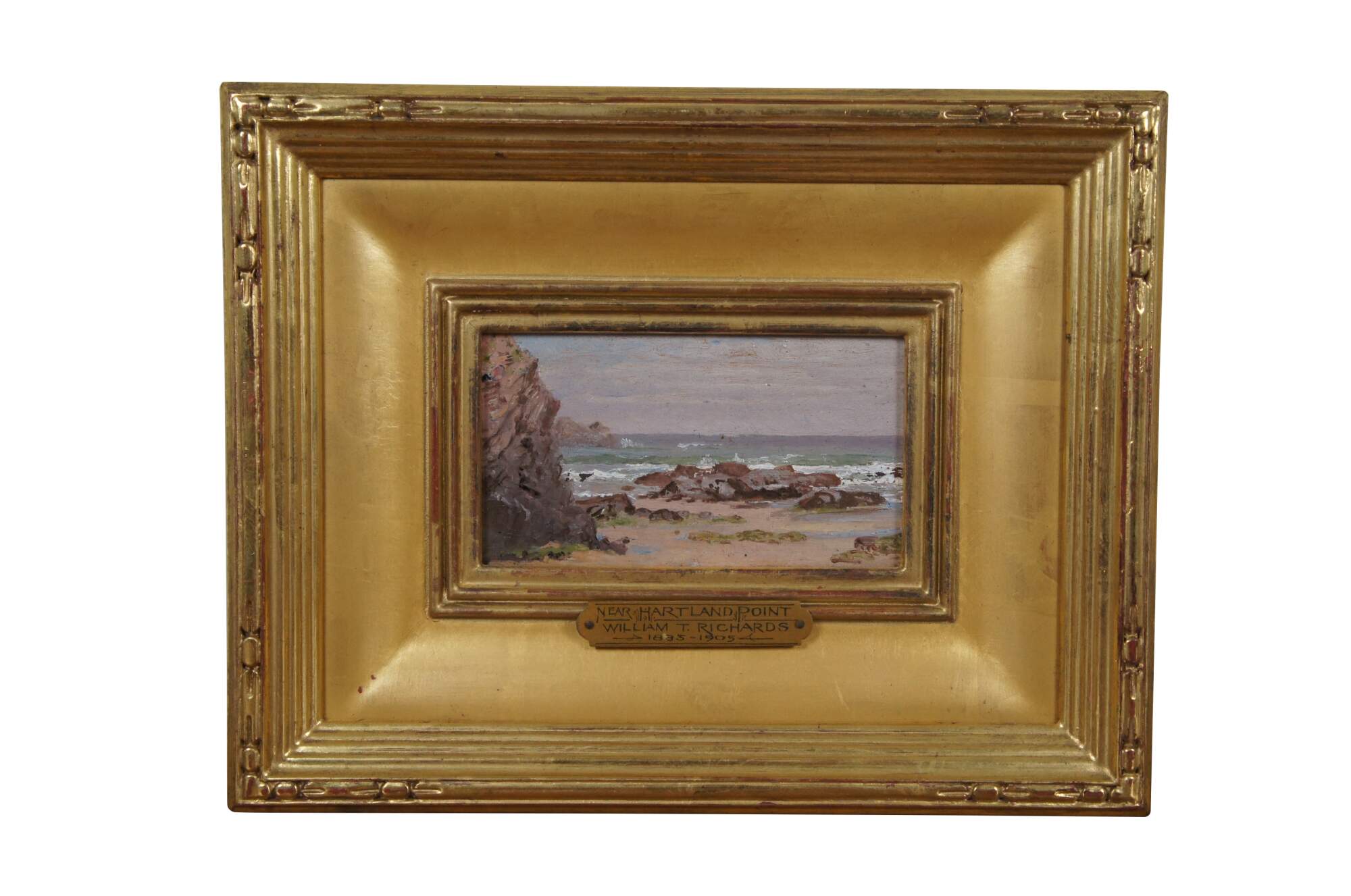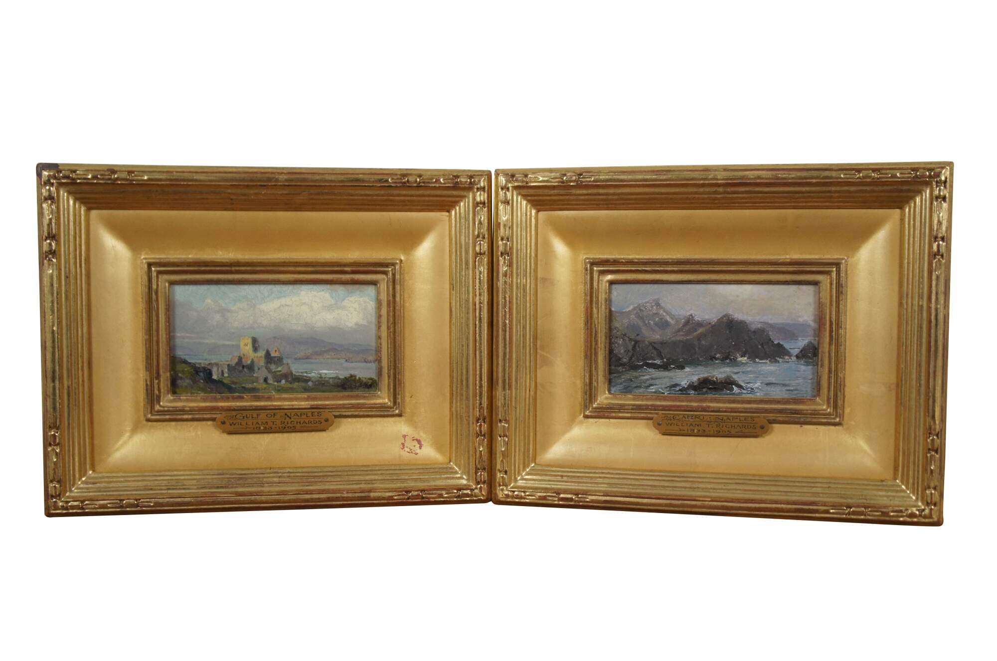 3 antique oil on board miniature seascape paintings by William Trost Richards, depicting rocky, seaside cliffs / hills (Capri, Naples); a rocky beach (Near Hartland Point); and the ruins of a castle in a hilly landscape (Gulf of Naples). Wide, beveled giltwood frames with ridged borders and carved outer edge.