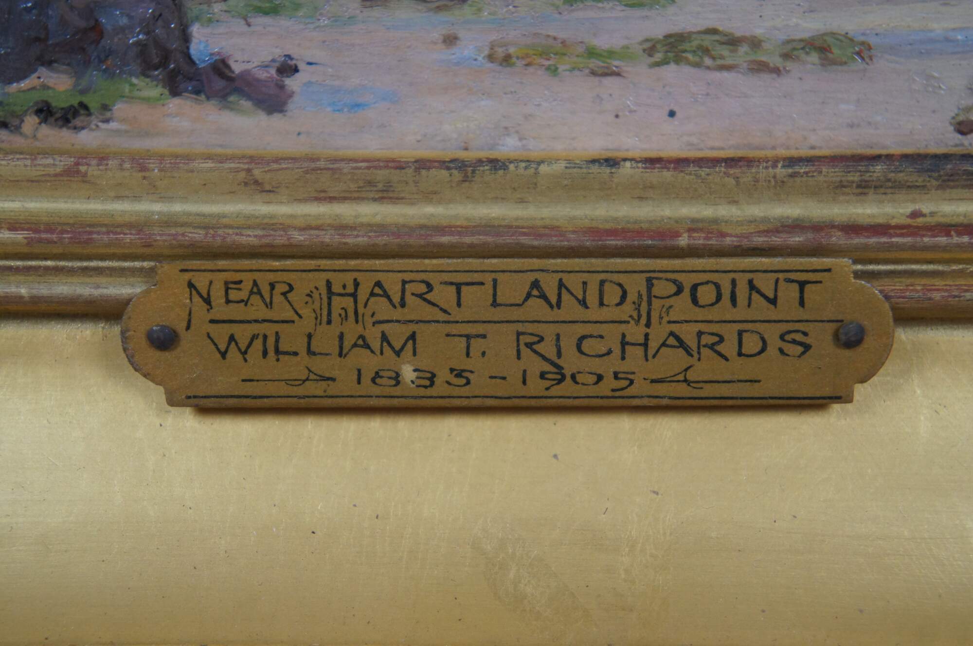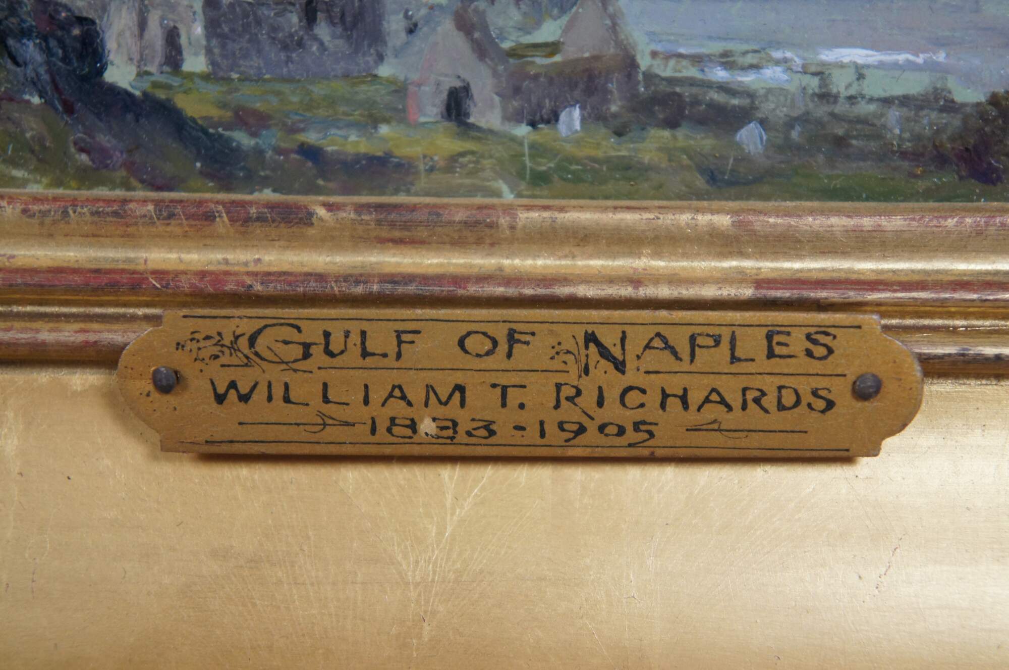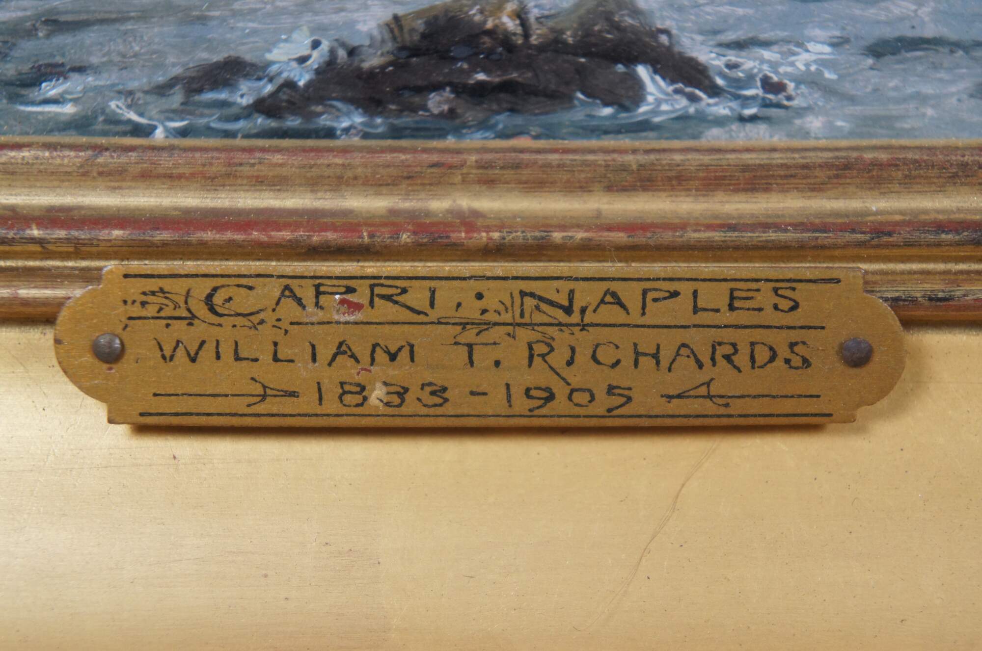 3 antique oil on board miniature seascape paintings by William Trost Richards, depicting rocky, seaside cliffs / hills (Capri, Naples); a rocky beach (Near Hartland Point); and the ruins of a castle in a hilly landscape (Gulf of Naples). Wide, beveled giltwood frames with ridged borders and carved outer edge.