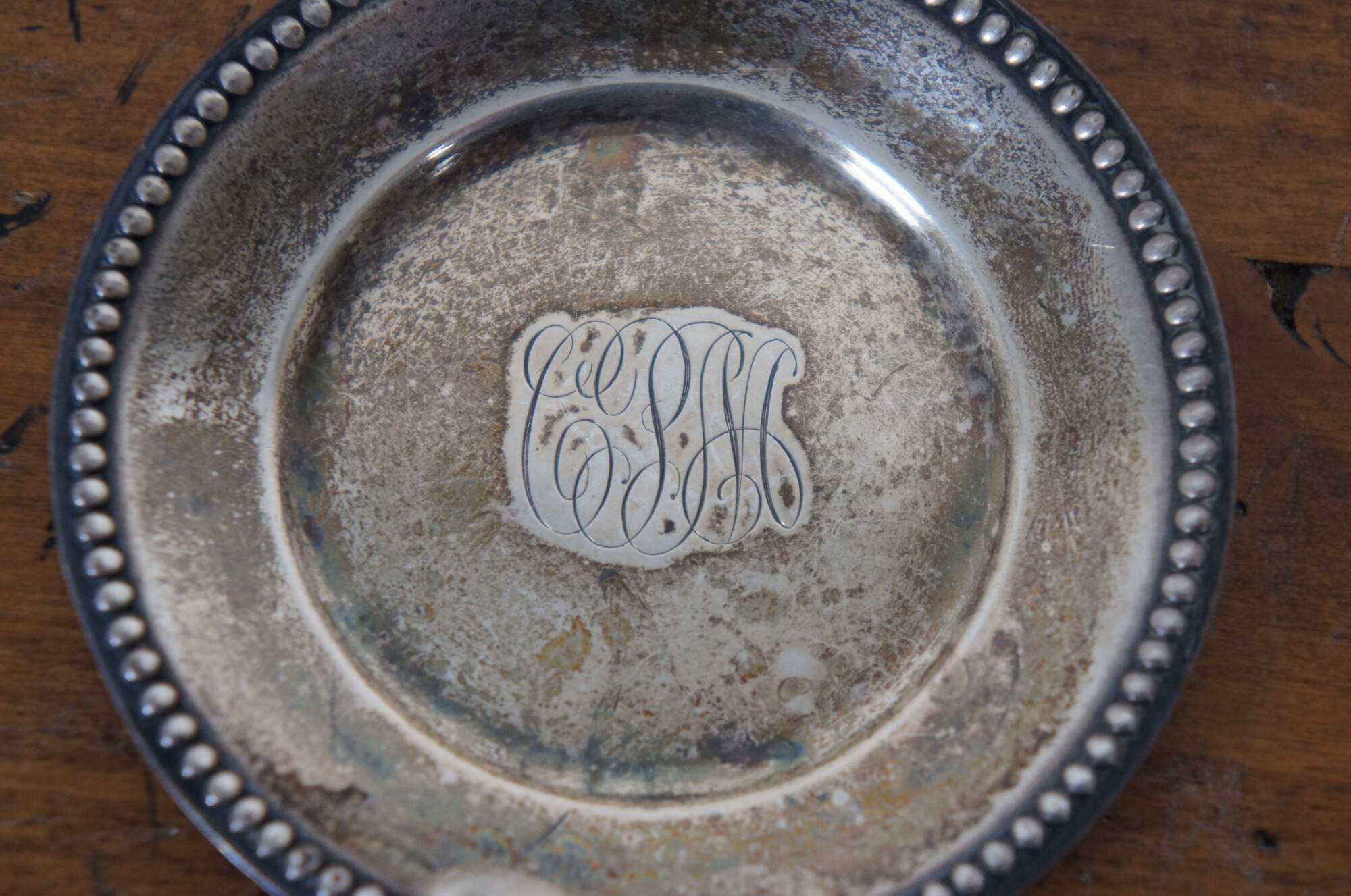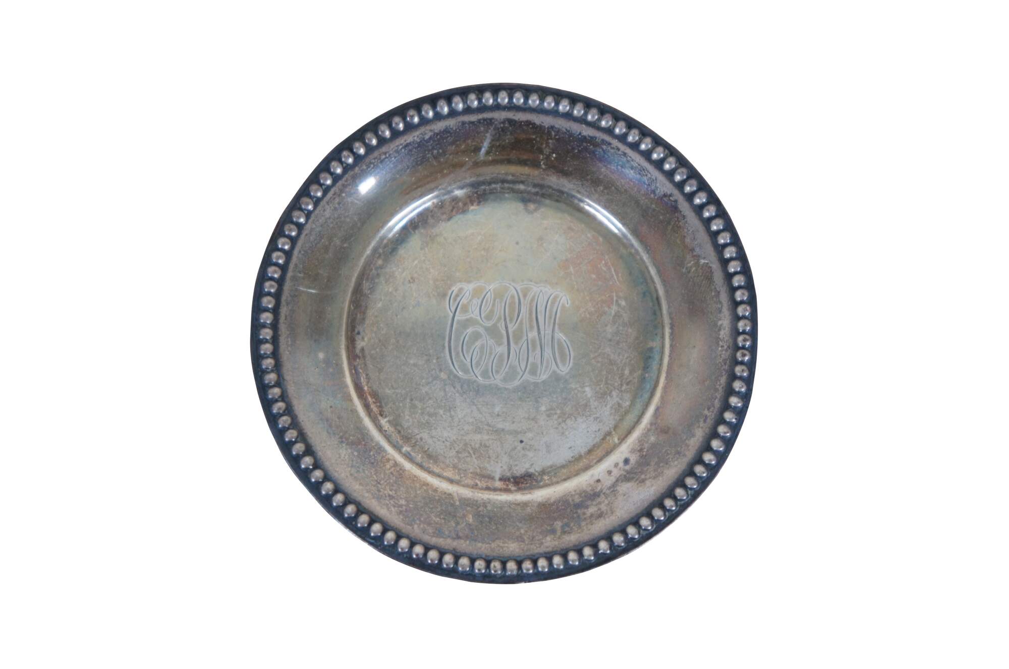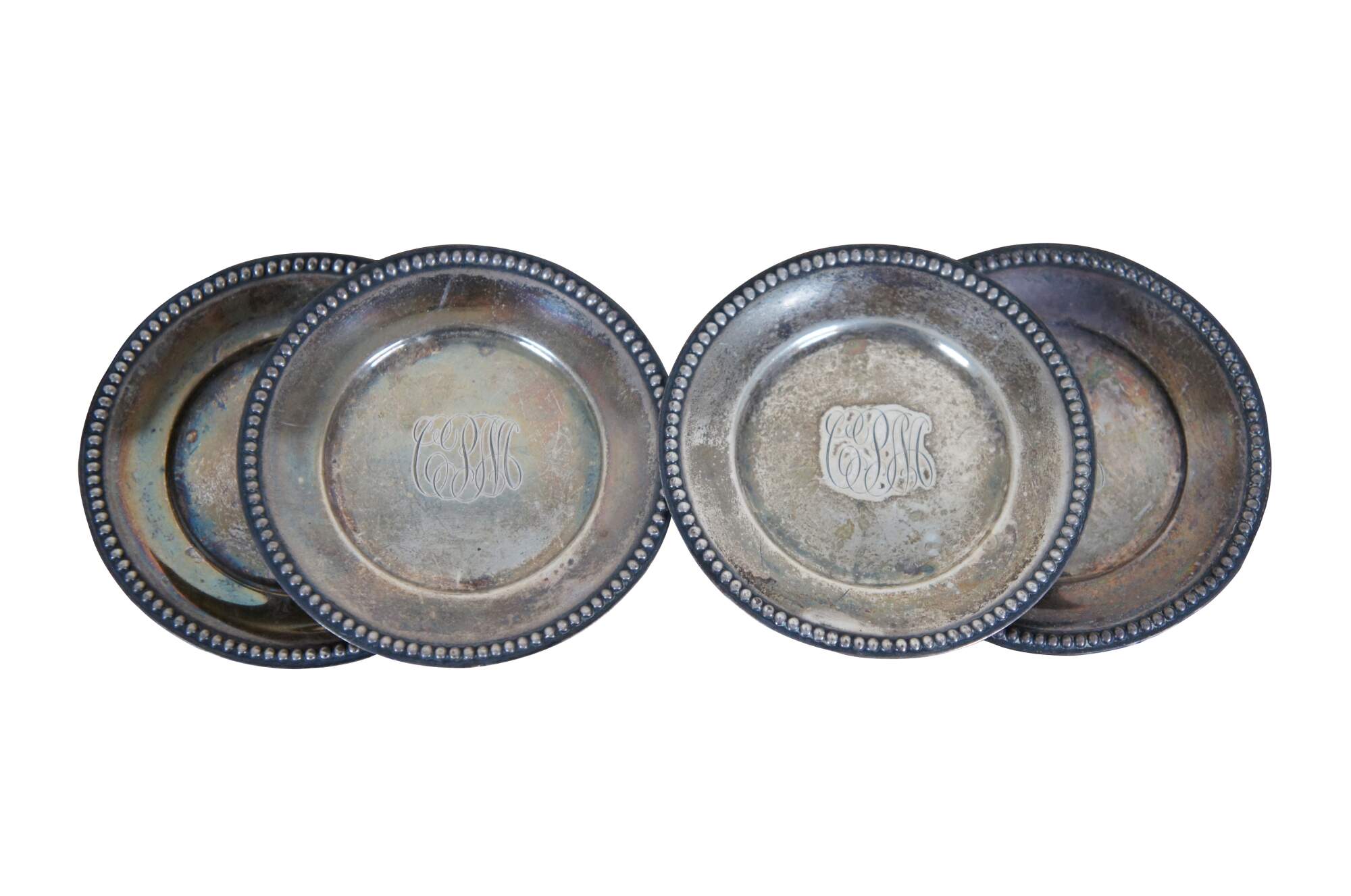 Set of four antique Whiting Manifacturing Co sterling silver bone / nut dishes with beaded edge, item number 5240. Monogrammed with the initials CPM.