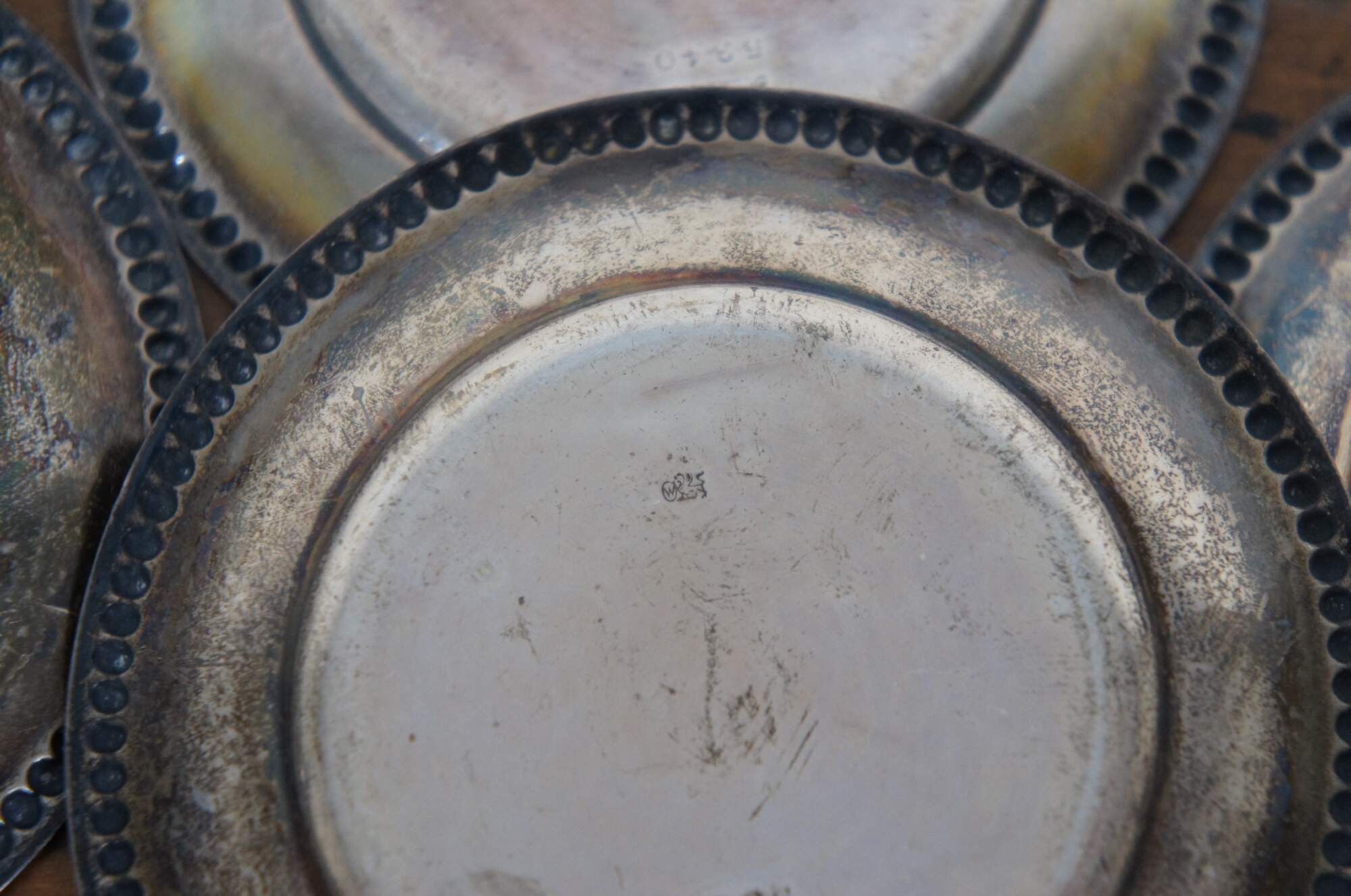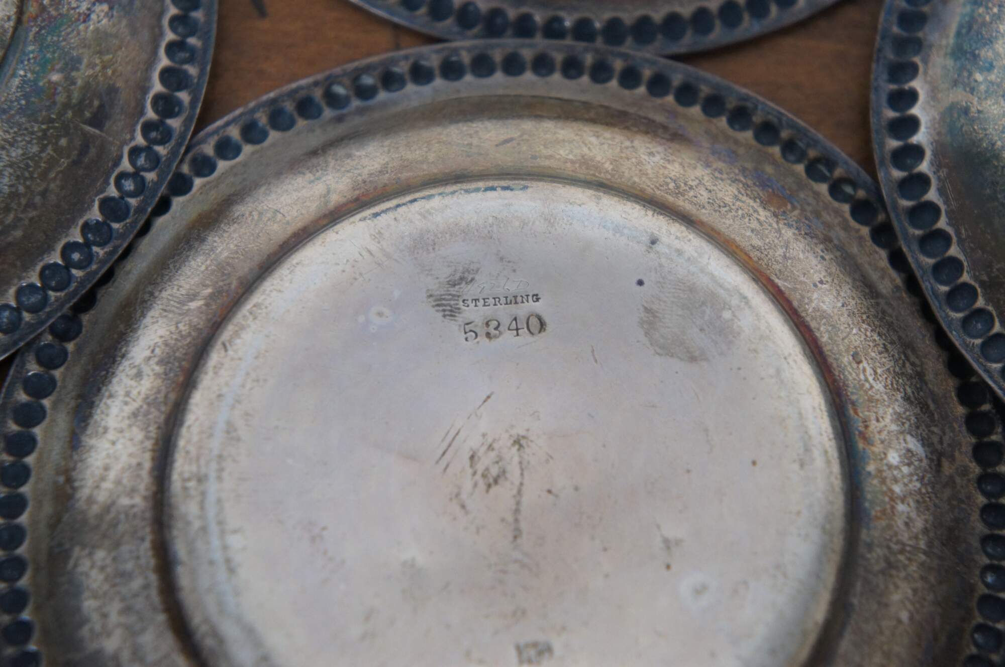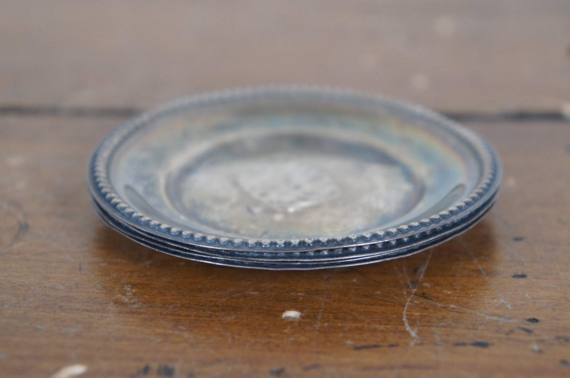 Set of four antique Whiting Manifacturing Co sterling silver bone / nut dishes with beaded edge, item number 5240. Monogrammed with the initials CPM.