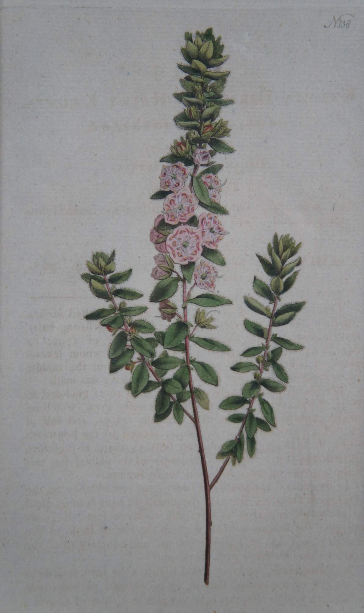 Pair of late 18th and early 19th century botanical engravings by Sydenham Teast Edwards. Plate No 138, Kalmia Hirsuta - Engraved by T. Edwards, extracted from "The Botanical Magazine; or Flower-Garden Displayed" Volume IV - published Nov. 1, 1790 by William Curtis, St Georges Crescent. N. 1673 red flower - Engraved by T. Edwards and F. Sansom, published by Samuel Curtis, Walworth, in the Sep. 1, 1814. Carved giltwood frame; no mat.