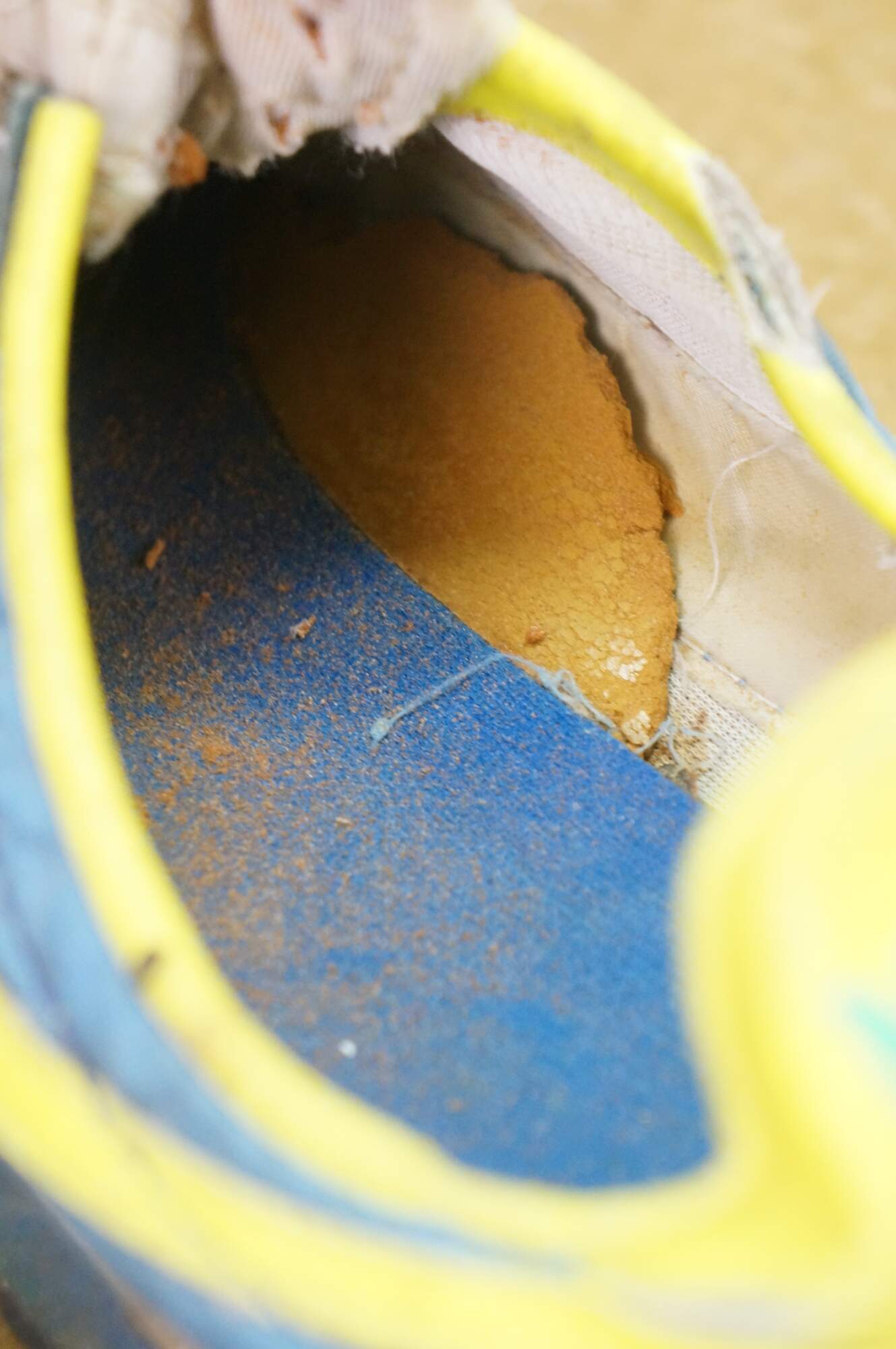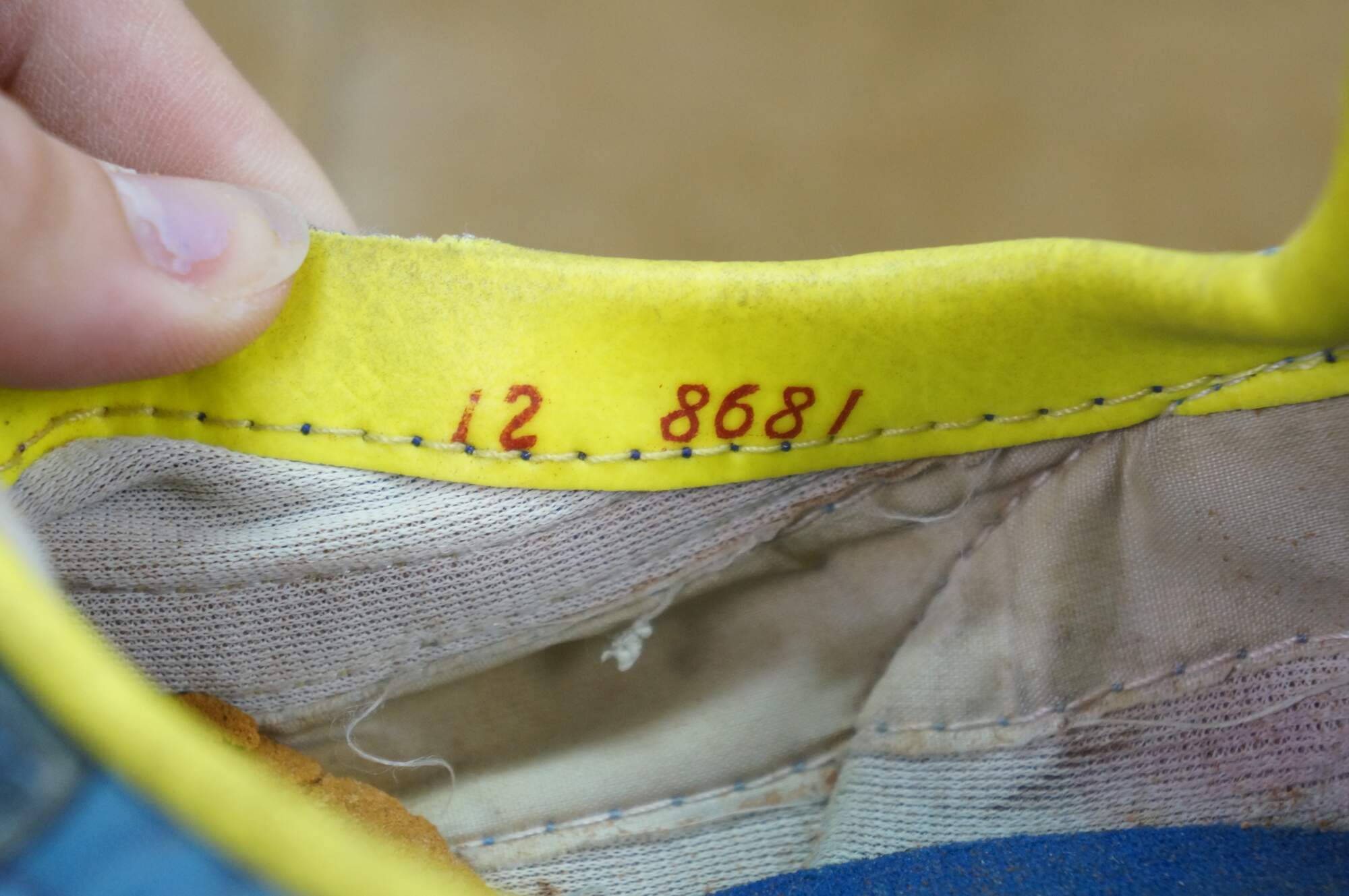 This shoes was made in the desirable blue and neon yellow color combo, size 12. Numbered 8681.