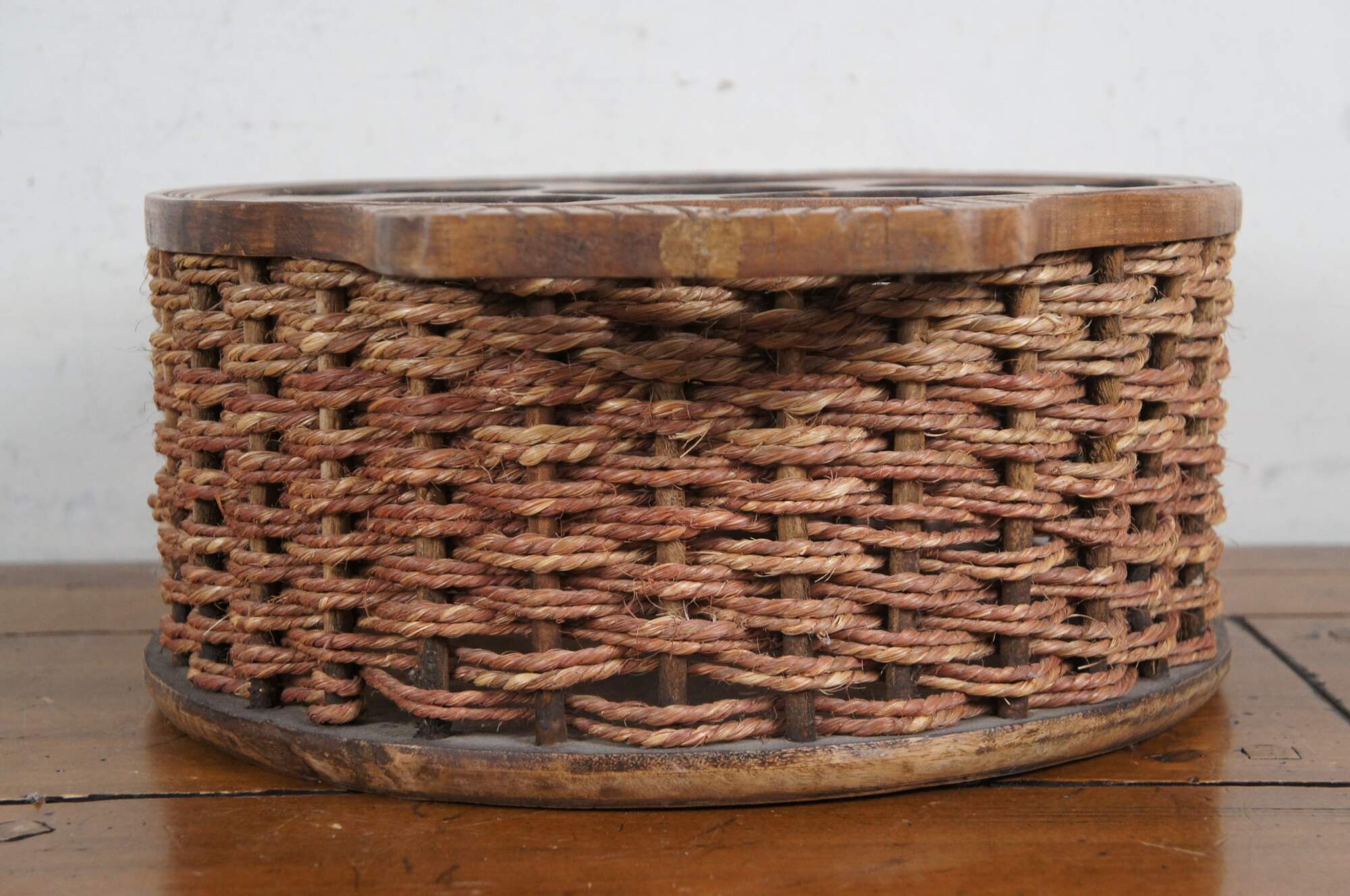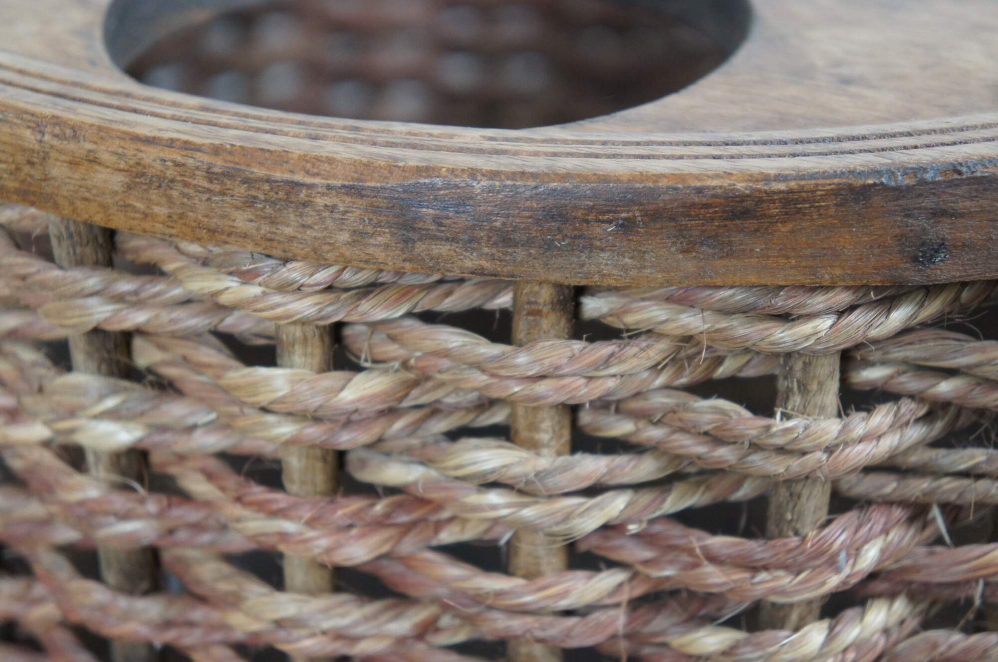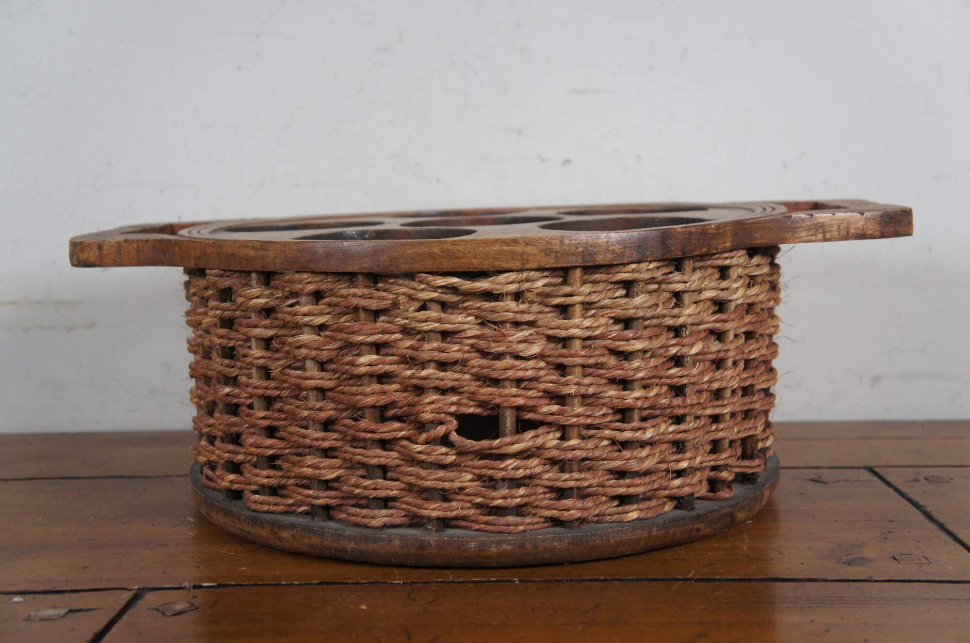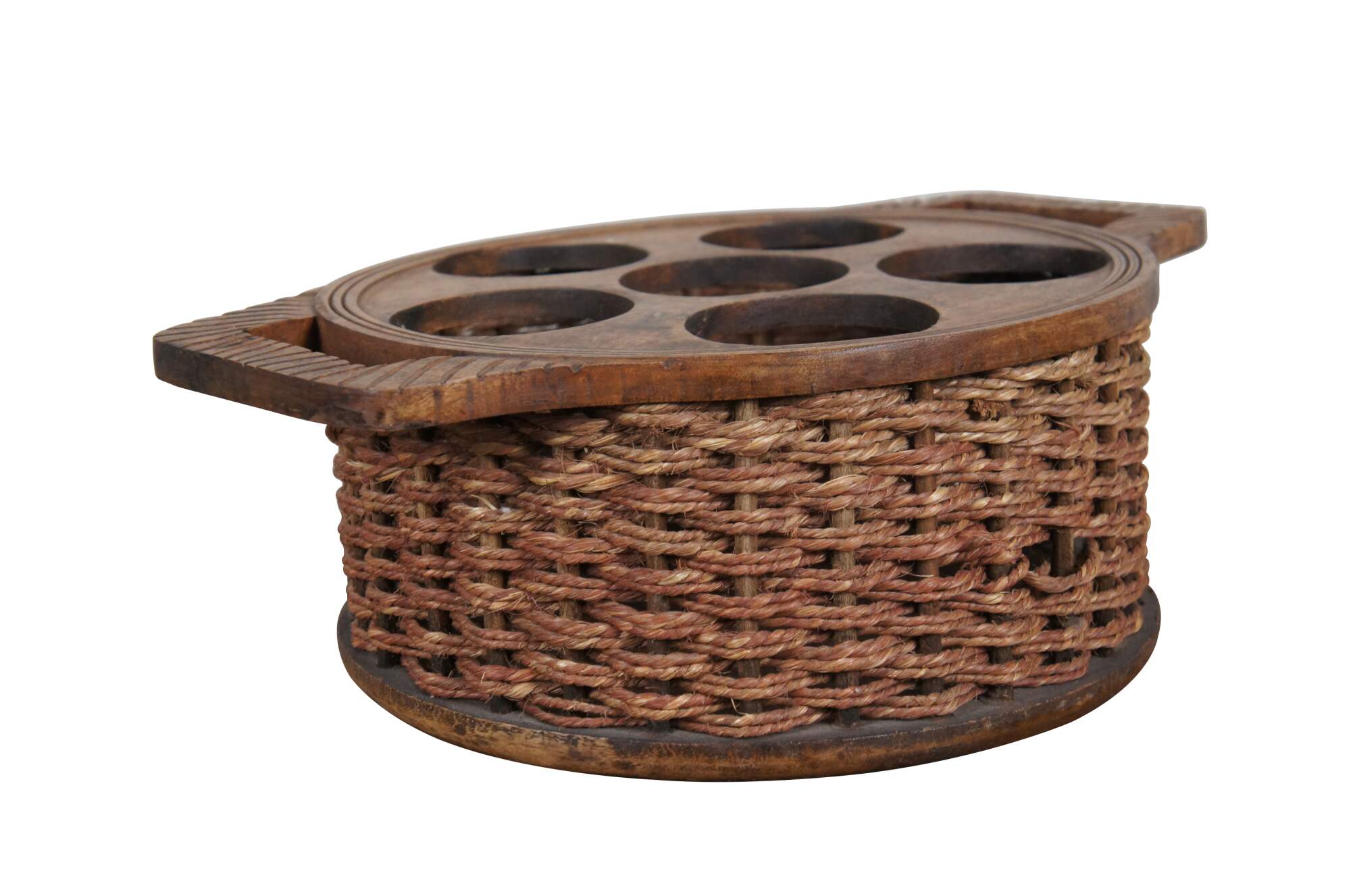 Late 20th century country farmhouse wine serving / carrying / storage basket. Round wood base and top with carved handles and openings for 6 wine bottles; sides woven with rope. Made in India.