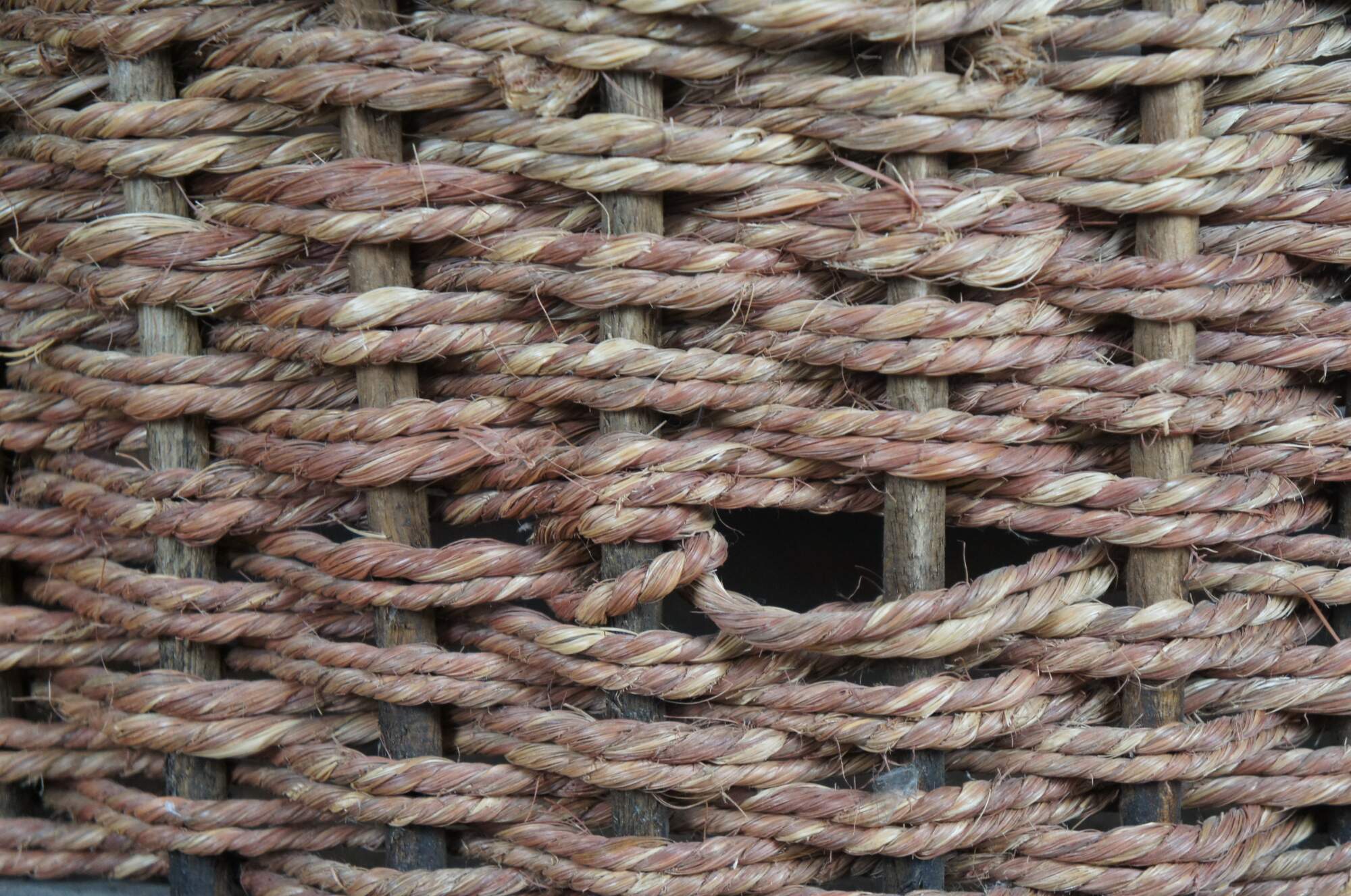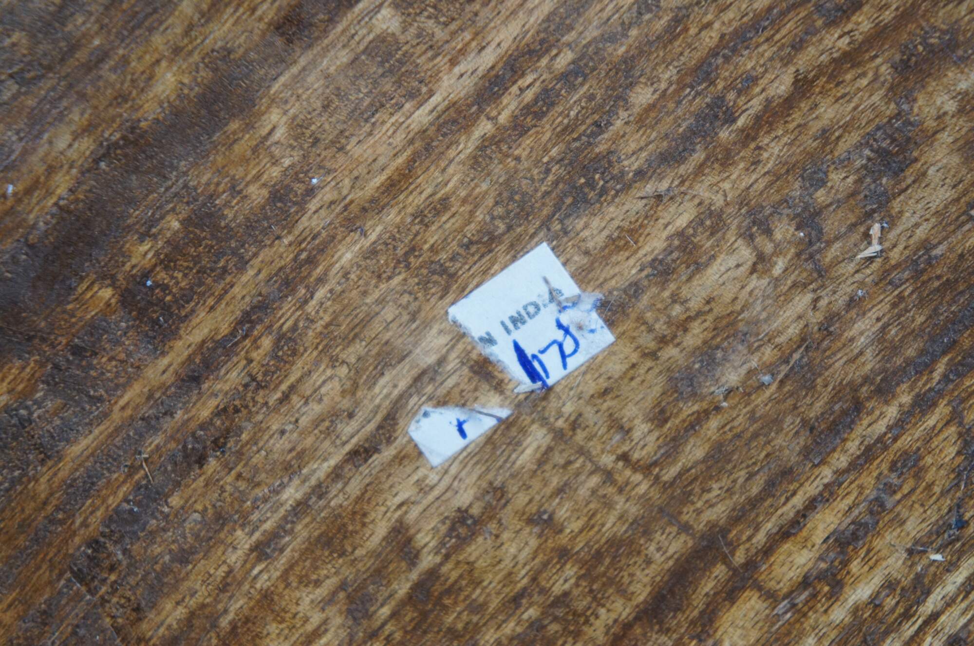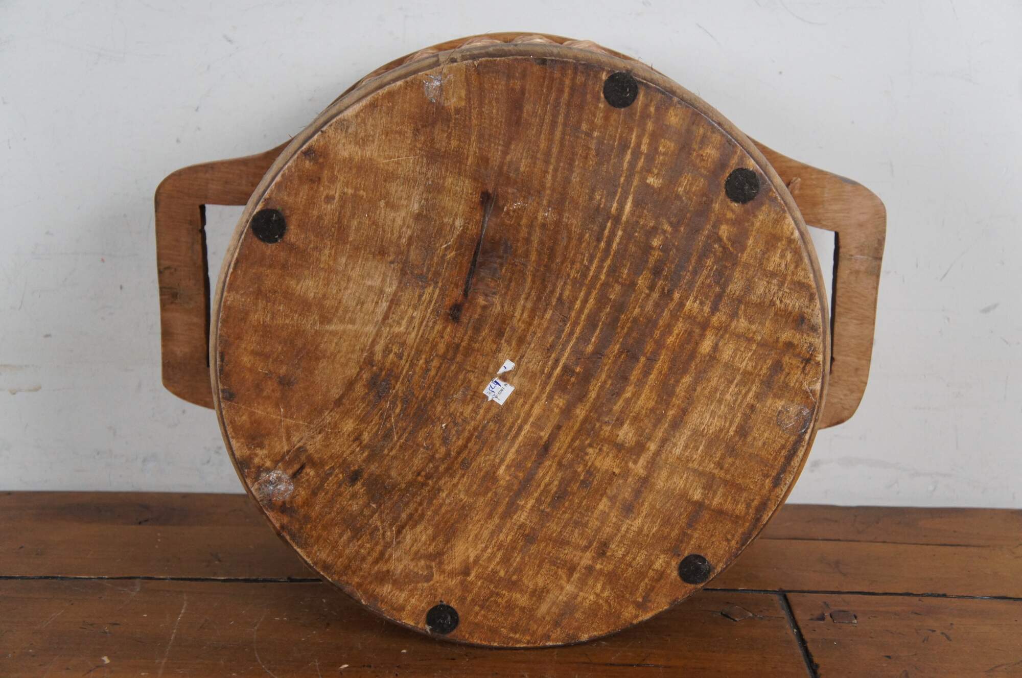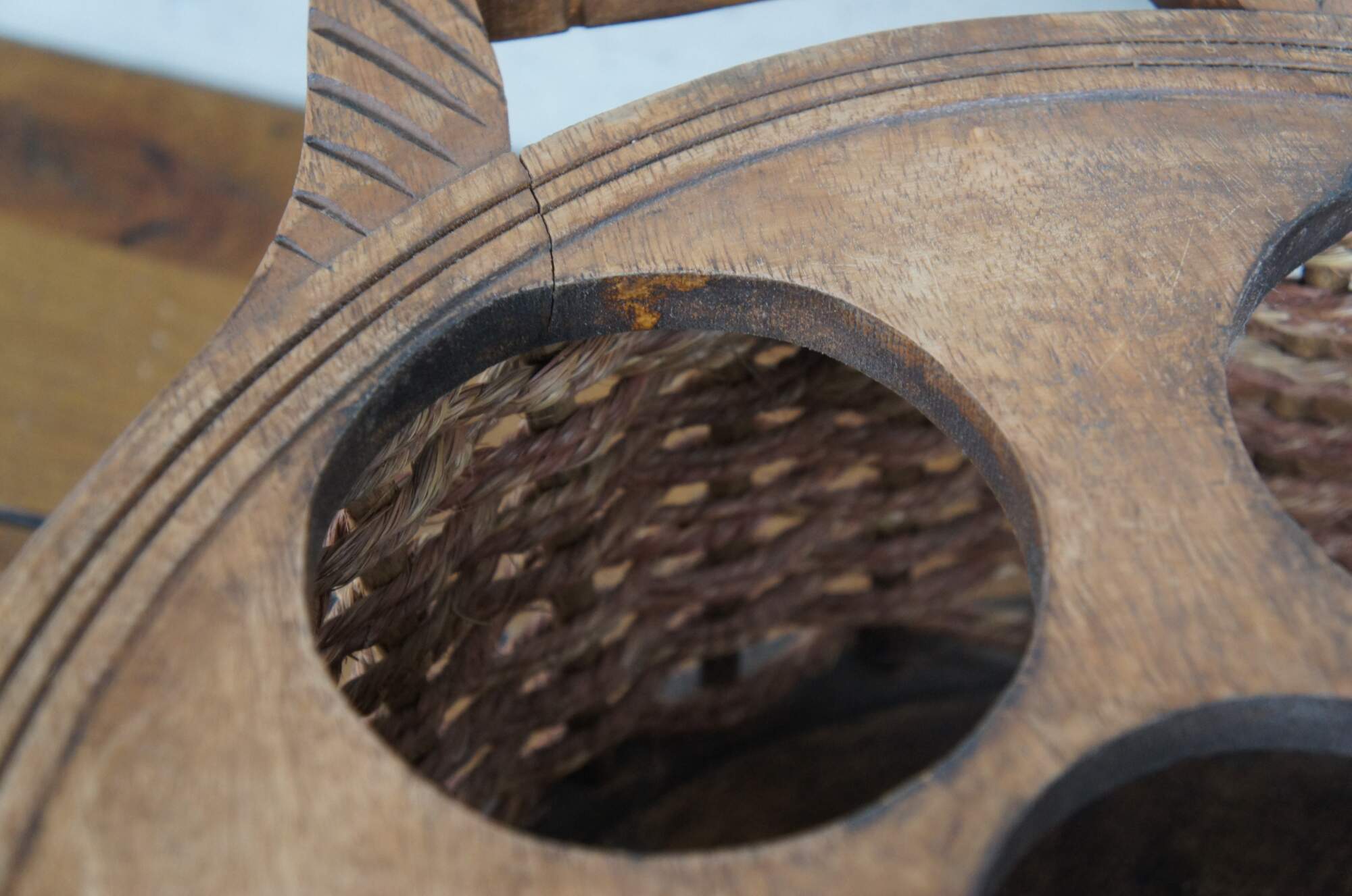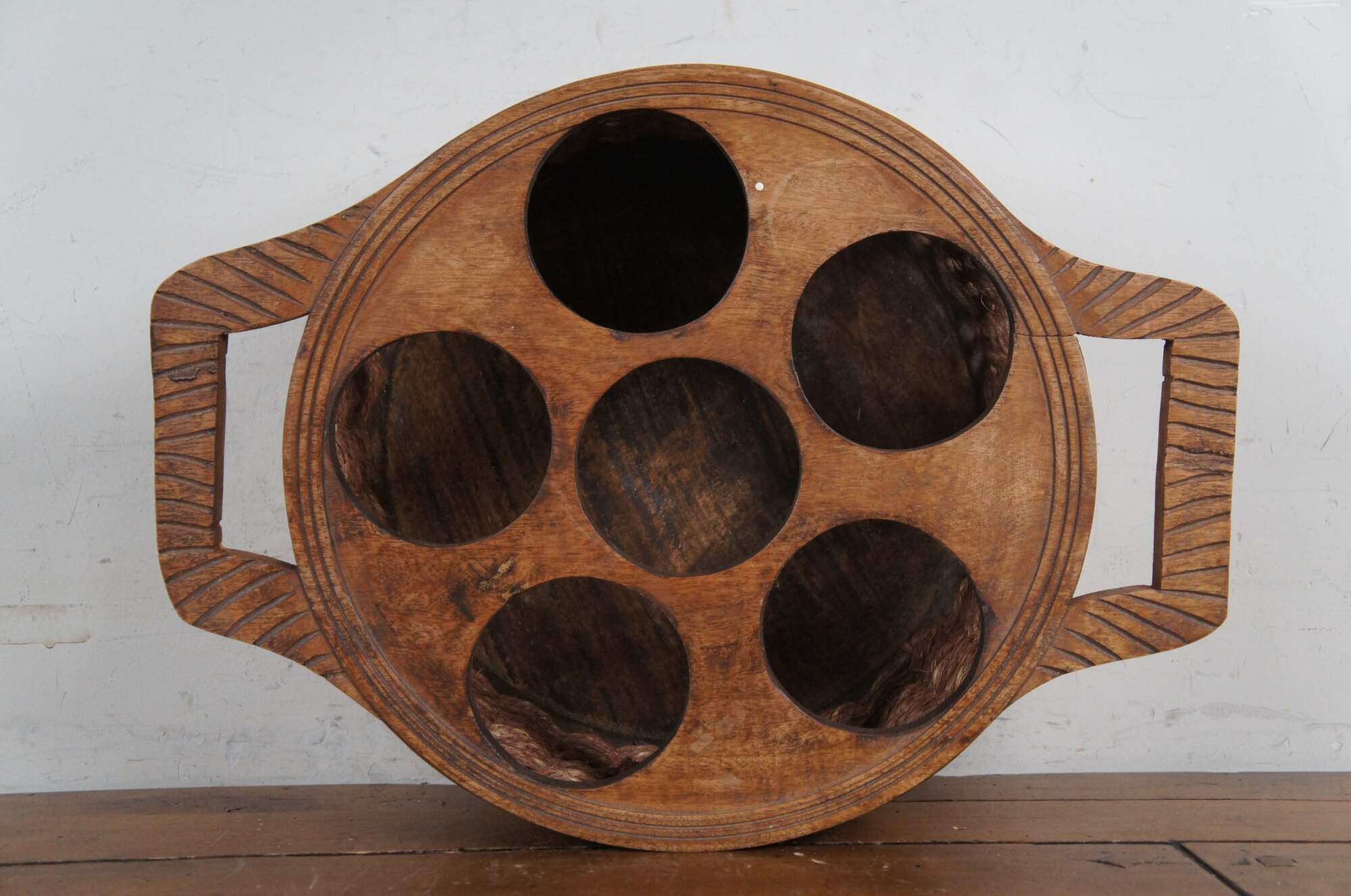 Late 20th century country farmhouse wine serving / carrying / storage basket. Round wood base and top with carved handles and openings for 6 wine bottles; sides woven with rope. Made in India.