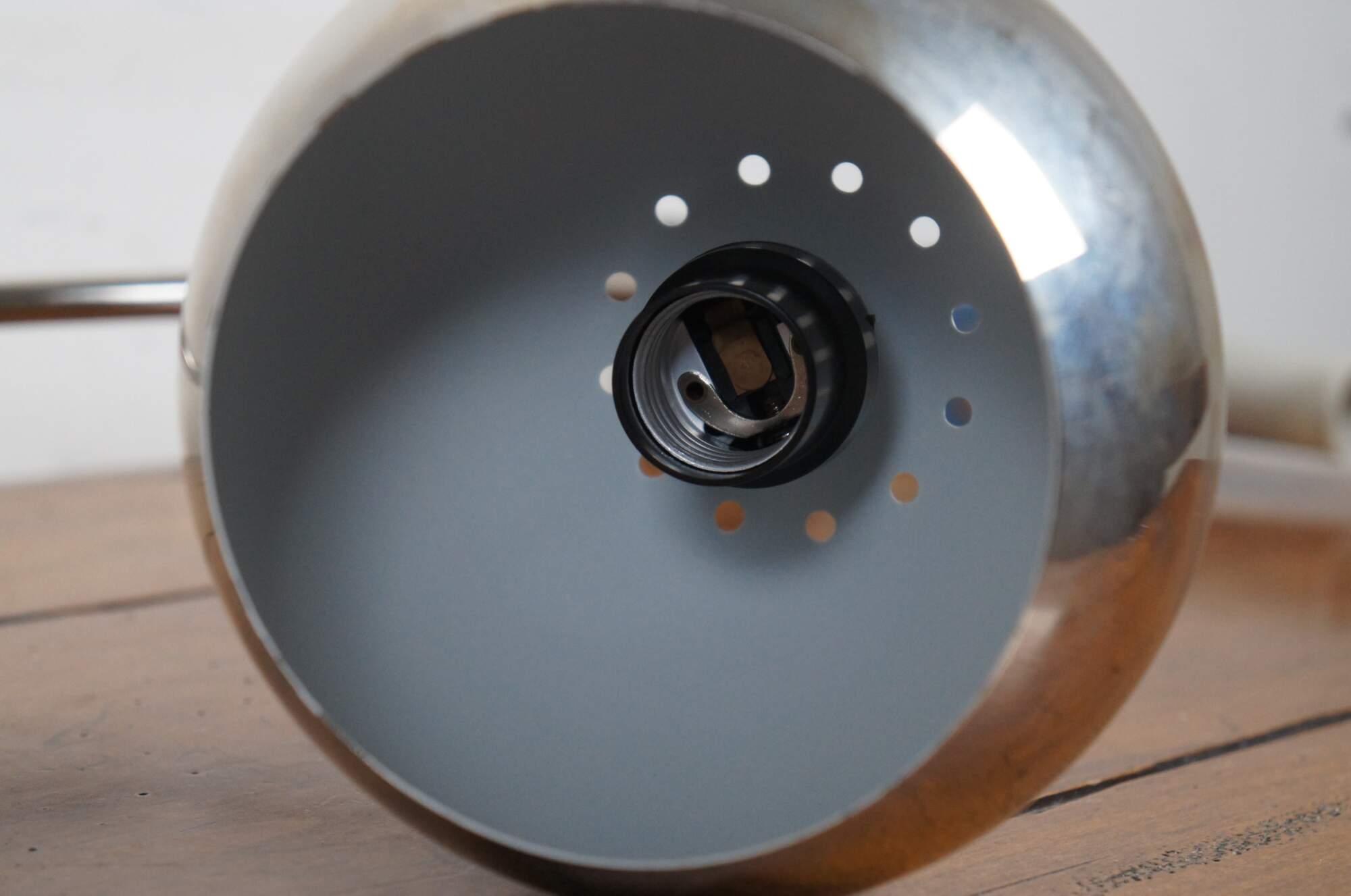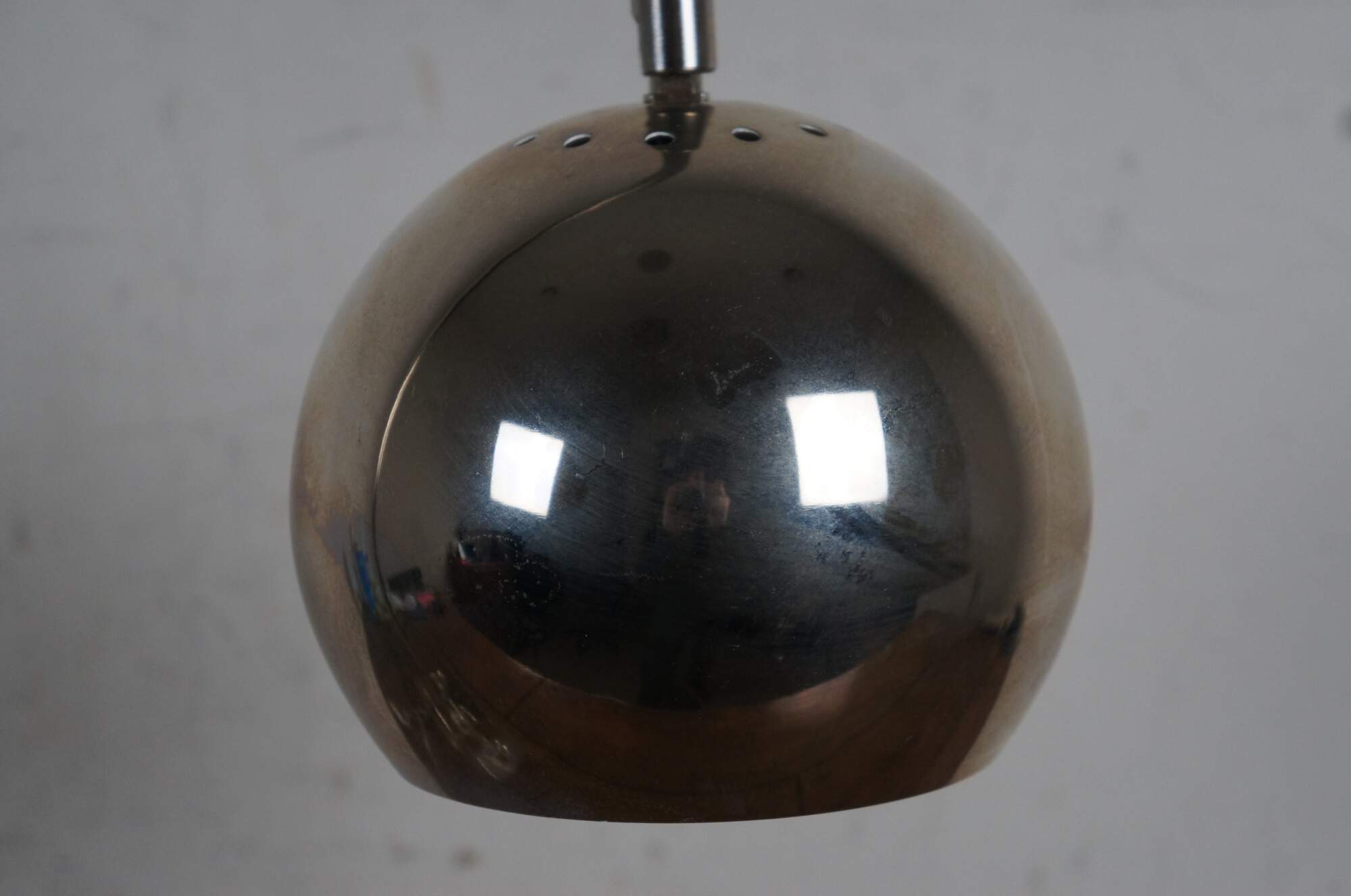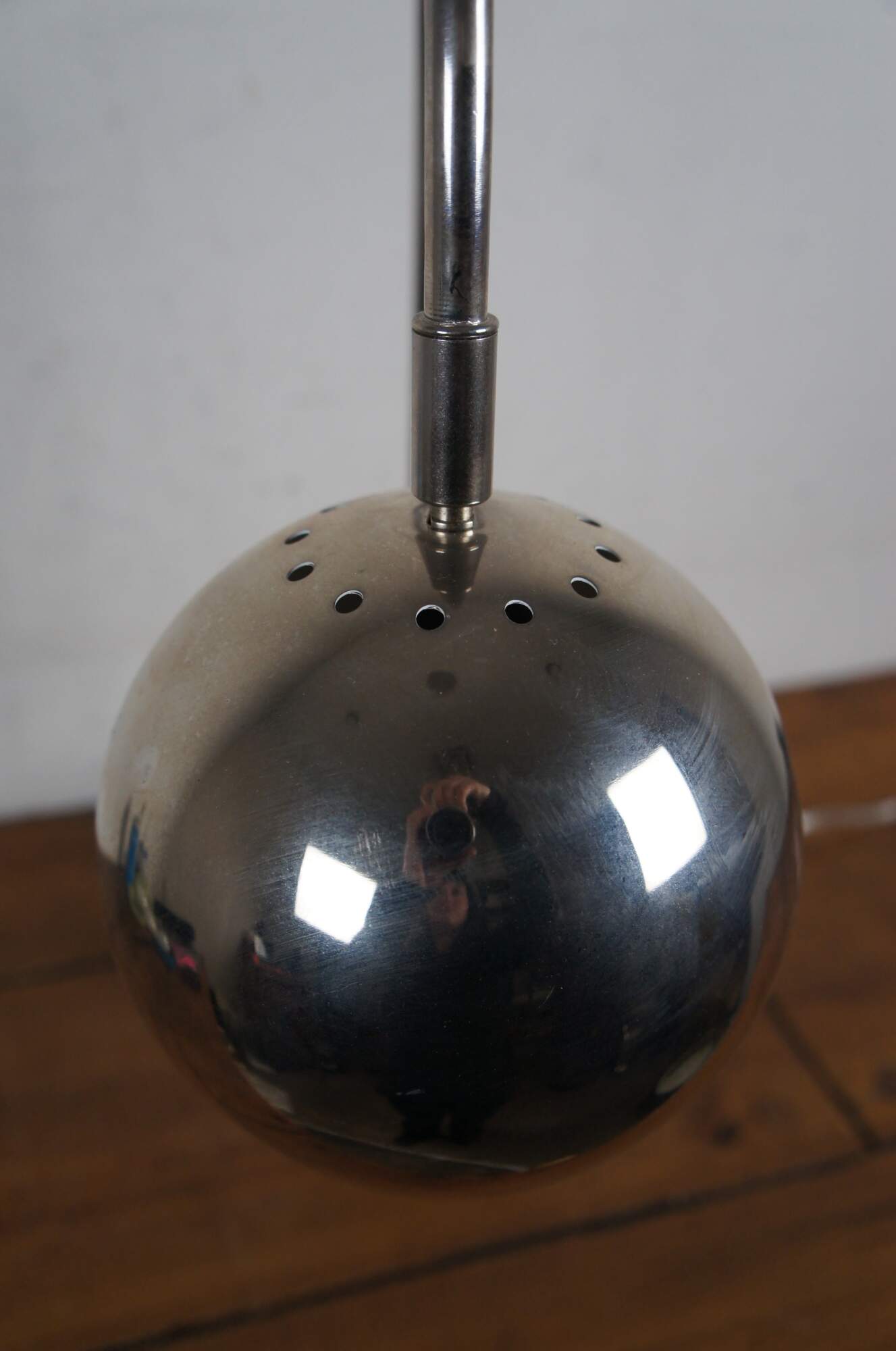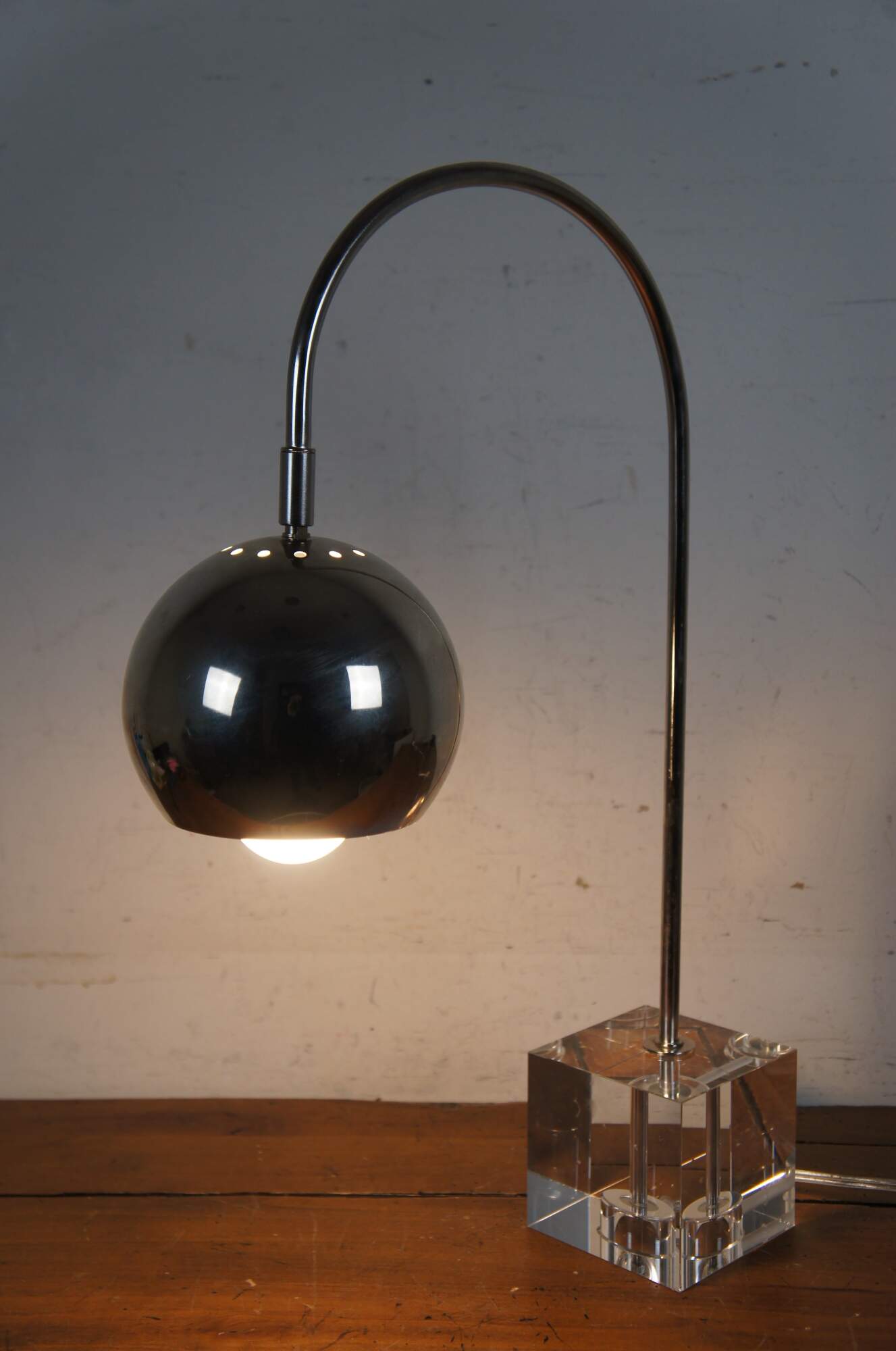 Late 20th century mid century modern style / atomic / modernist desk / table lamp featuring a cubic lucite base supporting a chrome stem arching to an orb / eyeball shaped shade.