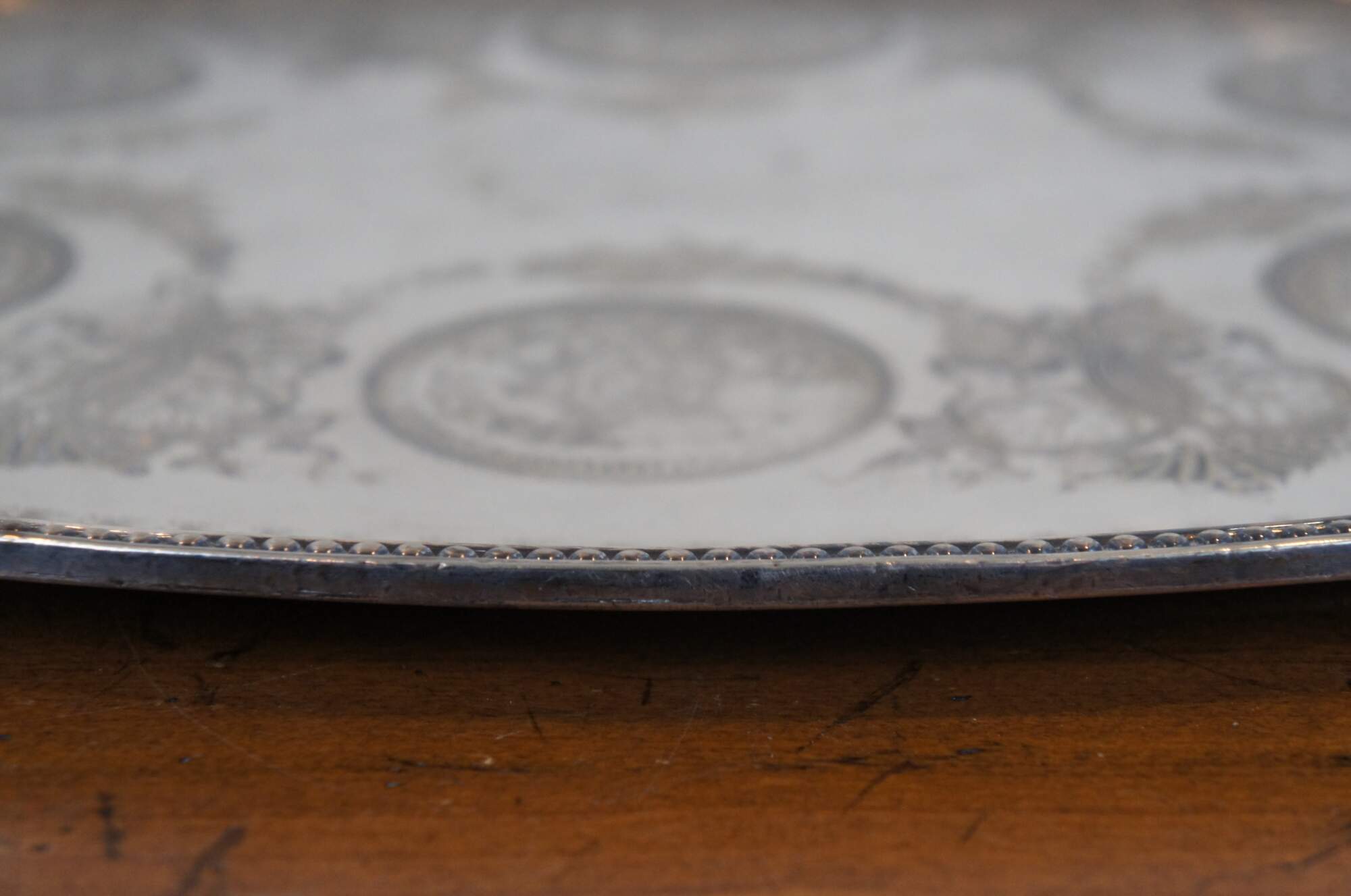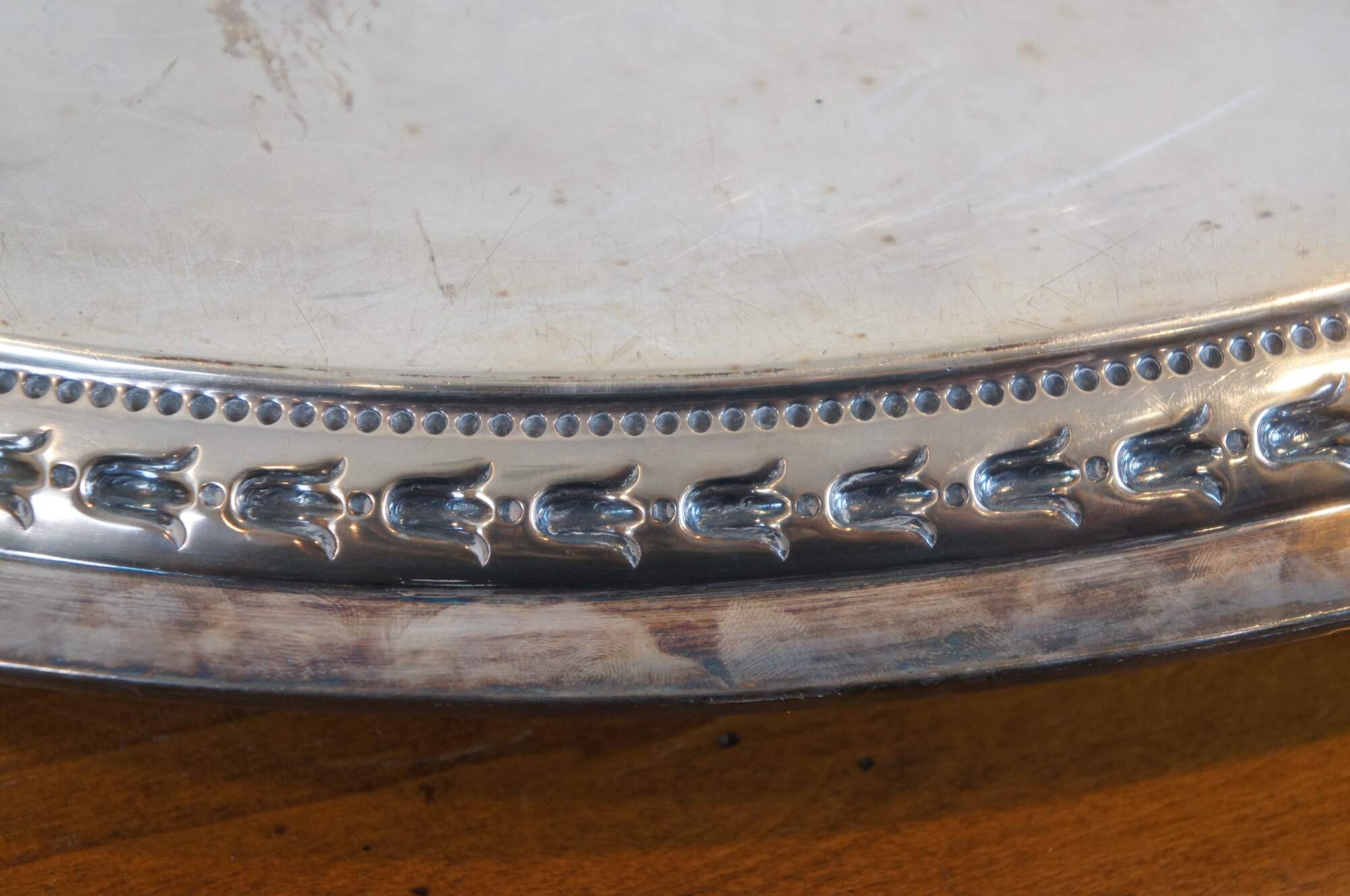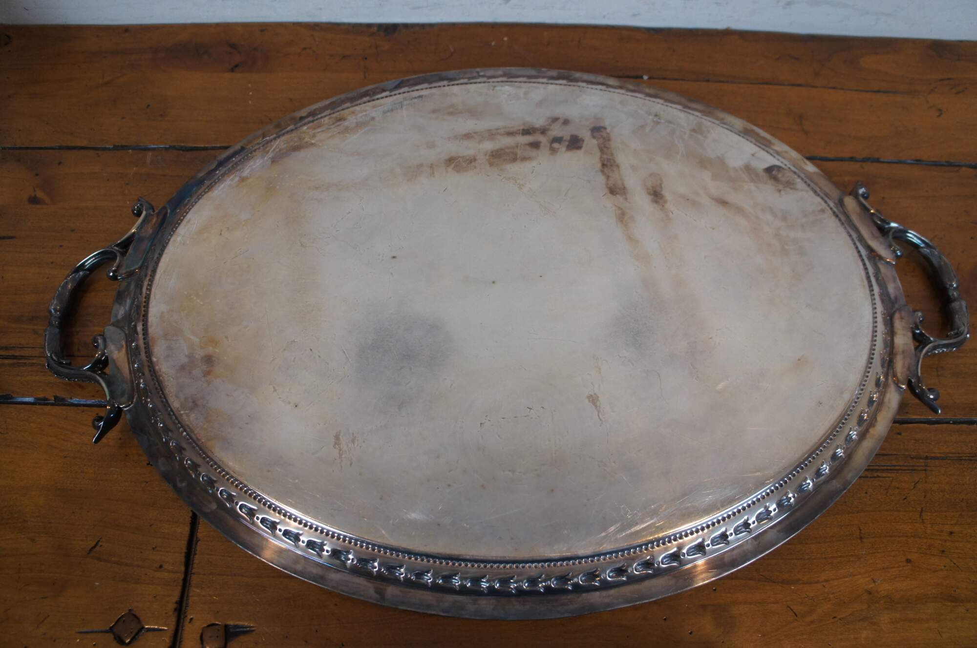 Early 20th century English Roberts & Belk silverplate butler's serving tray, item number 826.. Oval form with floral and beaded edge, scrolling foliate handles, and surface embellished with foliate swags between medallions stamped with roses.