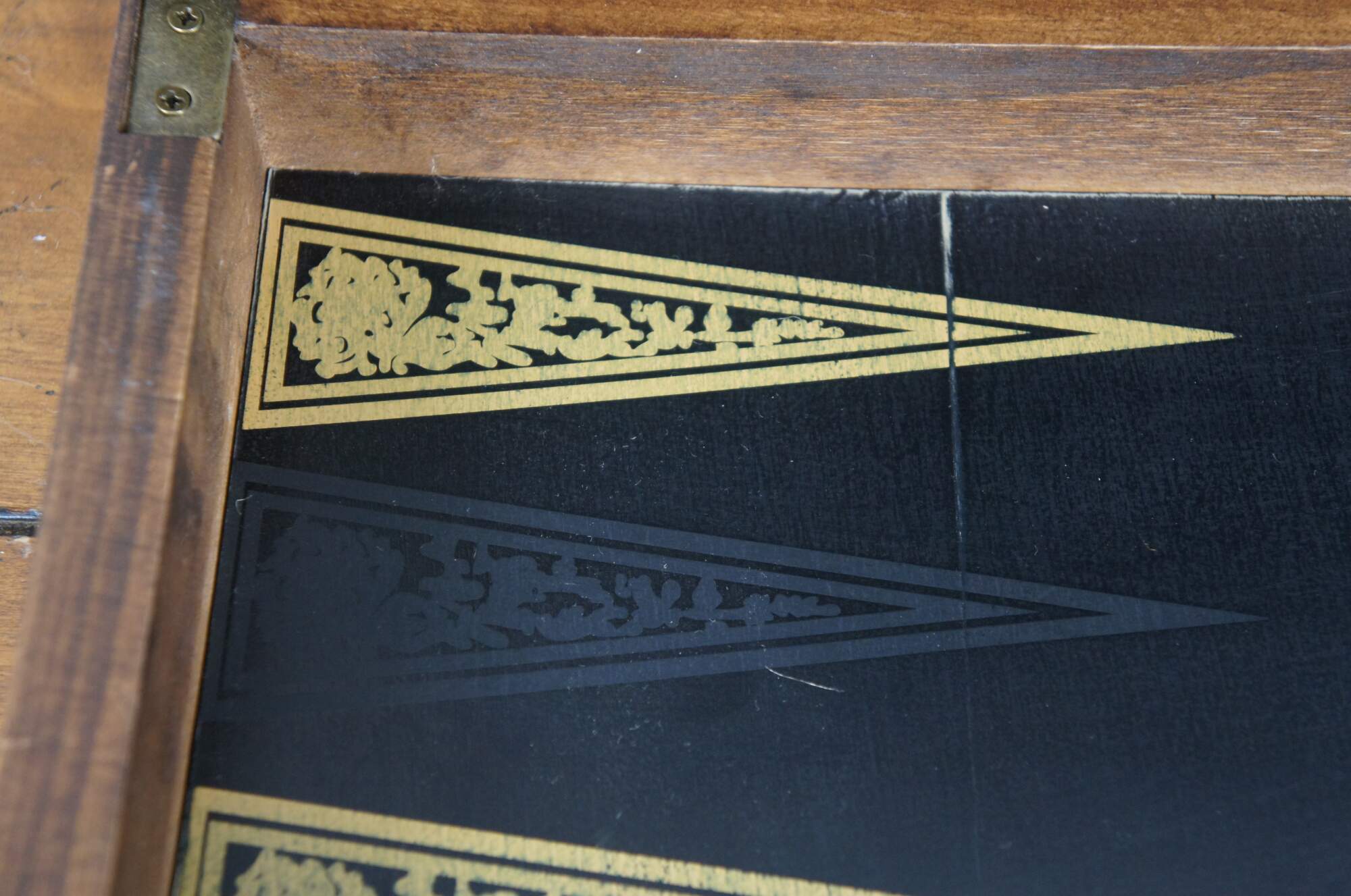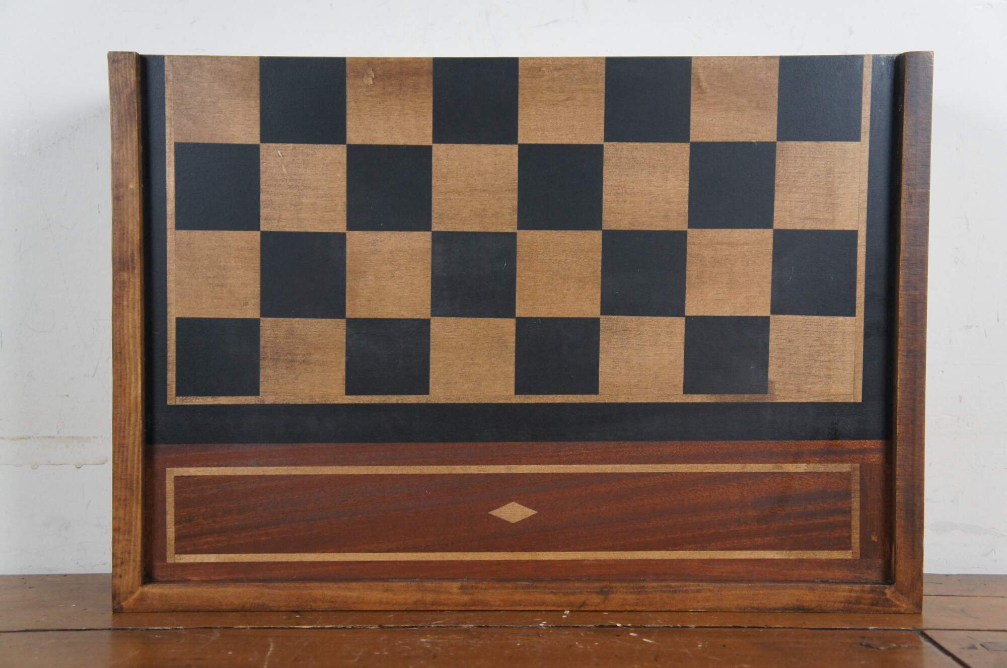 Late 20th century chess / backgammon game set by Restoration Hardware. Reversible, folding, hardwood gameboard case. Wooden game pieces and dice. Leather backgammon cups. Labeled burlap storage bags for pieces and instructions for playing both games. Brass plaque reads "Maison, Nautre / 26. Bd. de Strasbourg, Paris." Made in China.