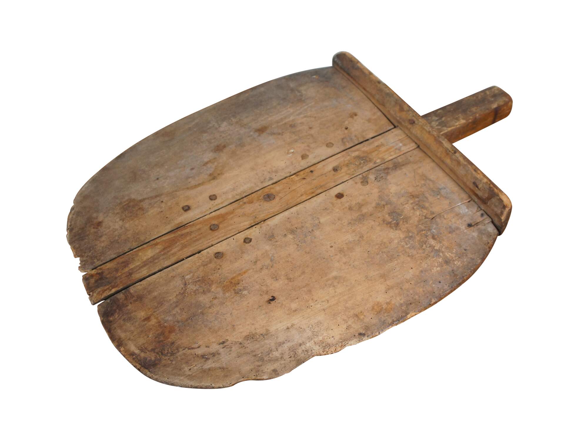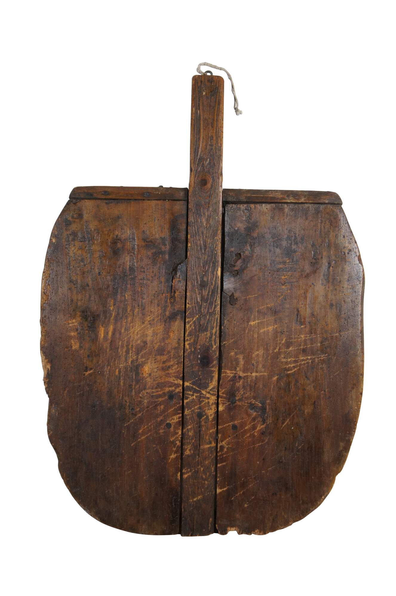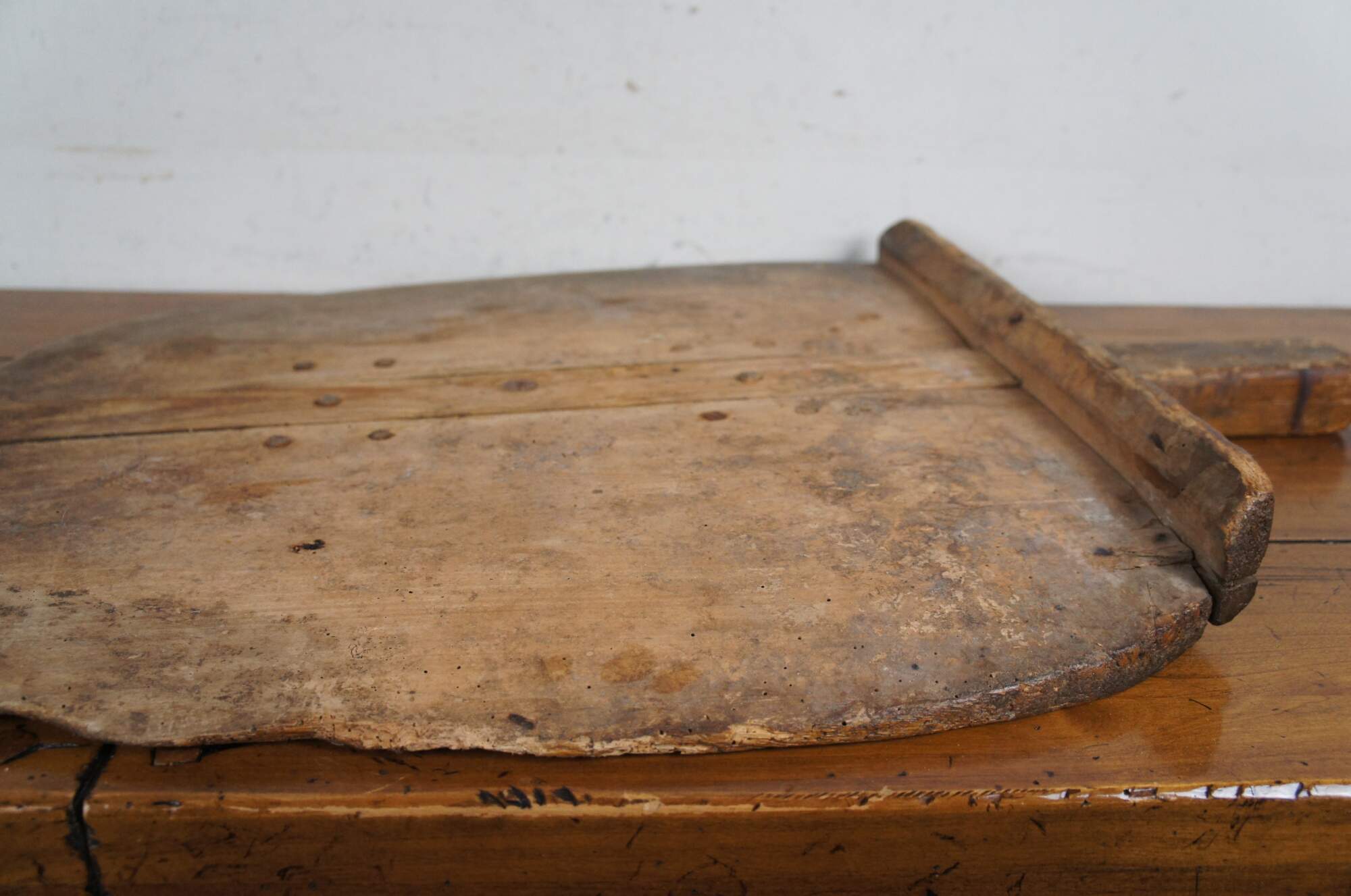 Large primitive antique bread cutting board / peel with backstop and handle, designed for removing loaves of bread from a brick oven.