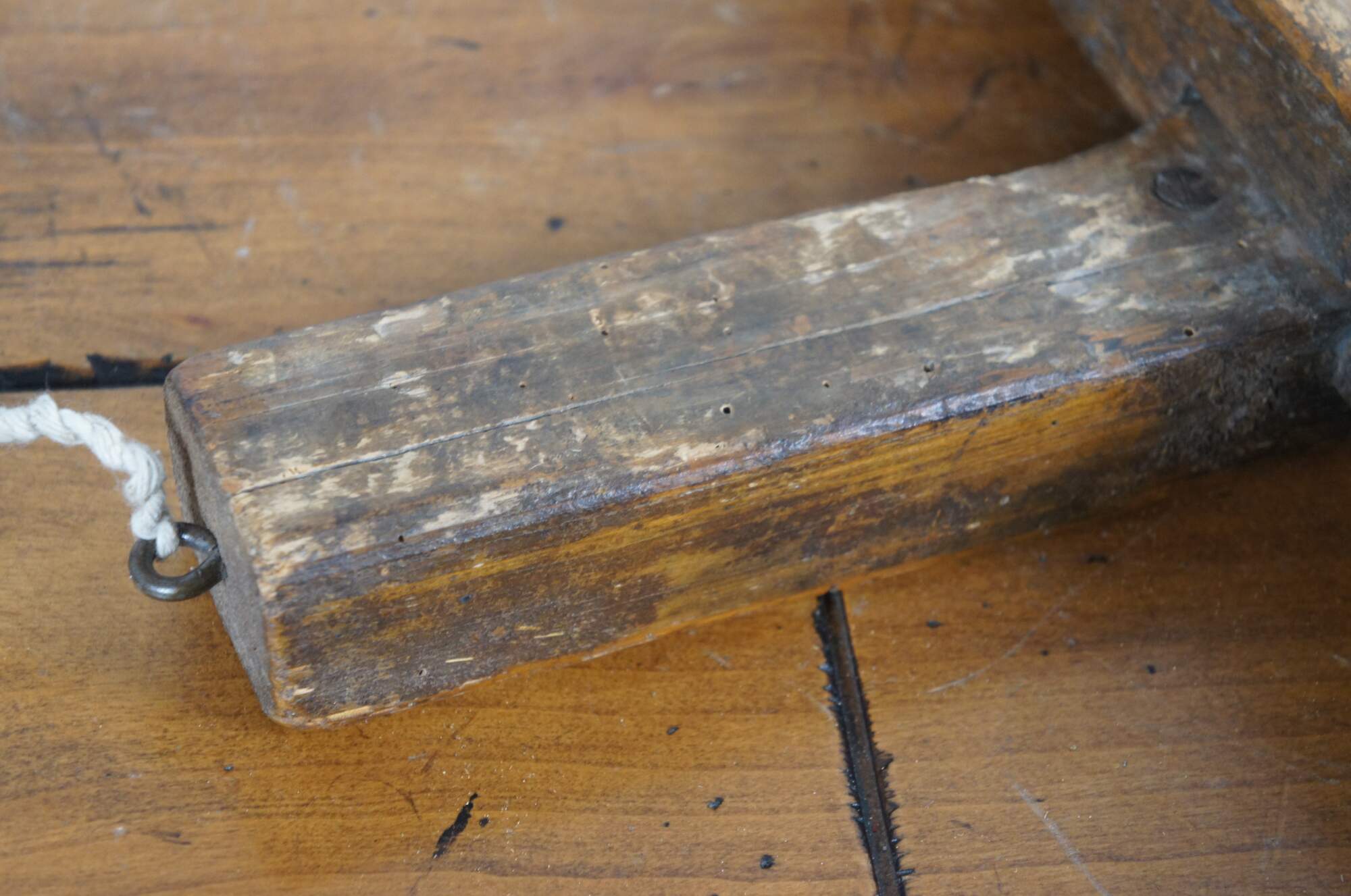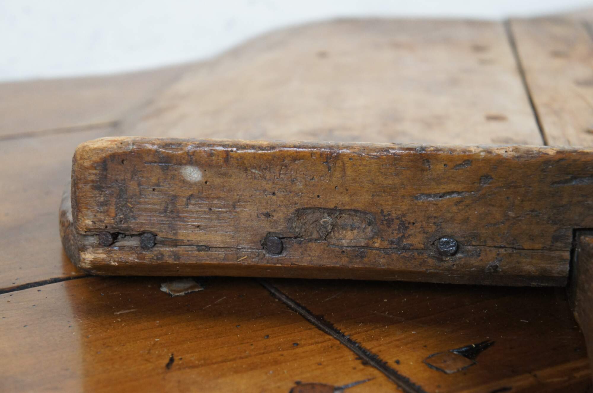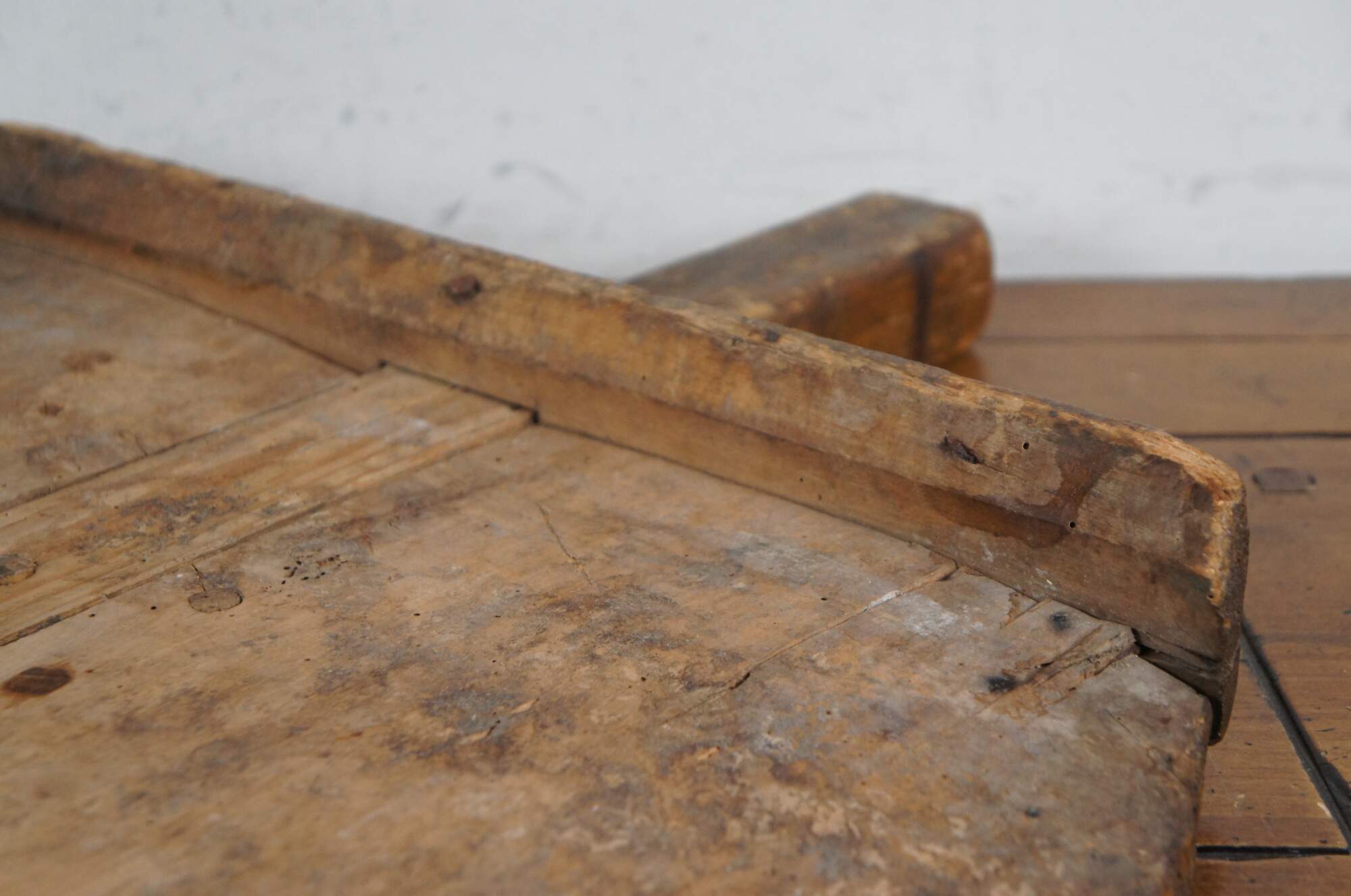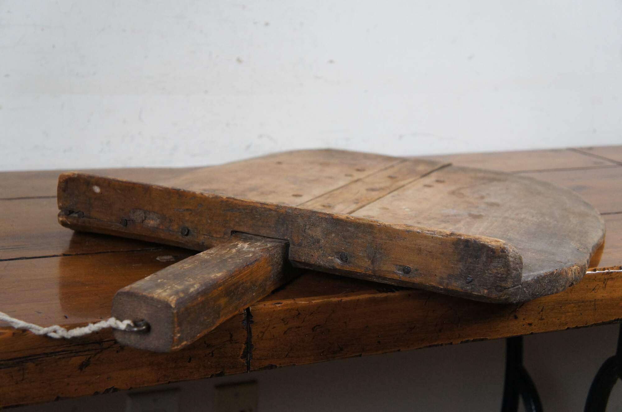 Large primitive antique bread cutting board / peel with backstop and handle, designed for removing loaves of bread from a brick oven.