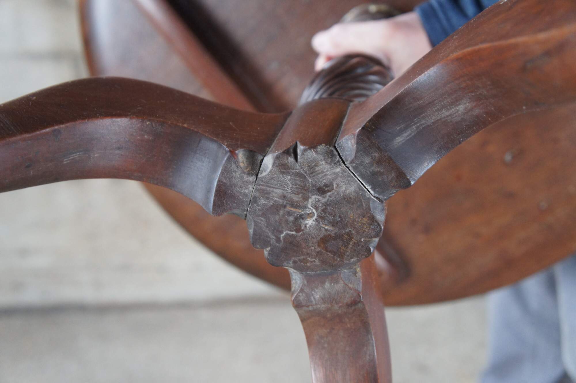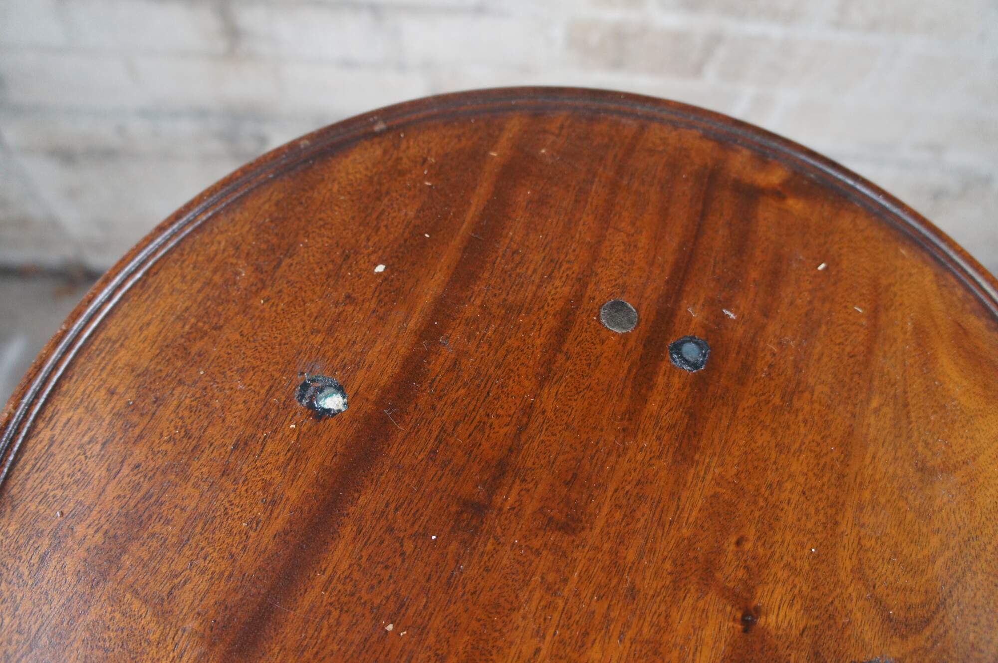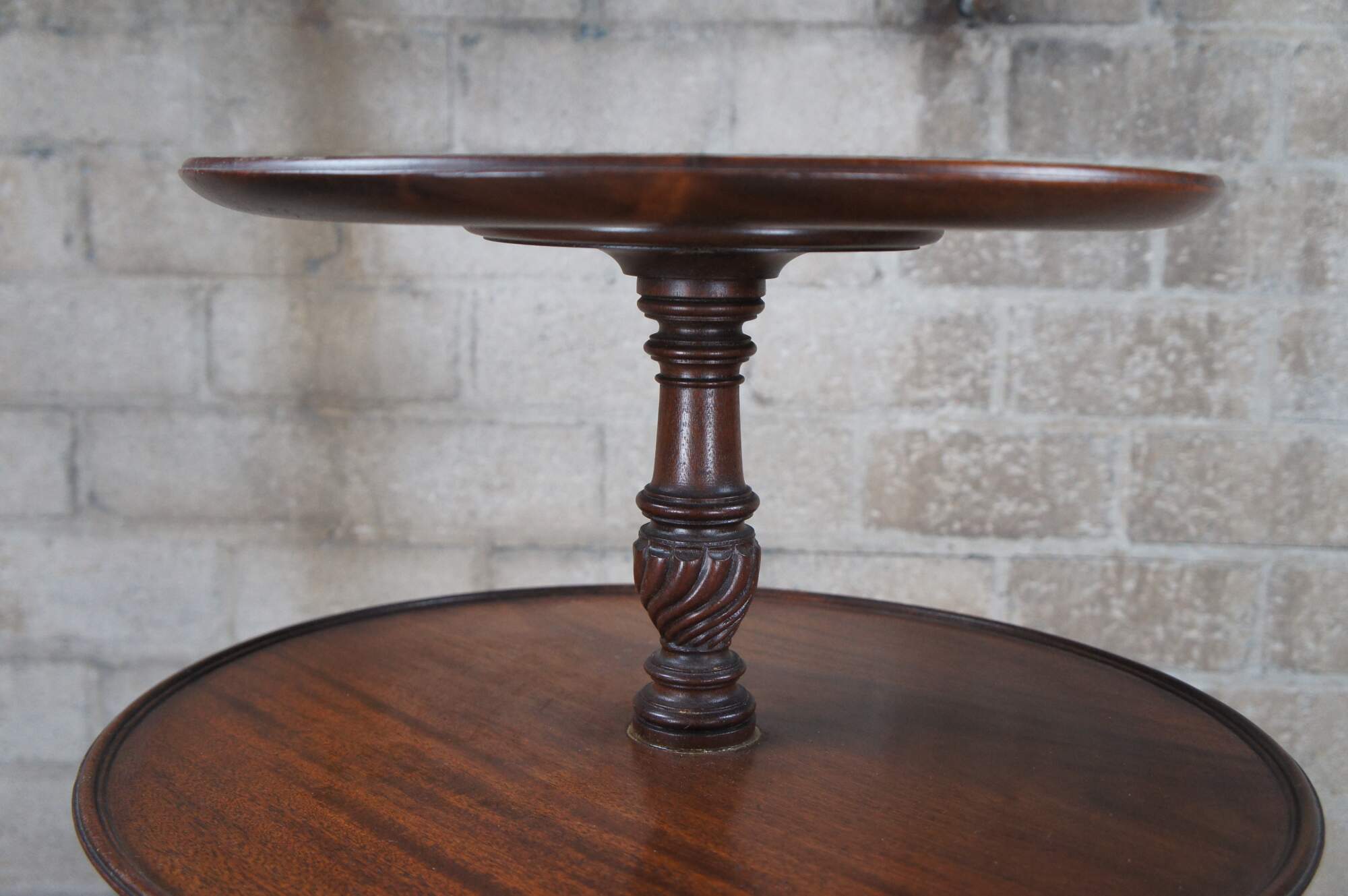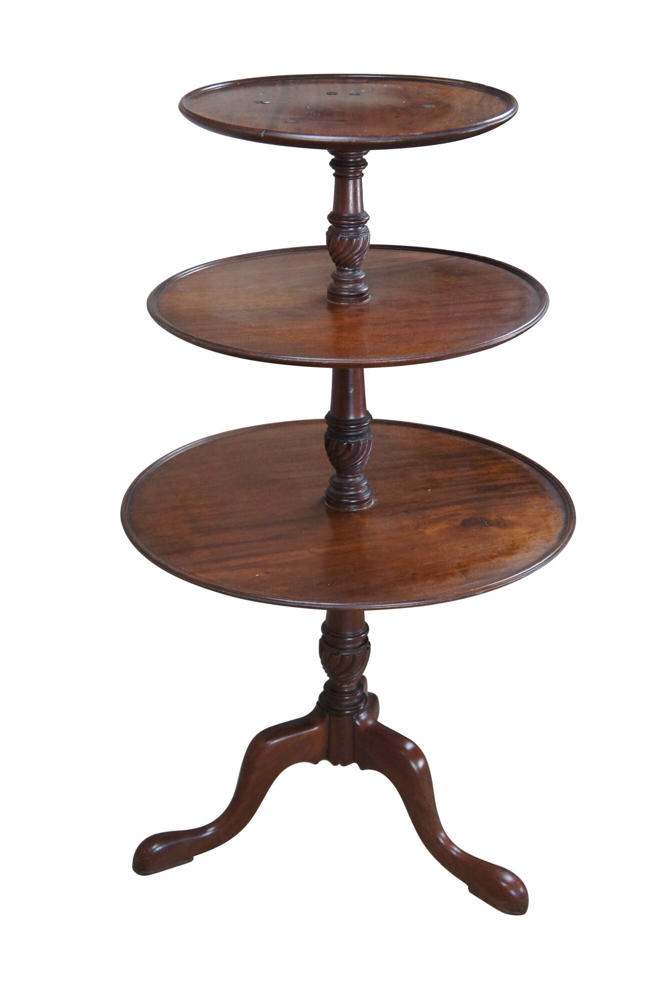 Vintage 20th Century English Georgian butler table. Made from solid mahogany with 3 tiers feautring inset tops connected by turned and carved supports. The table is supported by three downswept legs leading to pad feet.