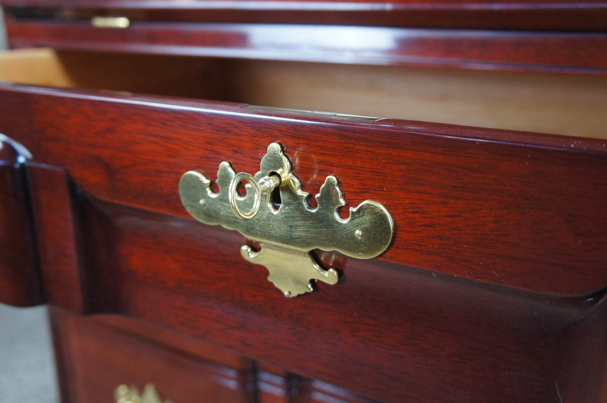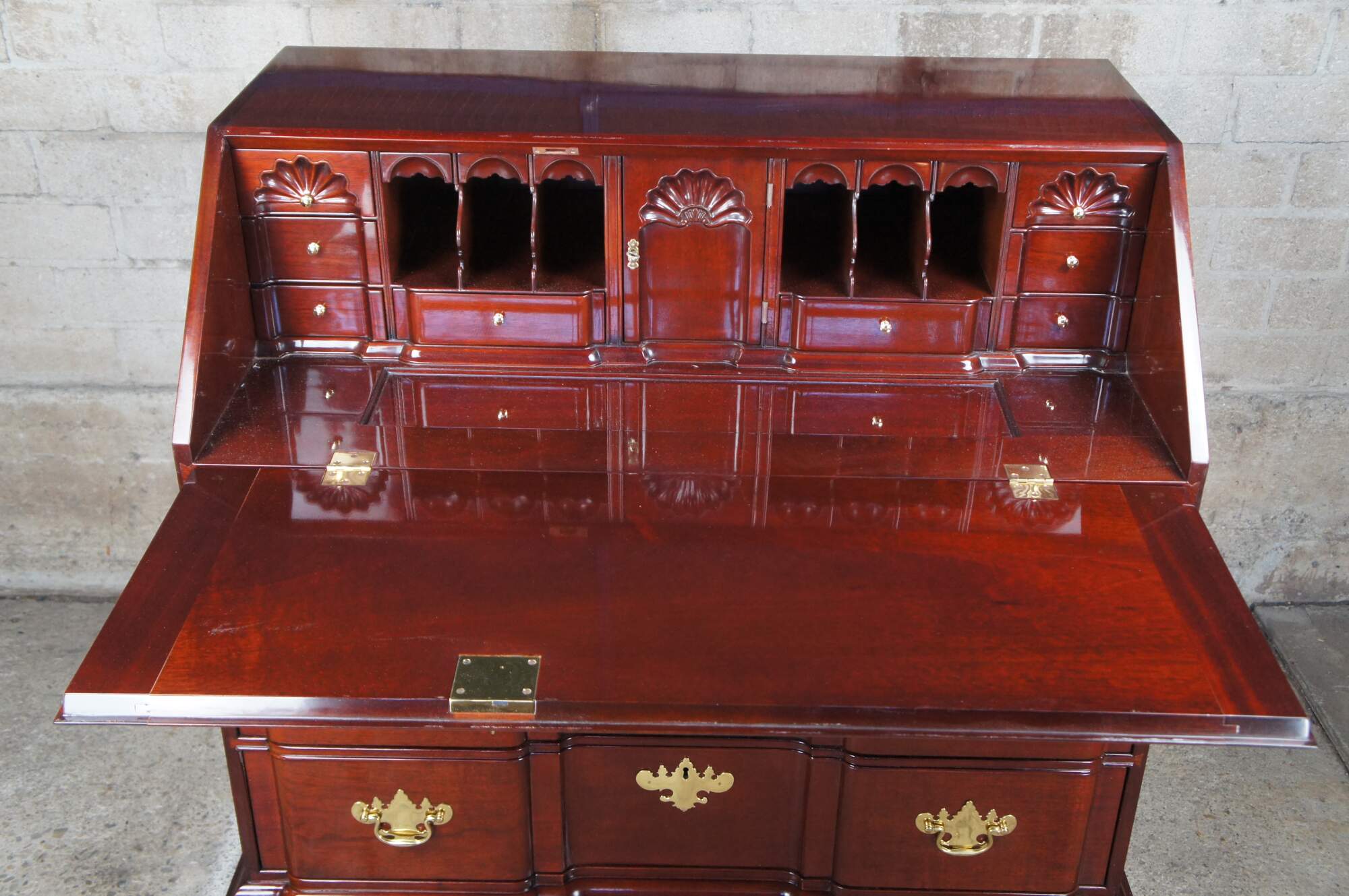 Kindel Winterthur Collection Mahogany Goddard Townsend Blockfront Secretary Writing Desk. Made from mahogany with a high sheen finish. This exception example of a late 18th century piece features an ornately scalloped slant front over three graduated dovetailed drawers with solid brass batwing hardware. The dropfront opens to 17 additional drawers and pigeon holes. The secretary is supported by bracket feet.