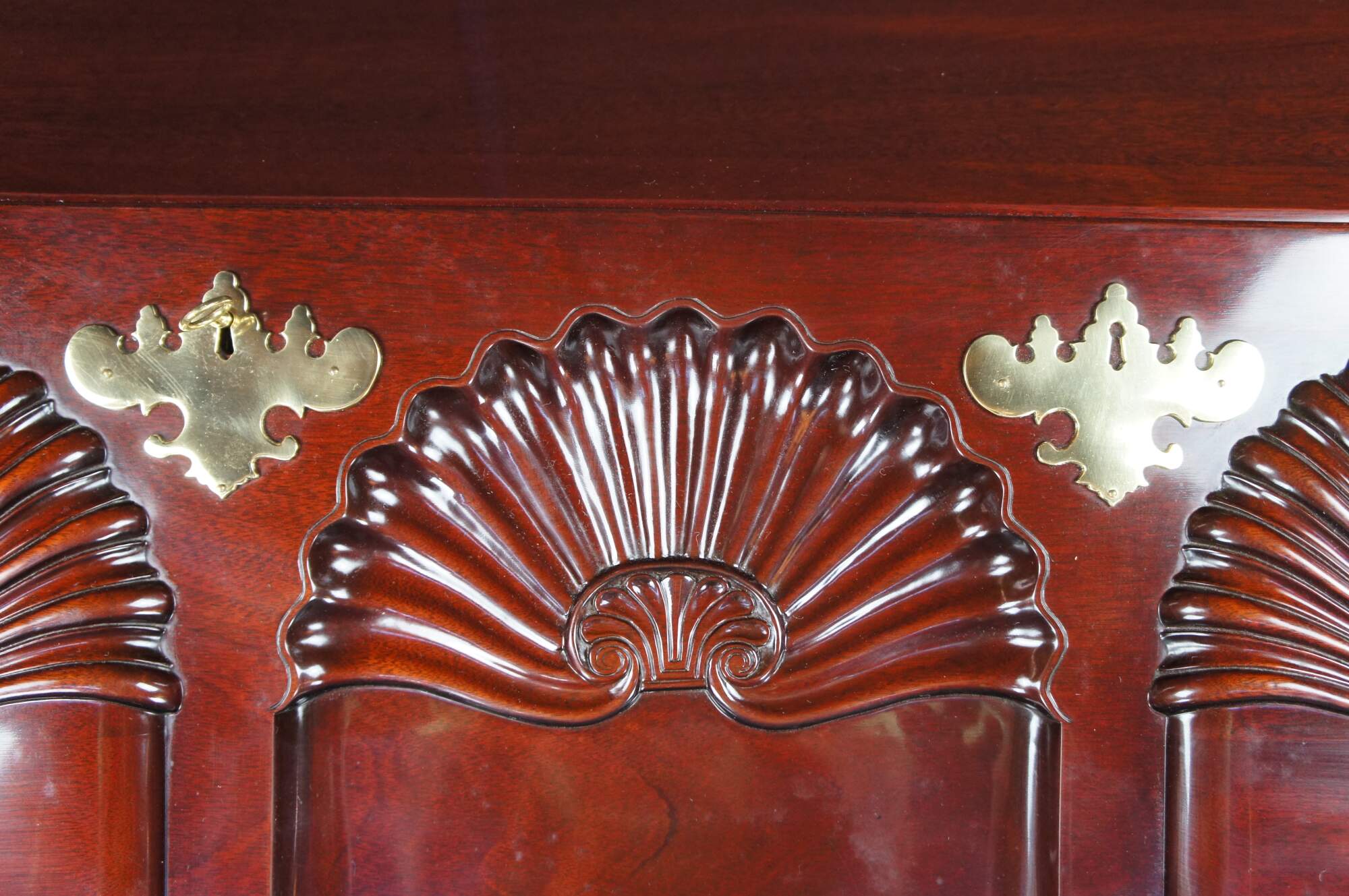 The original of this Mahogany desk and bookcase, made for the Updyke family in the 1770s, is one of ten block-fronted examples crafted by members of the Townsend and Goddard families of Kingston and Newport, Rhode Island. Block fronting, or the raised-recessed-raised triad of panels with the shell as an integral part of each, is considered to be uniquely American. The last one remaining in private hands was sold at Christie’s on June 3, 1989 for $12.1 million, a world record-breaking price. The hand carving represents 37 hours by meticulous Kindel artisans to achieve the beautiful and precise look of the original.