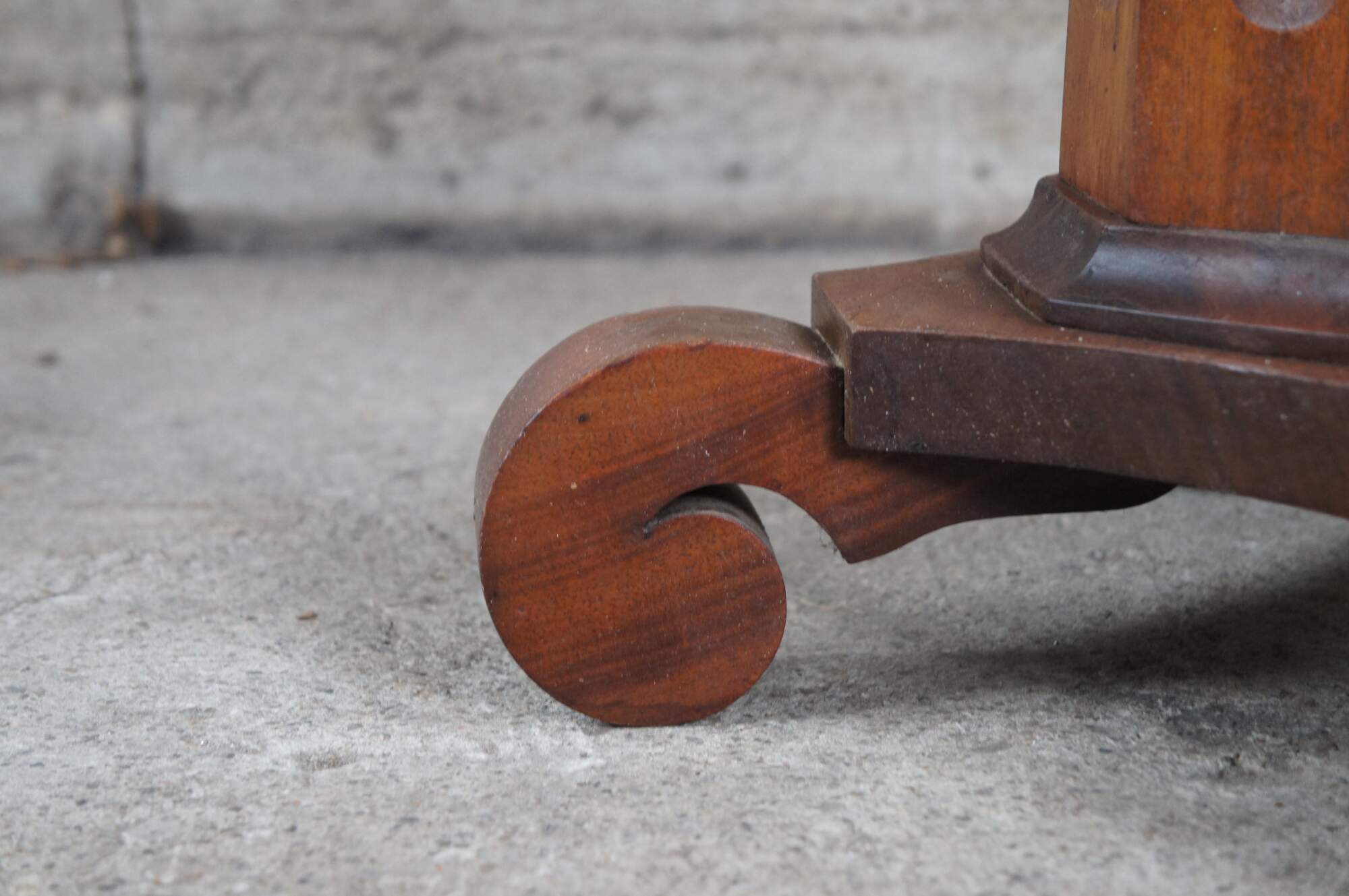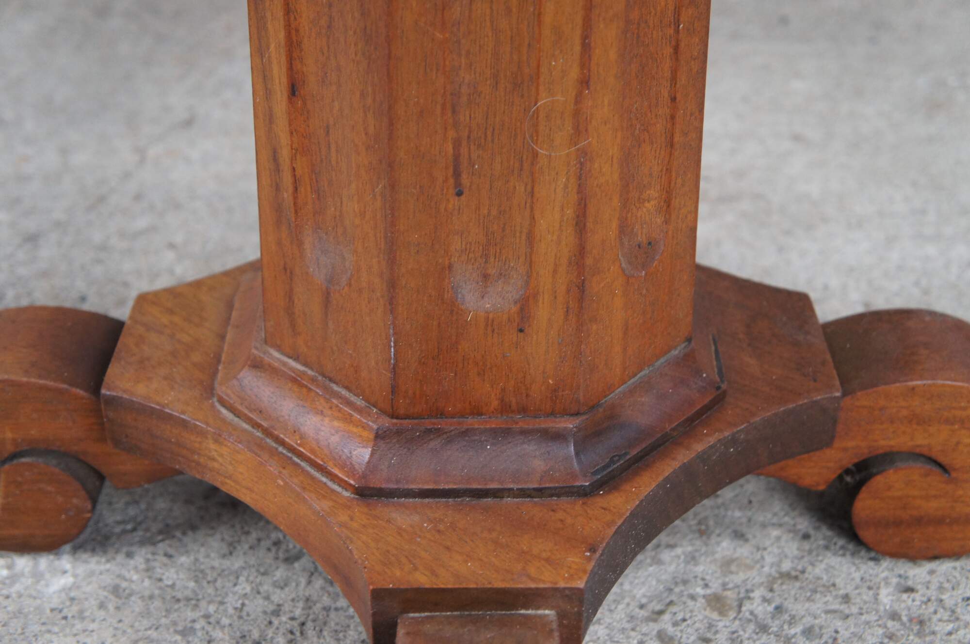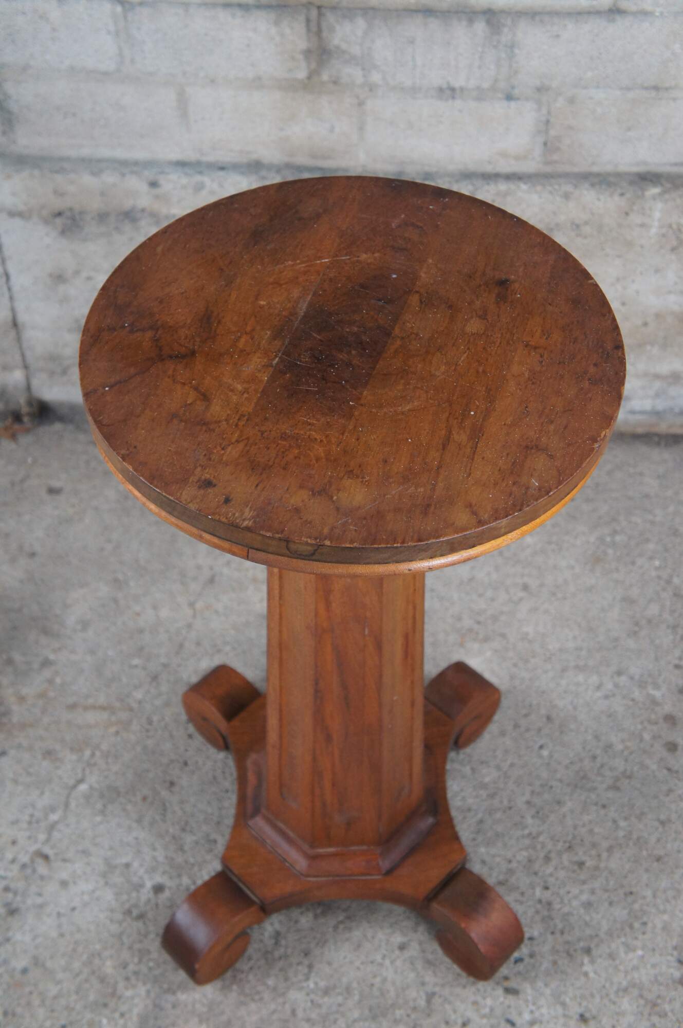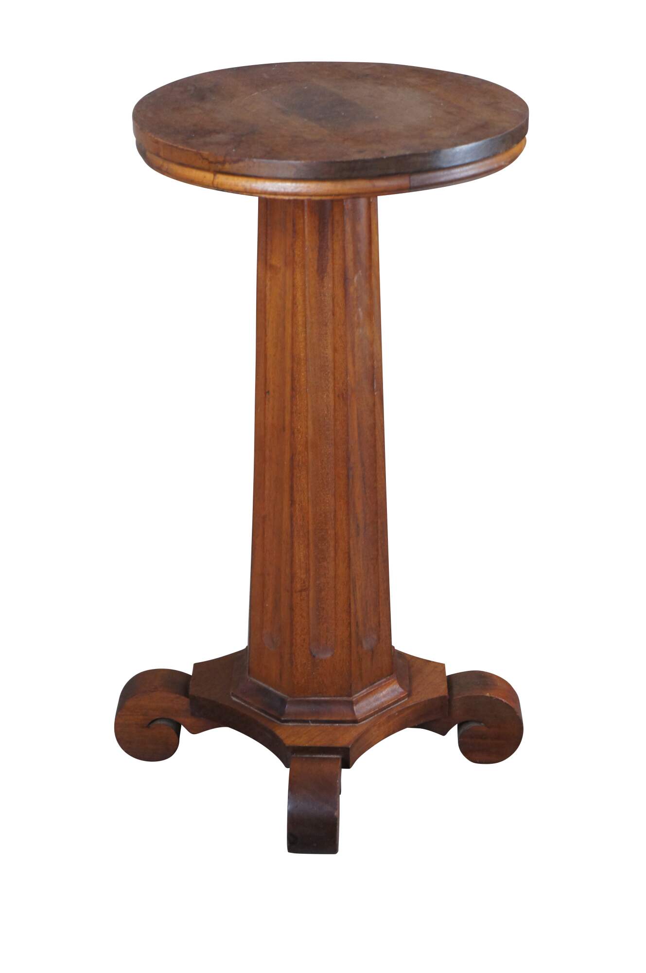 An antique 19th century American Classical / Empire pedestal table or sculpture / candle stand. Made from solid mahogany with a round top over fluted octagonal column graduating towards a "C" scrolled base. Circa 1860s.