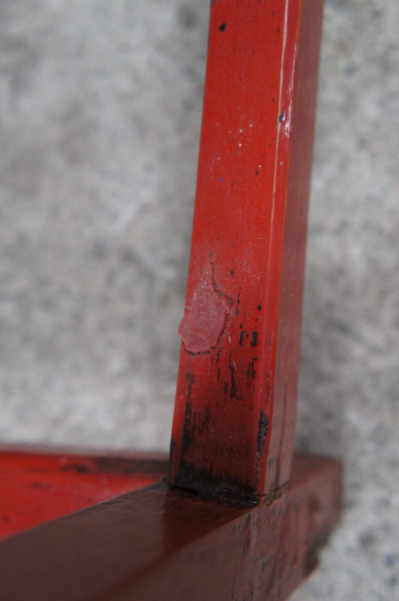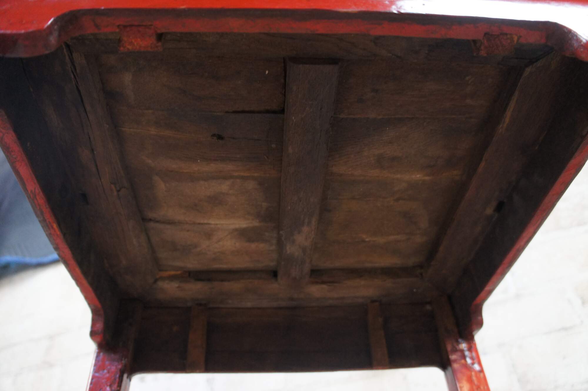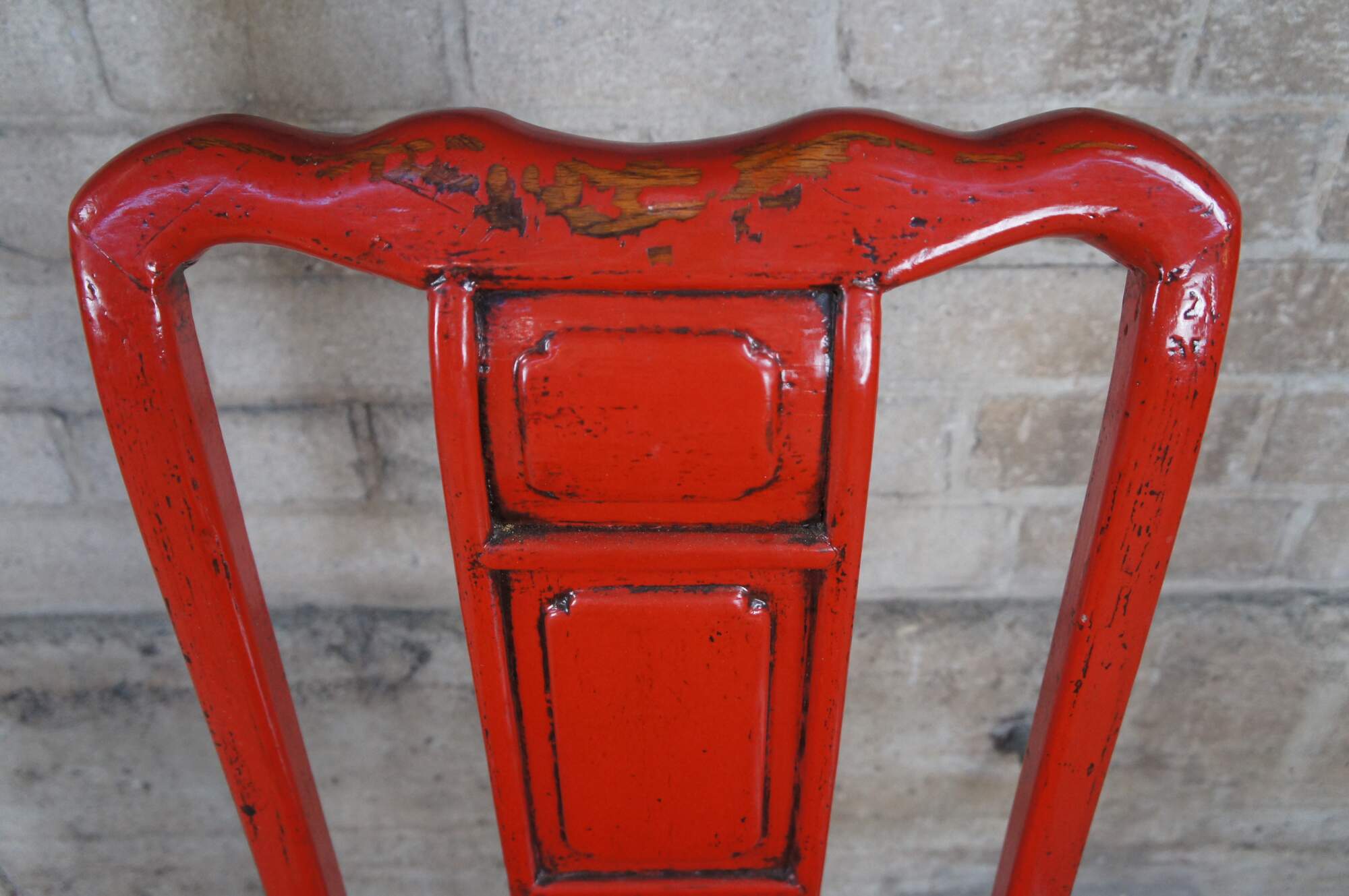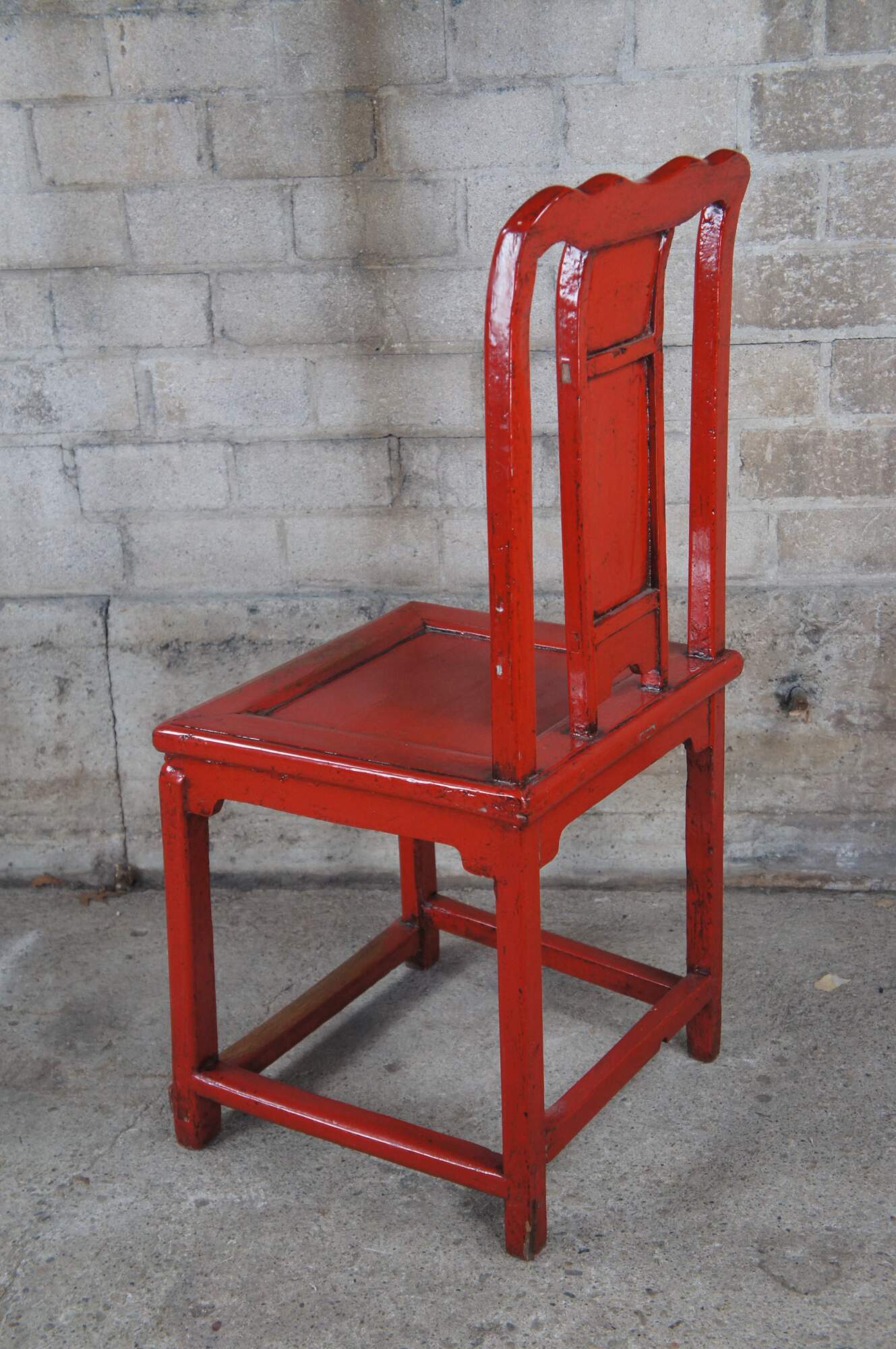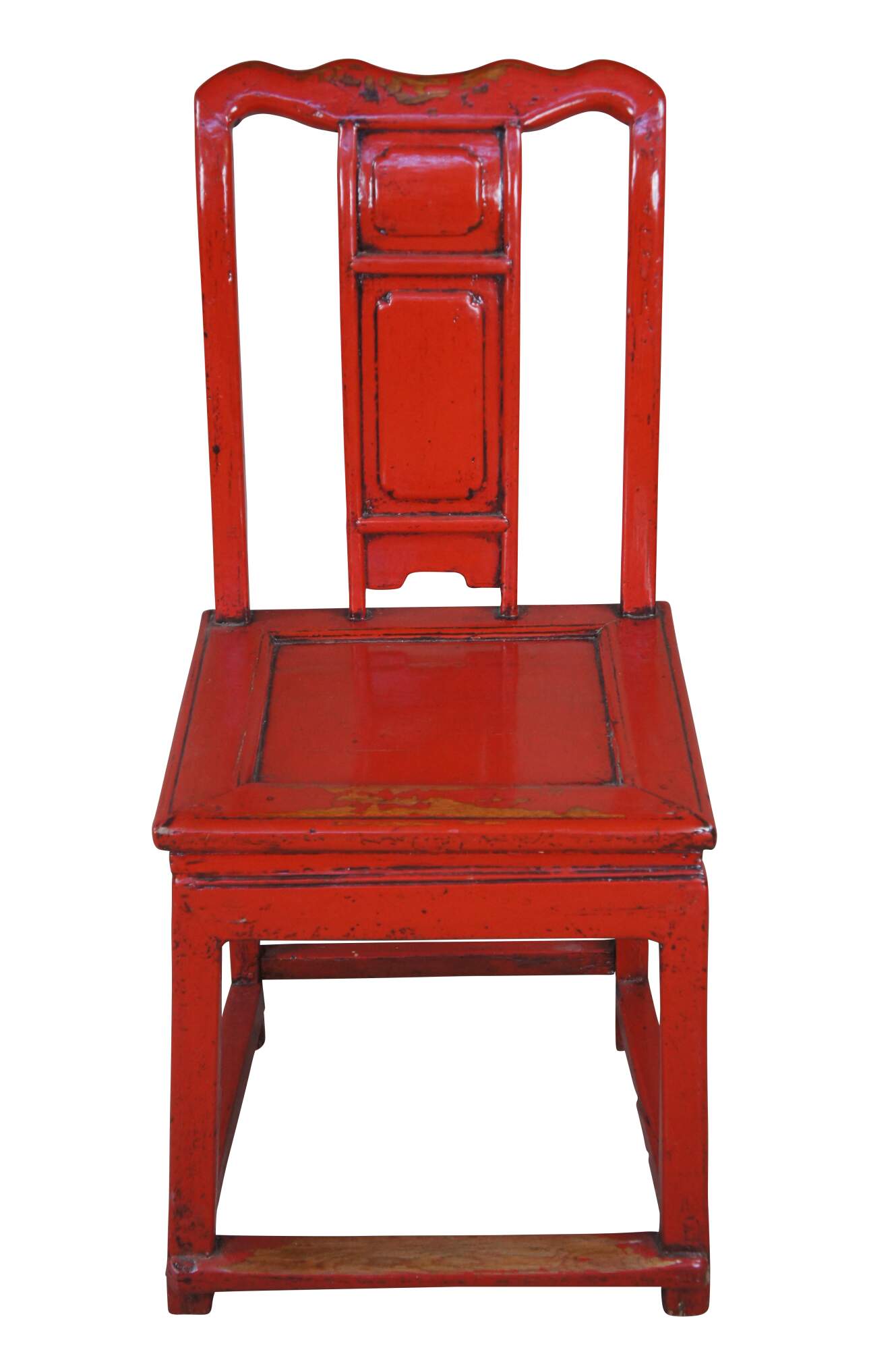 Antique Qing dynasty red lacquer side chair. Made from elm with angled back, panelled accents and distressed accents.