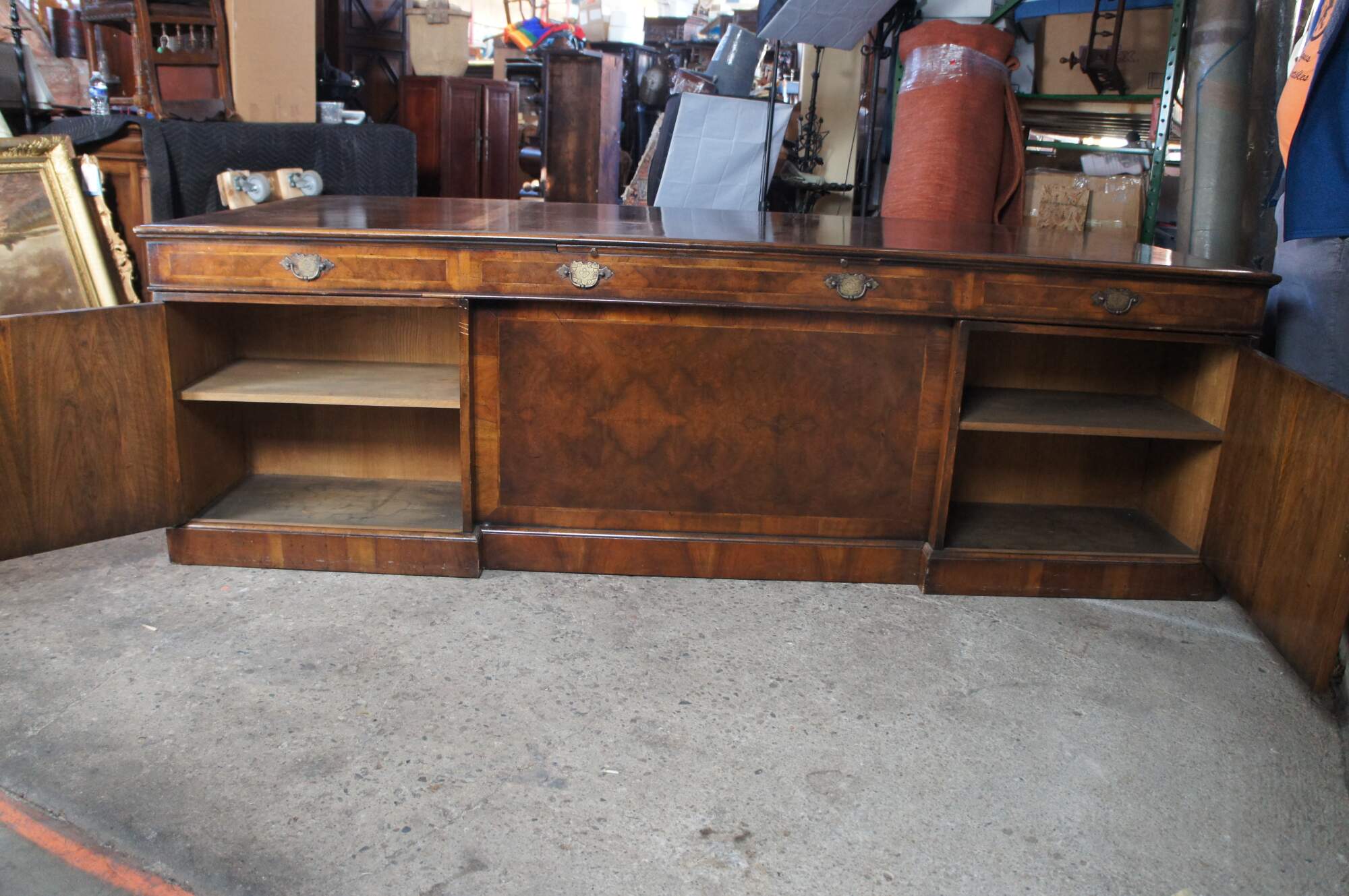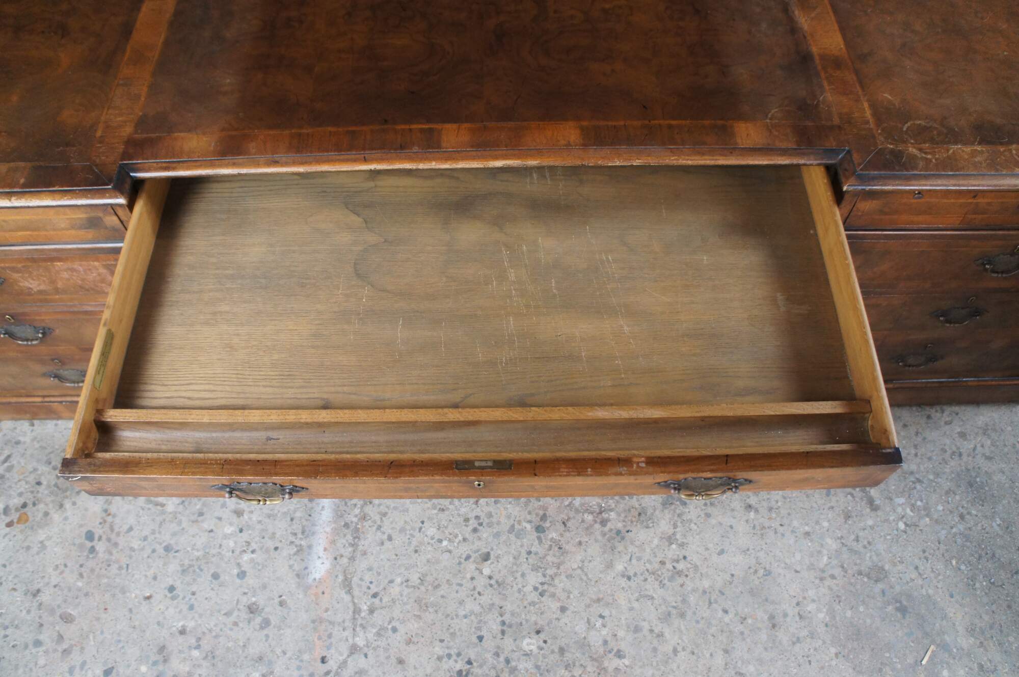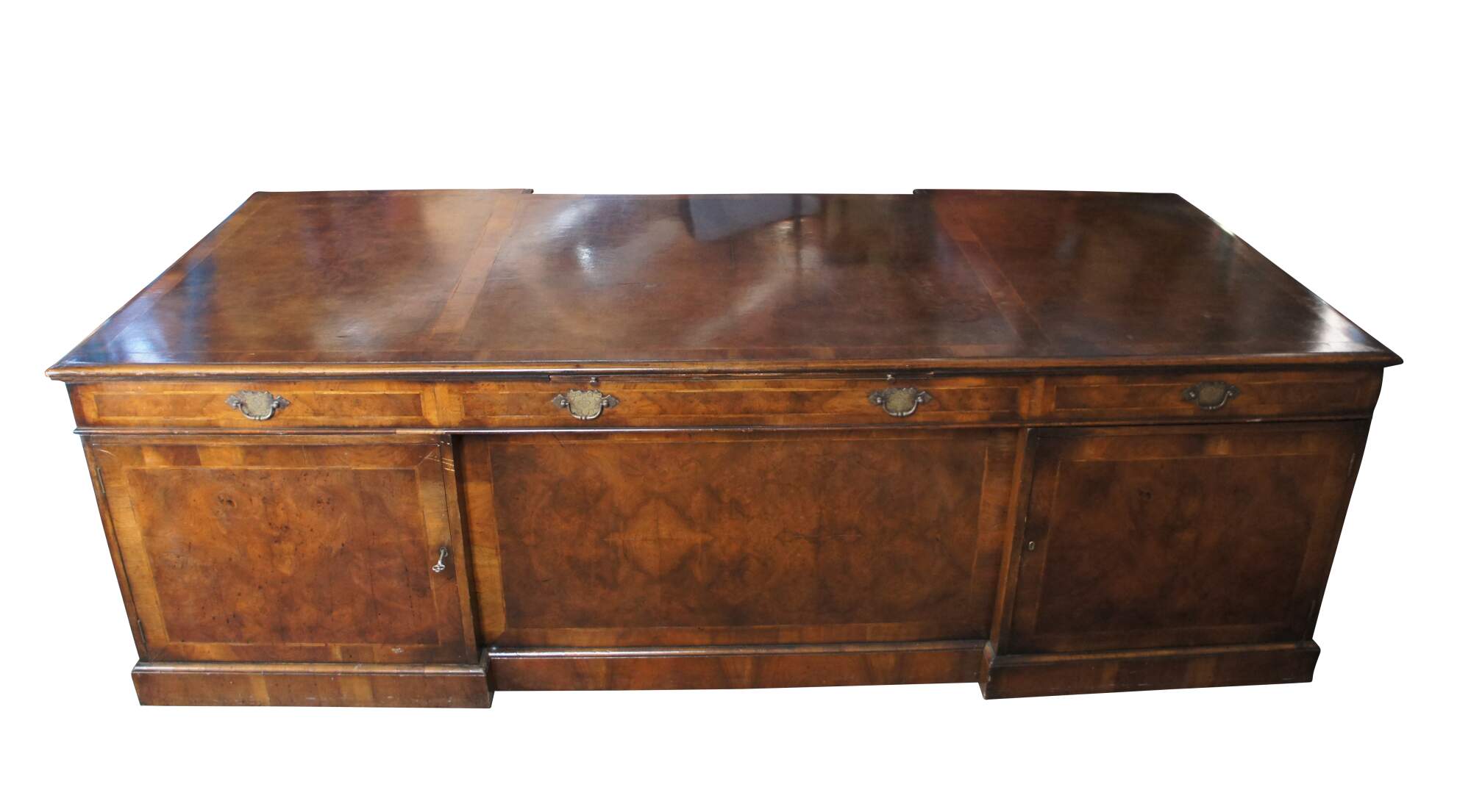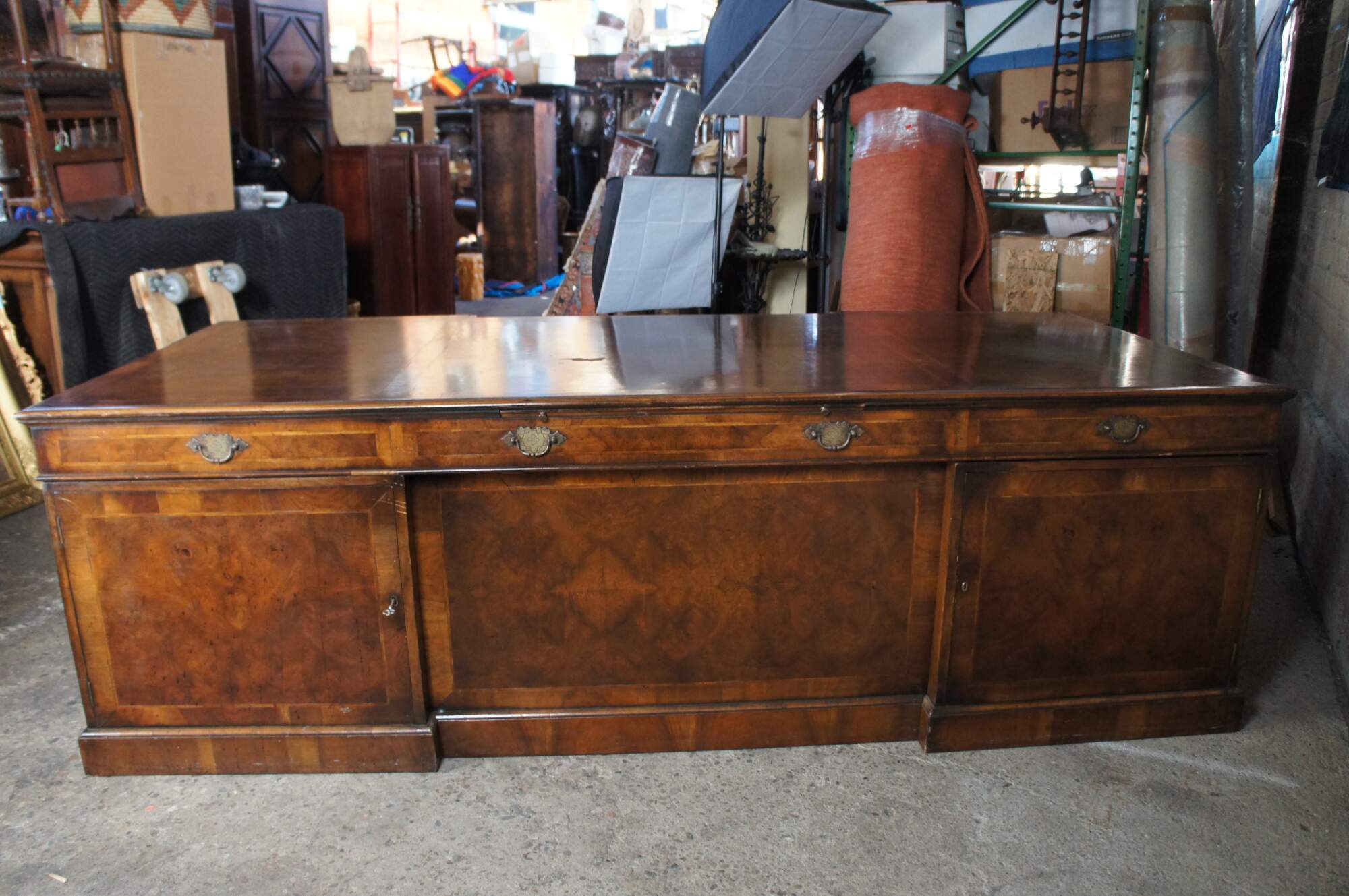 A custom order Monumental Late 20th Century Smith and Watson Burl Walnut Executive Pedestal Desk from the Executive Collection, Ref: F-011 Copied from a fine Georgian original. Matched panels of Burl Walnut, Herringbone inlay and crossbanding. Fitted with English locks and brassware, pull-out slides and file drawer. Finish: antiqued and distressed for an authentic look of age. Features nine dovetailed drawers along the front and blind bookcase cabinets along the front. A stately desk that will make a fine addition to any space.